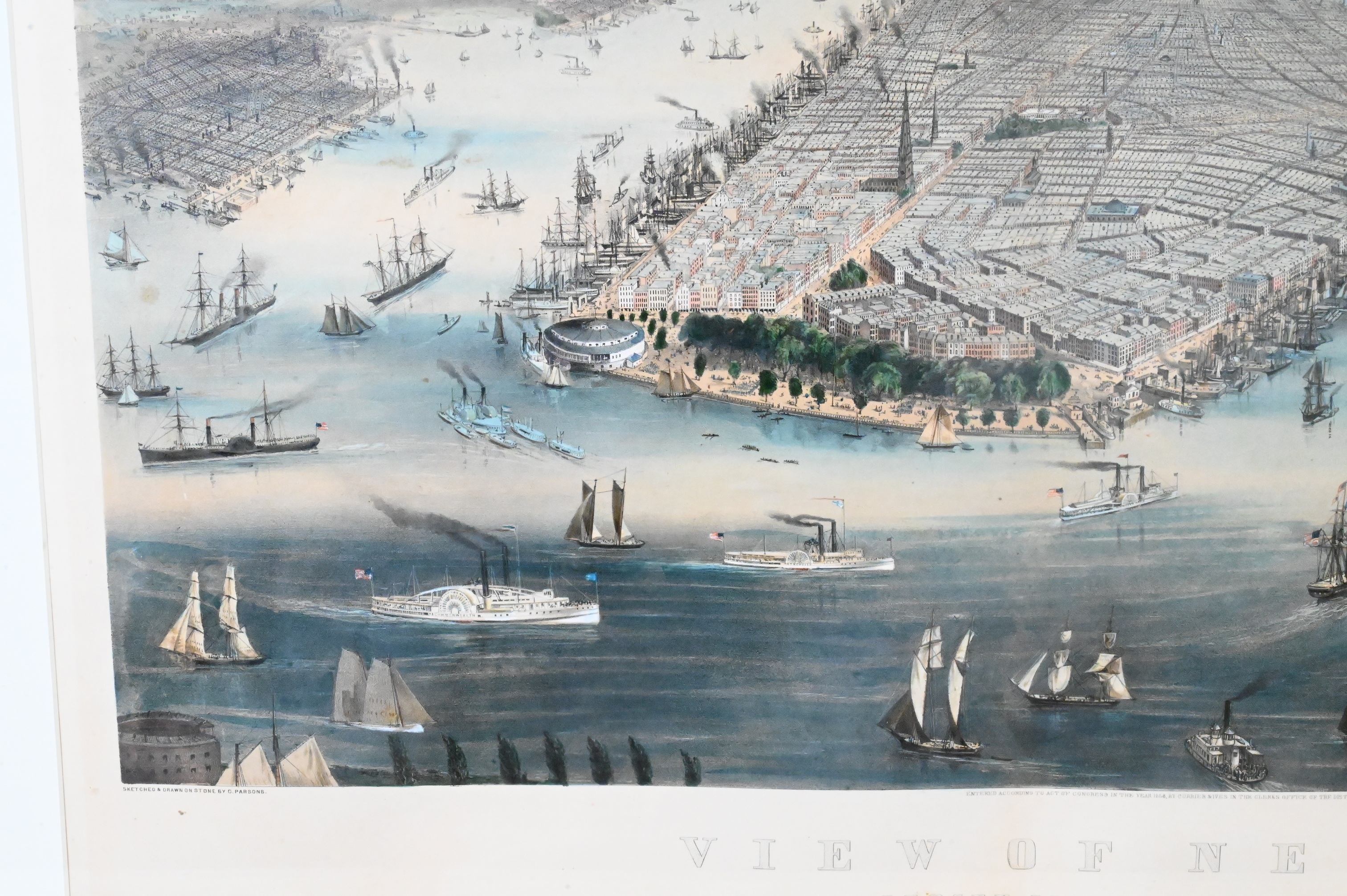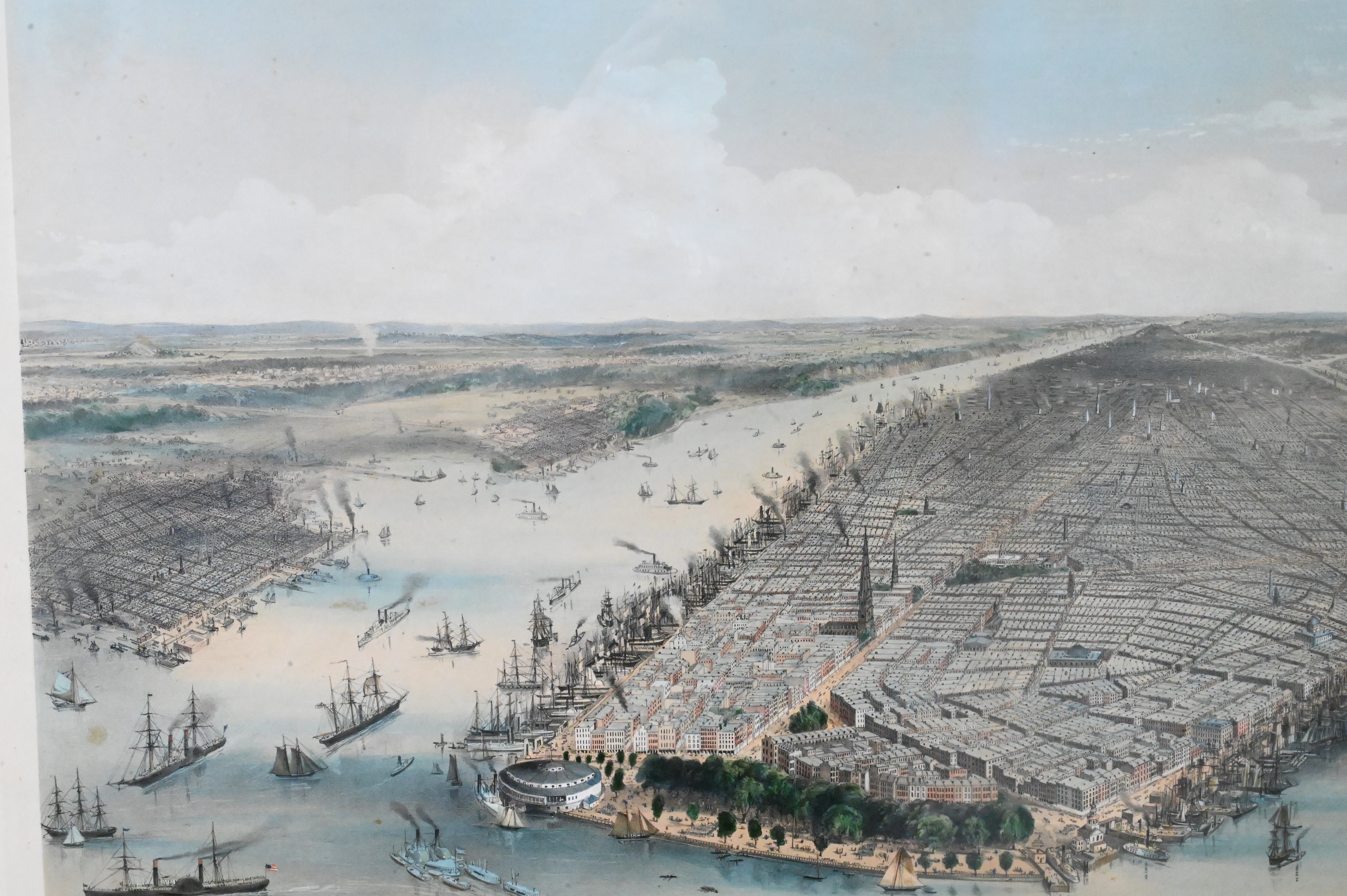 Large folio city view showing Manhattan from the south, with the Battery in the foreground, the Hudson and East Rivers filled with sailing vessels and steamships, and Jersey City, Hoboken, and Brooklyn beyond. One of the firm’s most iconic 19th-century panoramas of New York, combining topographical accuracy with a celebratory vision of the city.