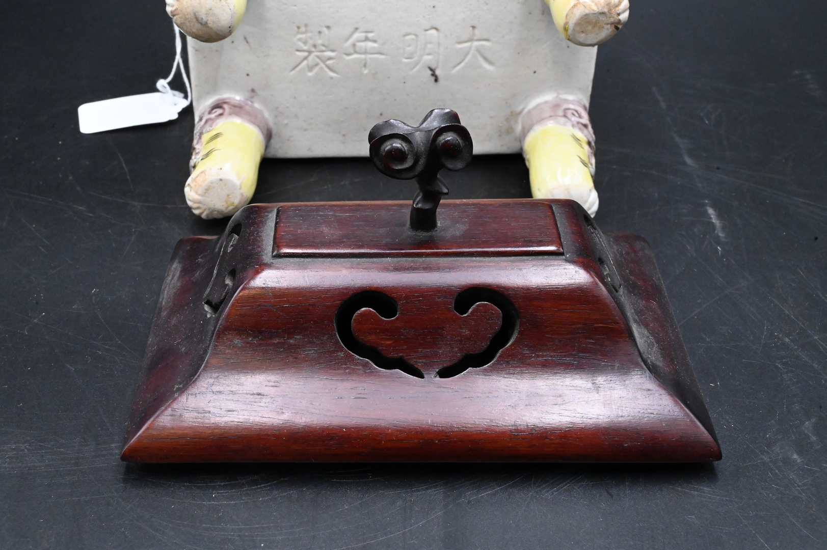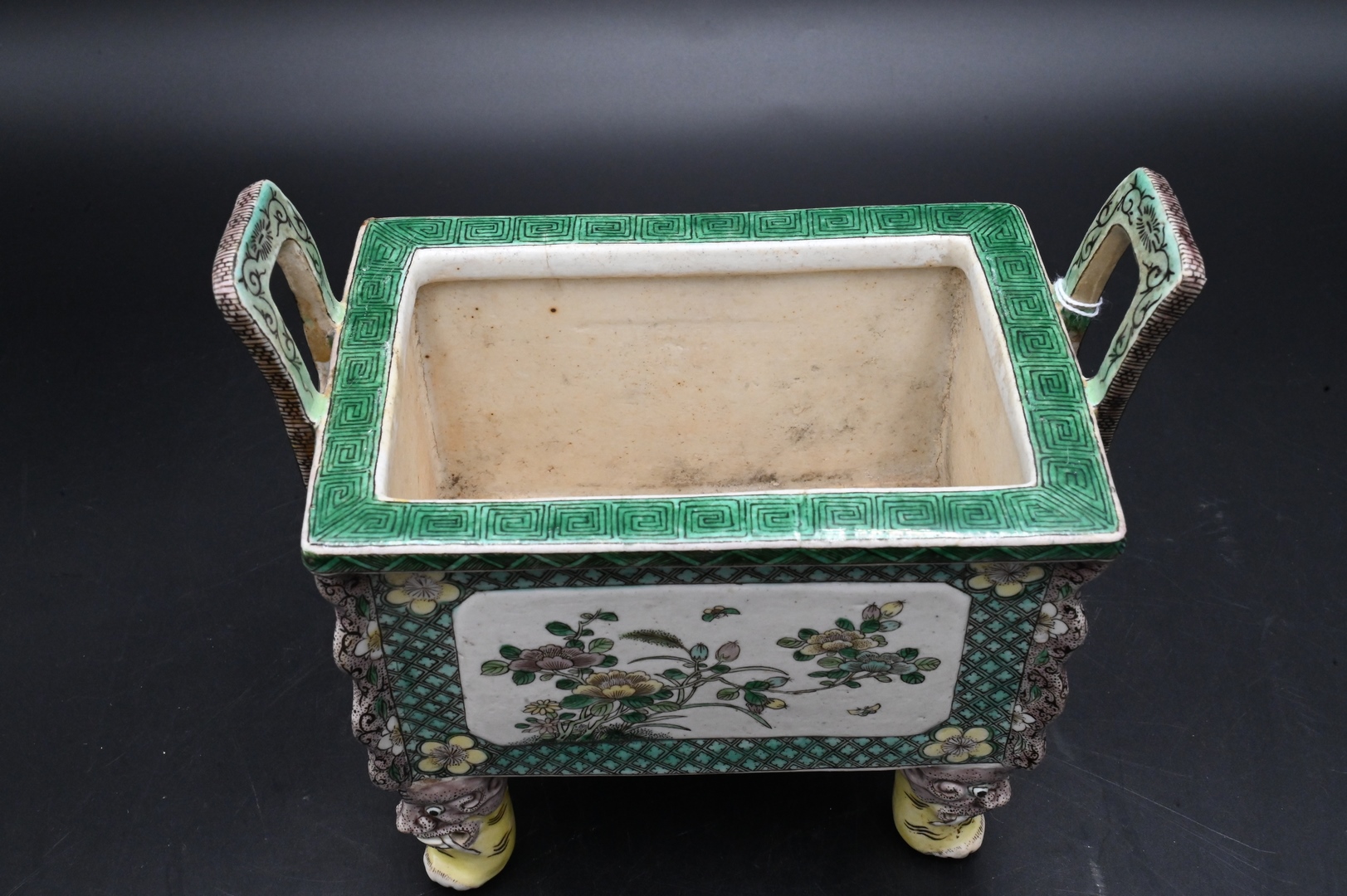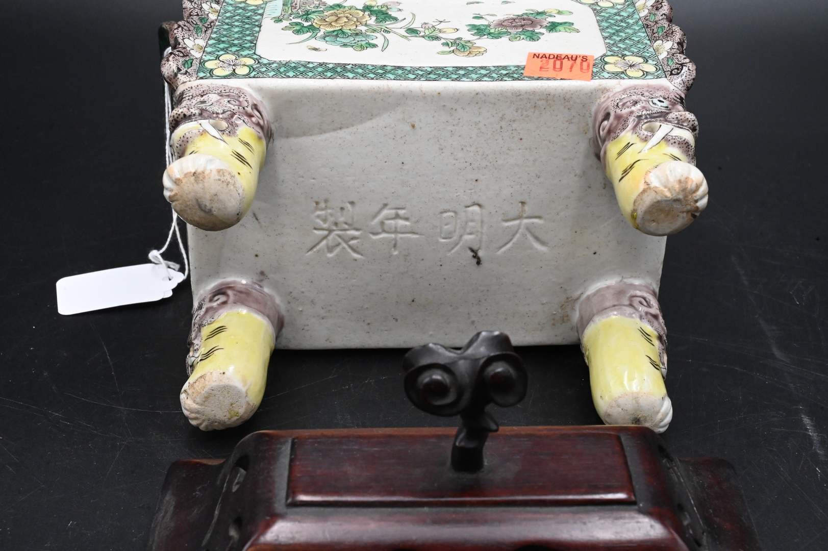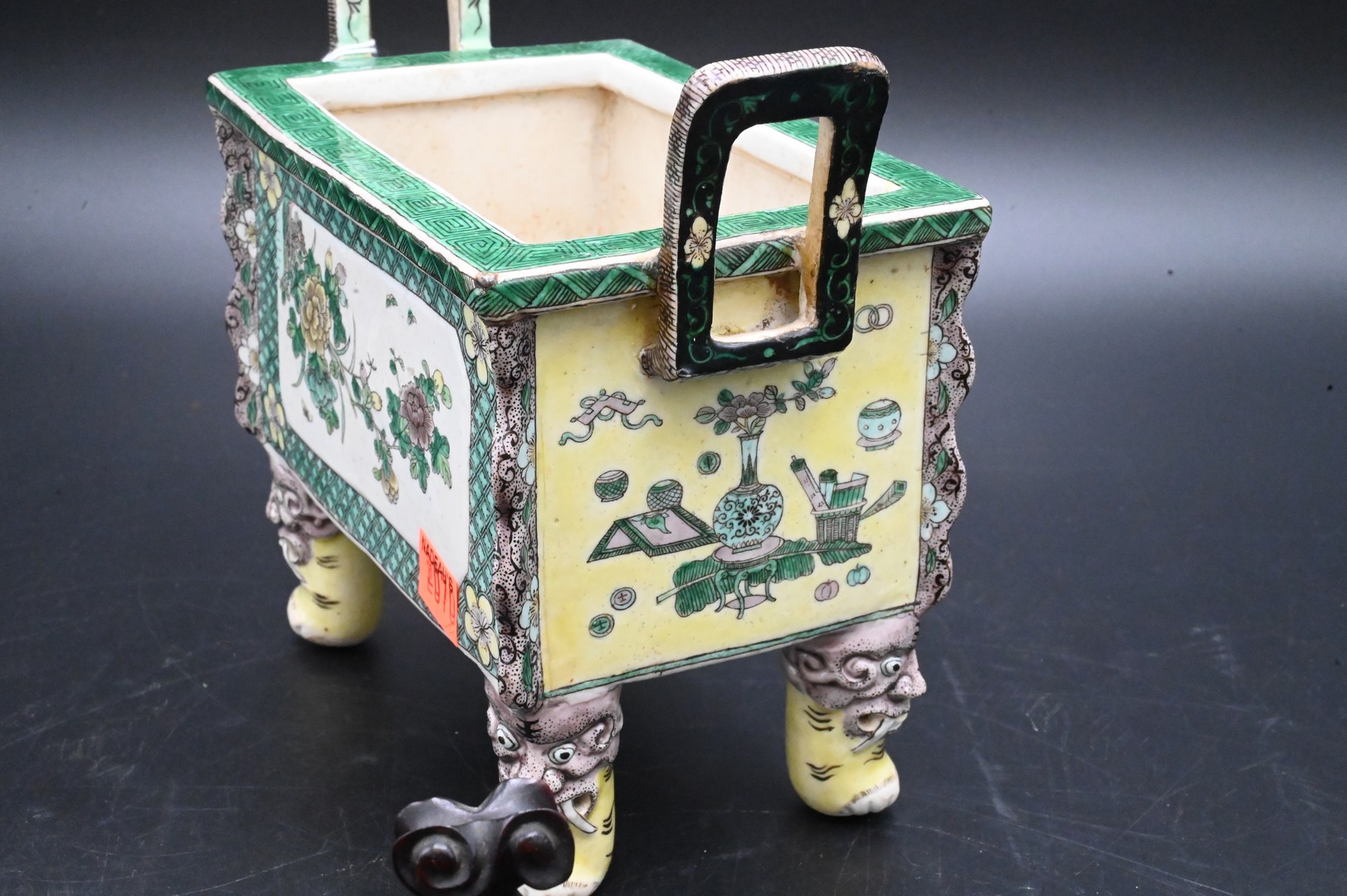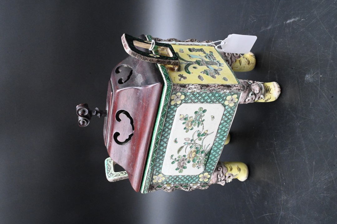 Famille Verte Porcelain Fang Ding, China, Kangxi 18th century or later, four-legged vessel in the shape of classic archaic bronze, characteristically decorated with central cartouche of yellow and aubergine flowers surrounded by green diamond-shaped border, inside four-character spurious but reverential mark on base reading “ta Ming nien chih” (made in the reign of Ming), with custom open-work wooden top and carved fungus finial, height 5 3/4 inches, length 6 1/2 inches, Provenance: From Collection in Irvington, New York.