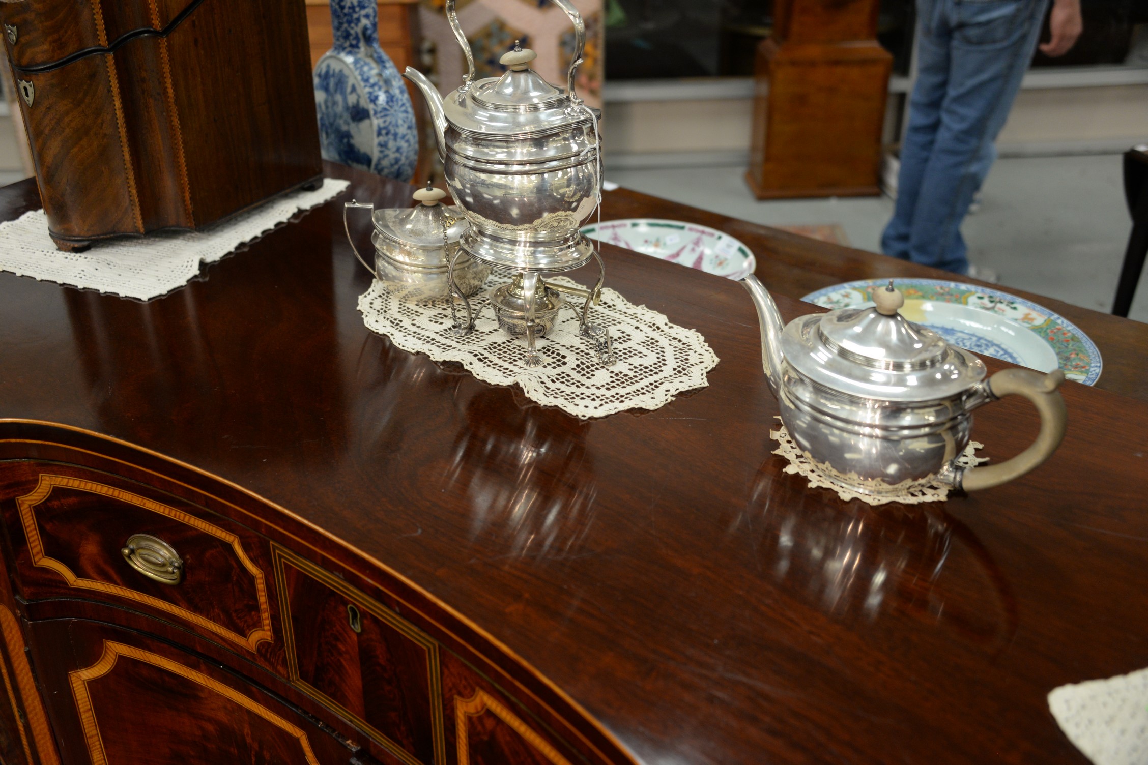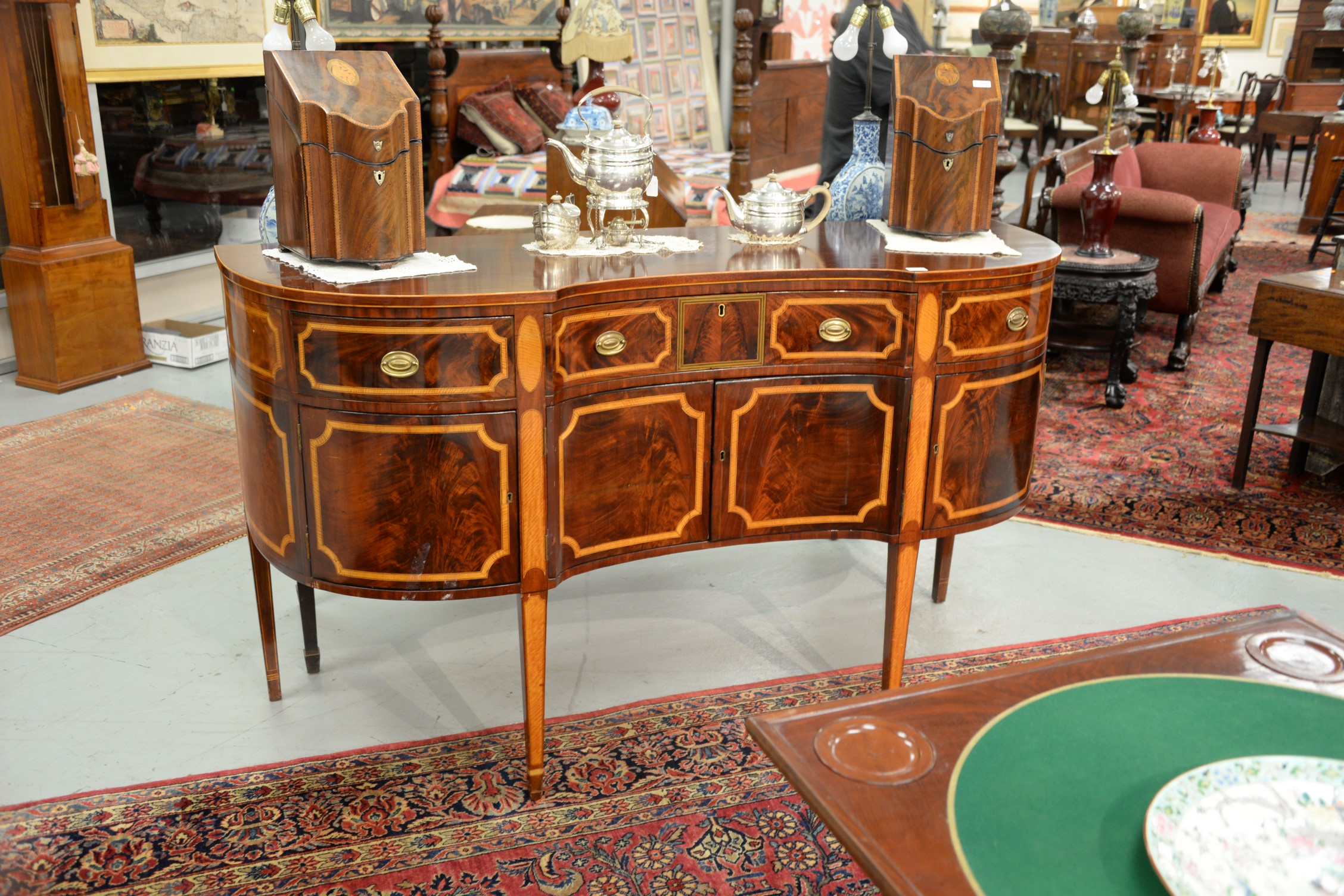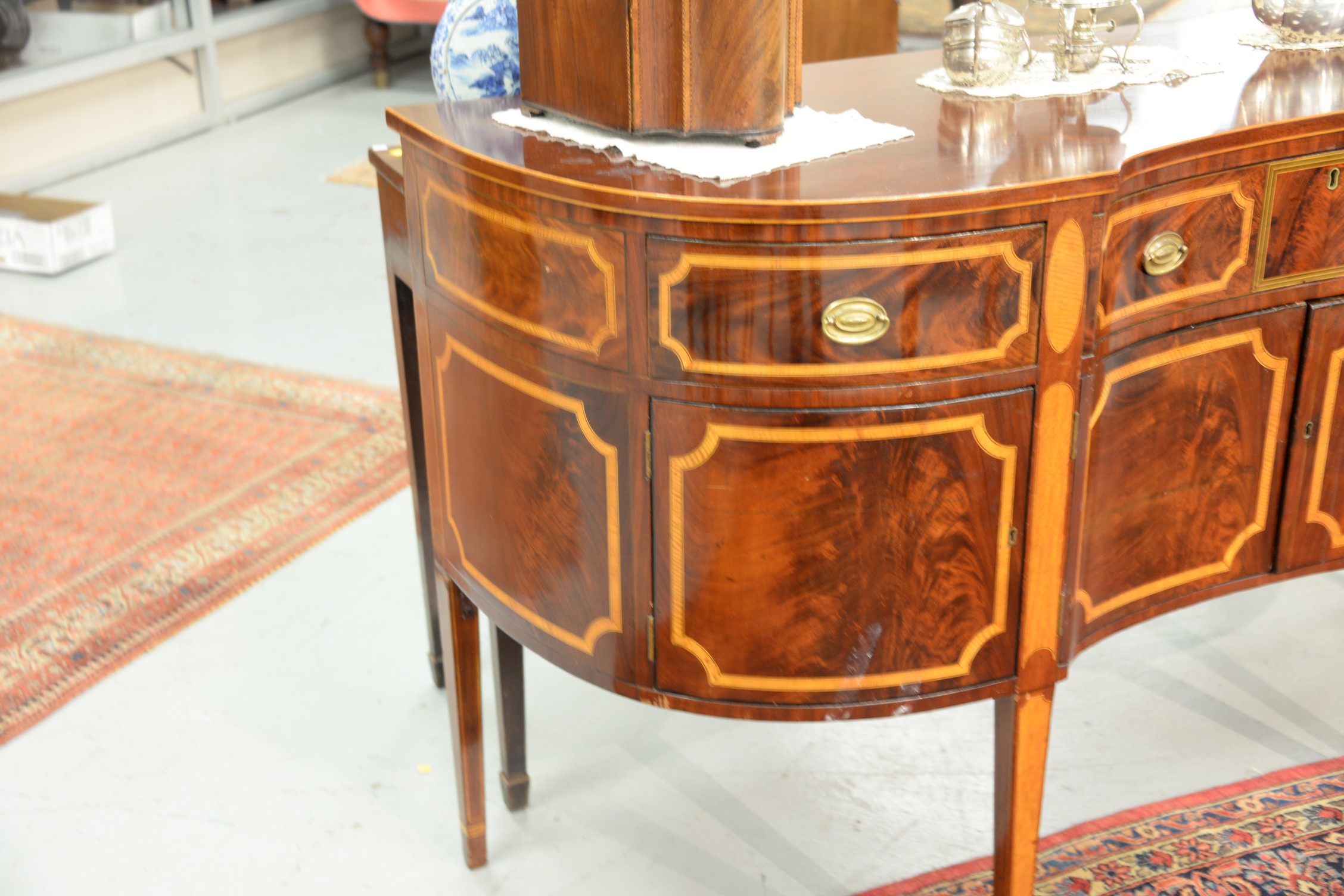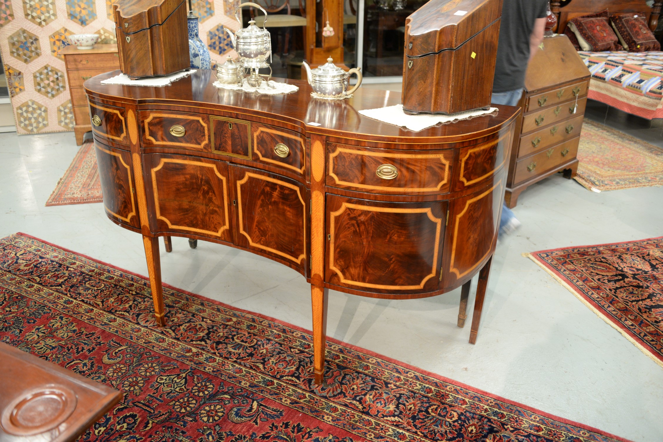 Lot 130: Federal mahogany sideboard having shaped top over conforming case with center drawer flanked by short drawers over four doors all se…