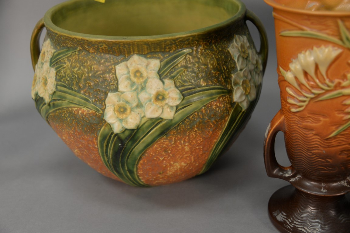 Four piece Roseville pottery lot including two small vases signed Roseville and two large pots unsigned. ht. 3in. to 9 1/2in. Provenance: Estate of Arthur C. Pinto, MD