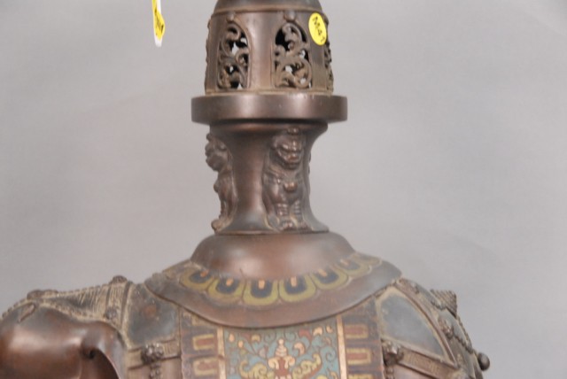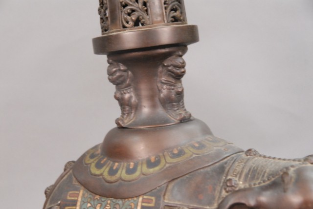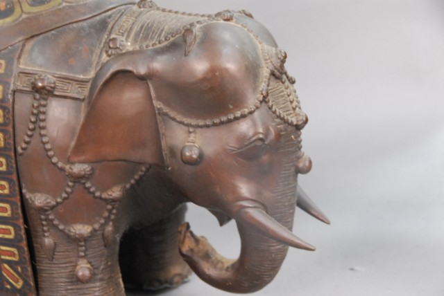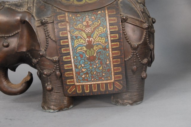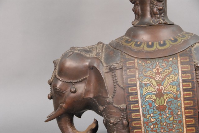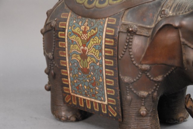 Large bronze champlev elephante incense burner ornately decorated elephante with champlev sides and seat.