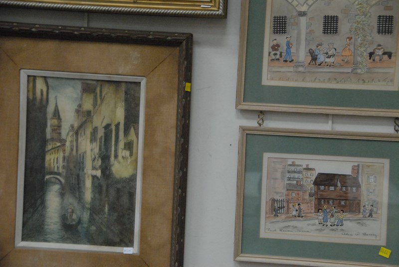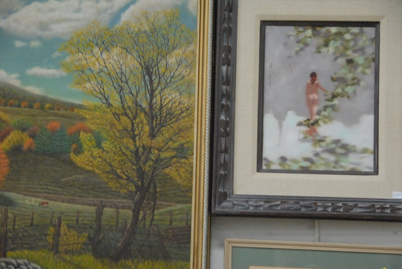 Seven framed items to include Taro Ogi late 20th Century pencil signed and numbered print, two Boston watercolors signed Bonney, a print of a canal, an oil on canvas nude signed C.L., and two paintings signed E.L. Verveer, 7 1/2 x 10 to 24 x 19 1/2.