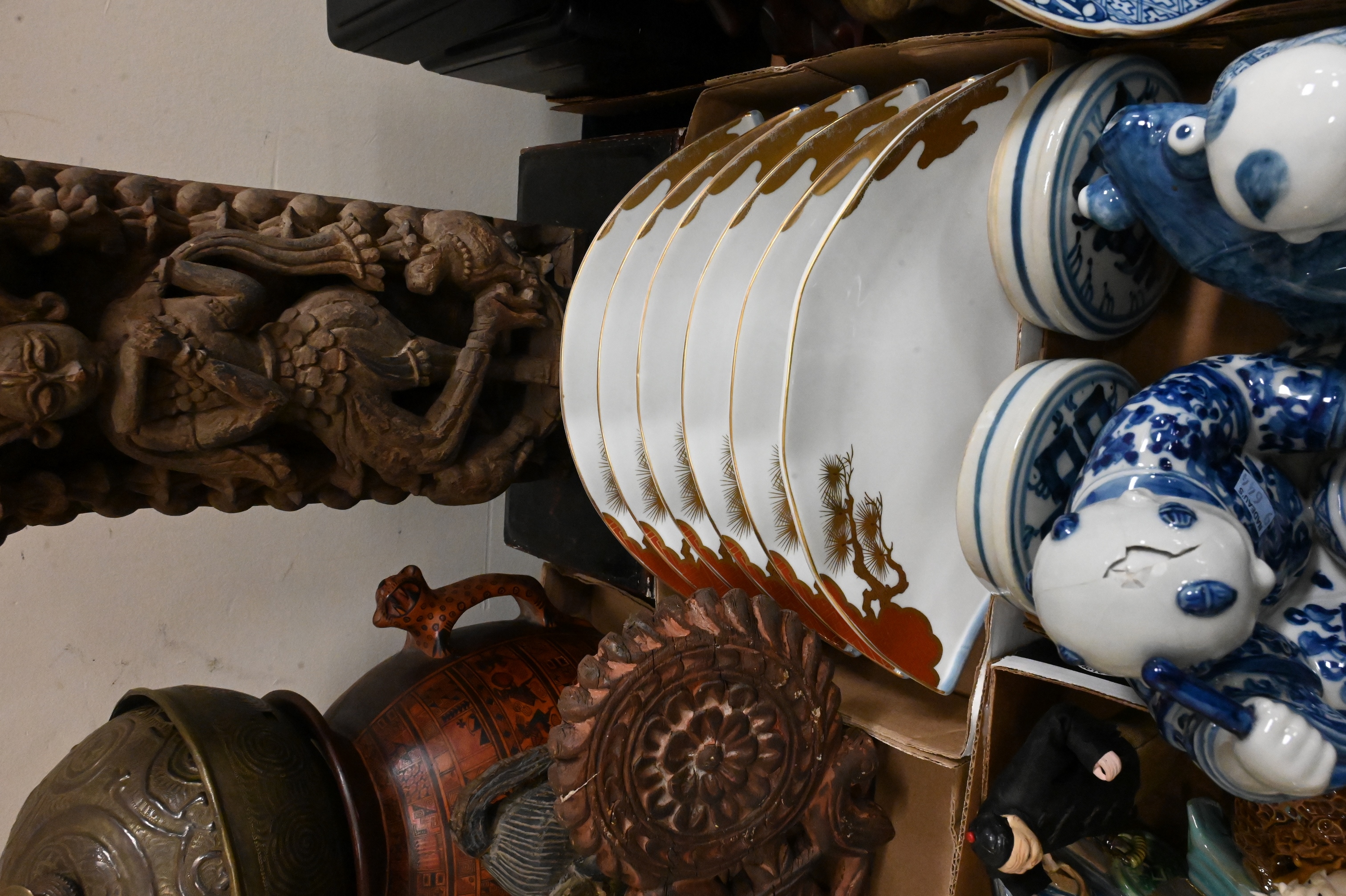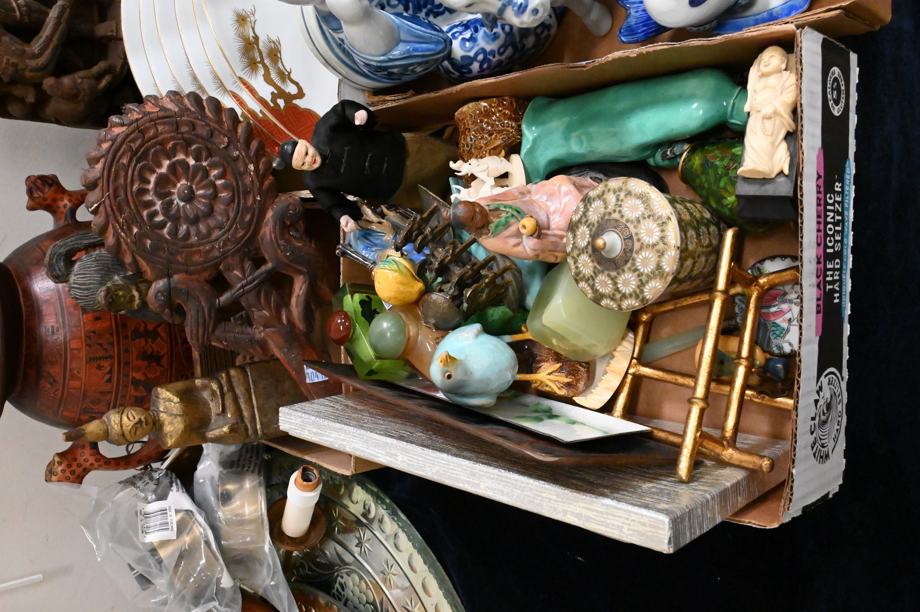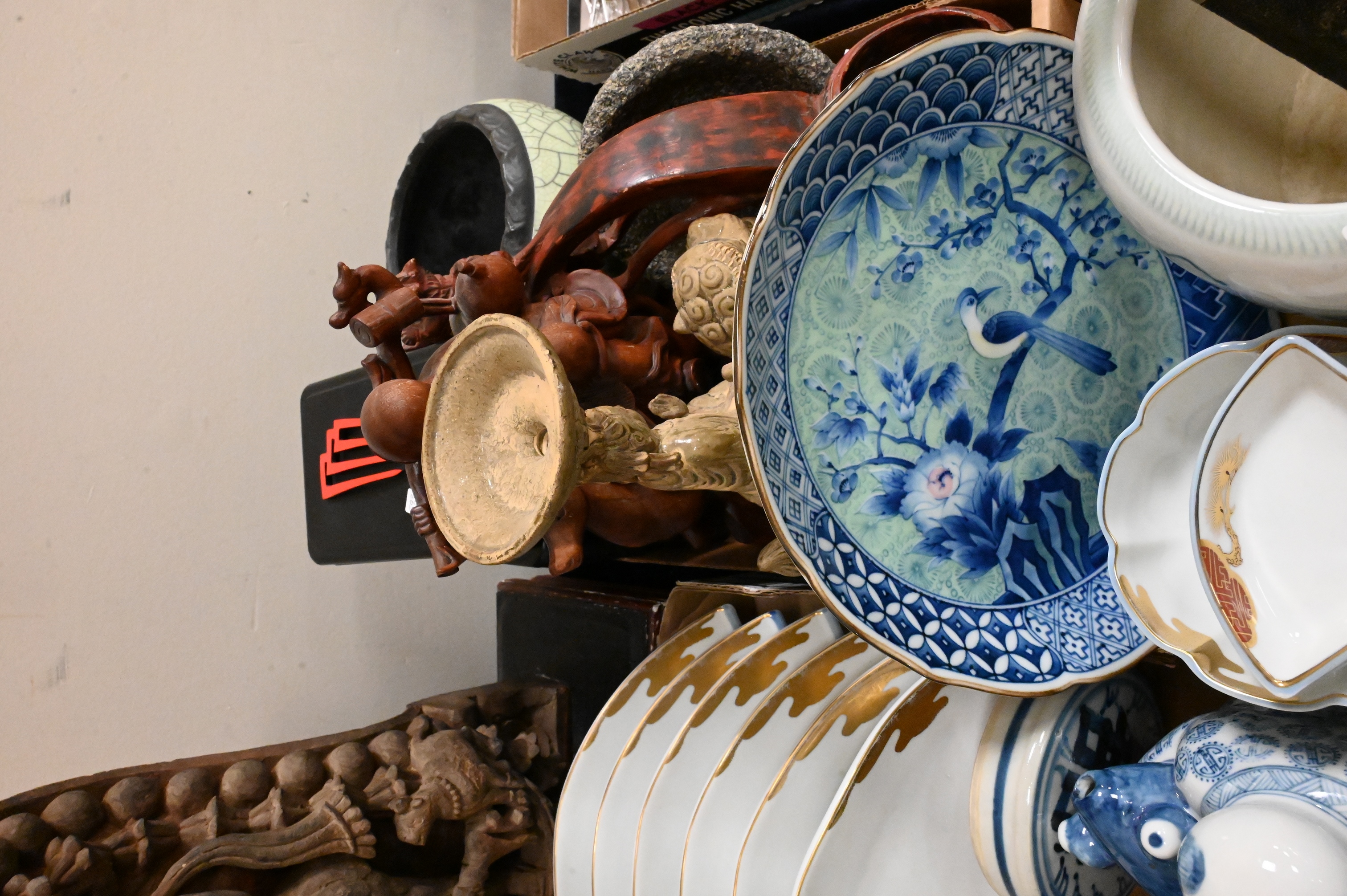 to include turquoise foo dogs and pigeons, Guanyin blue and white Buddhas, fish dishes, reverse painted snuff bottles, celadon figure, Thai carved temple fragments, small hardstone handled mirror with Geisha, Japanese gilt plates, etcetera