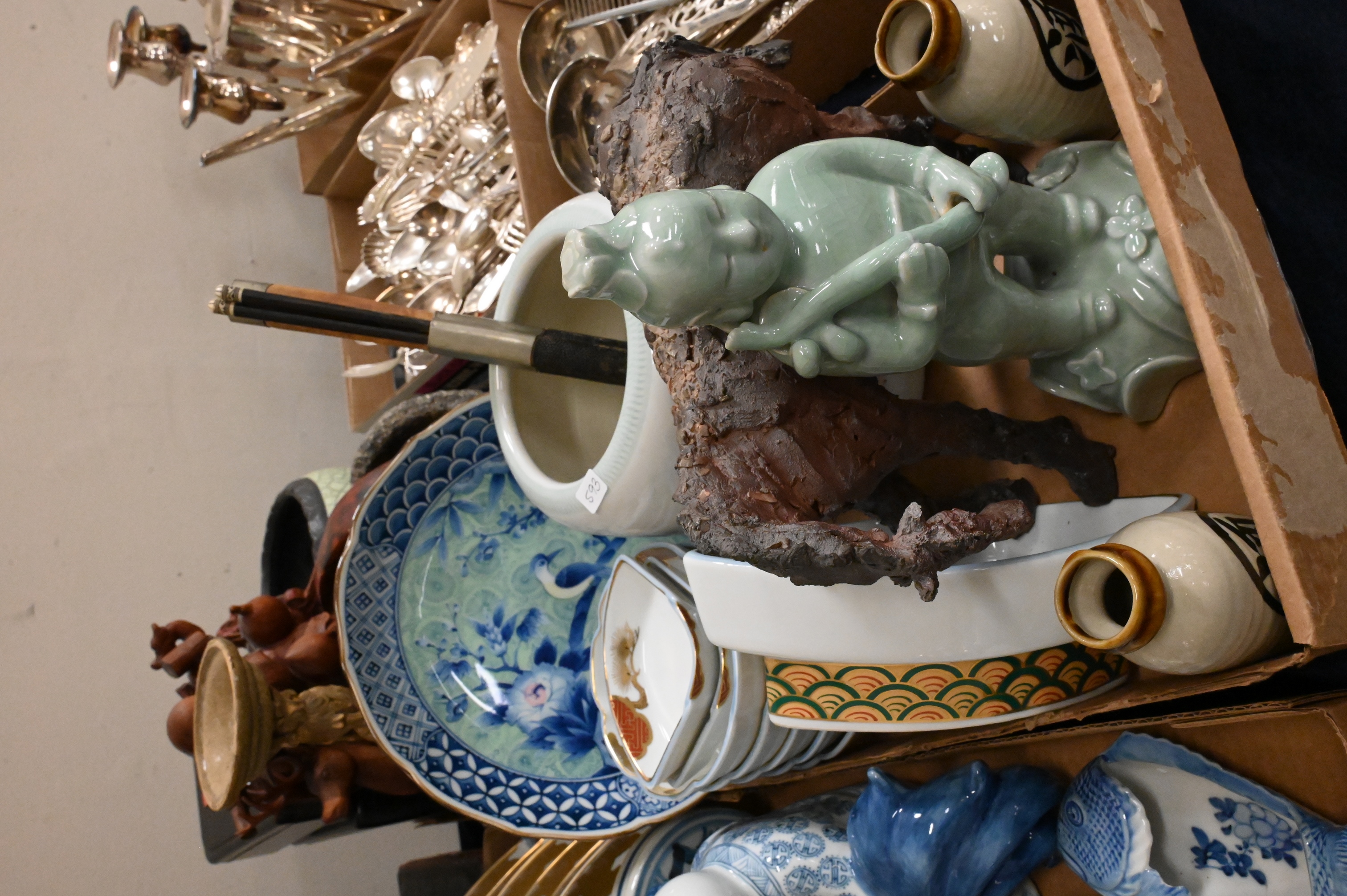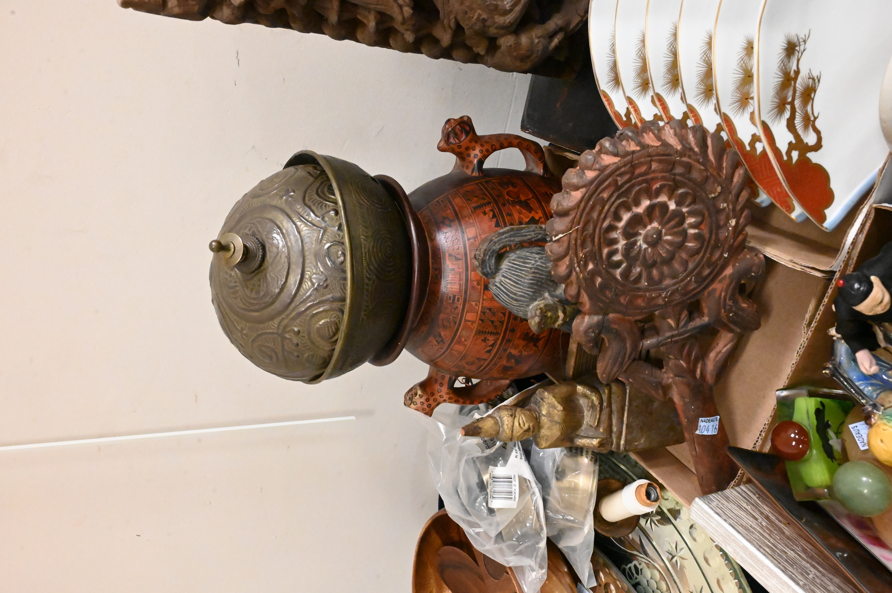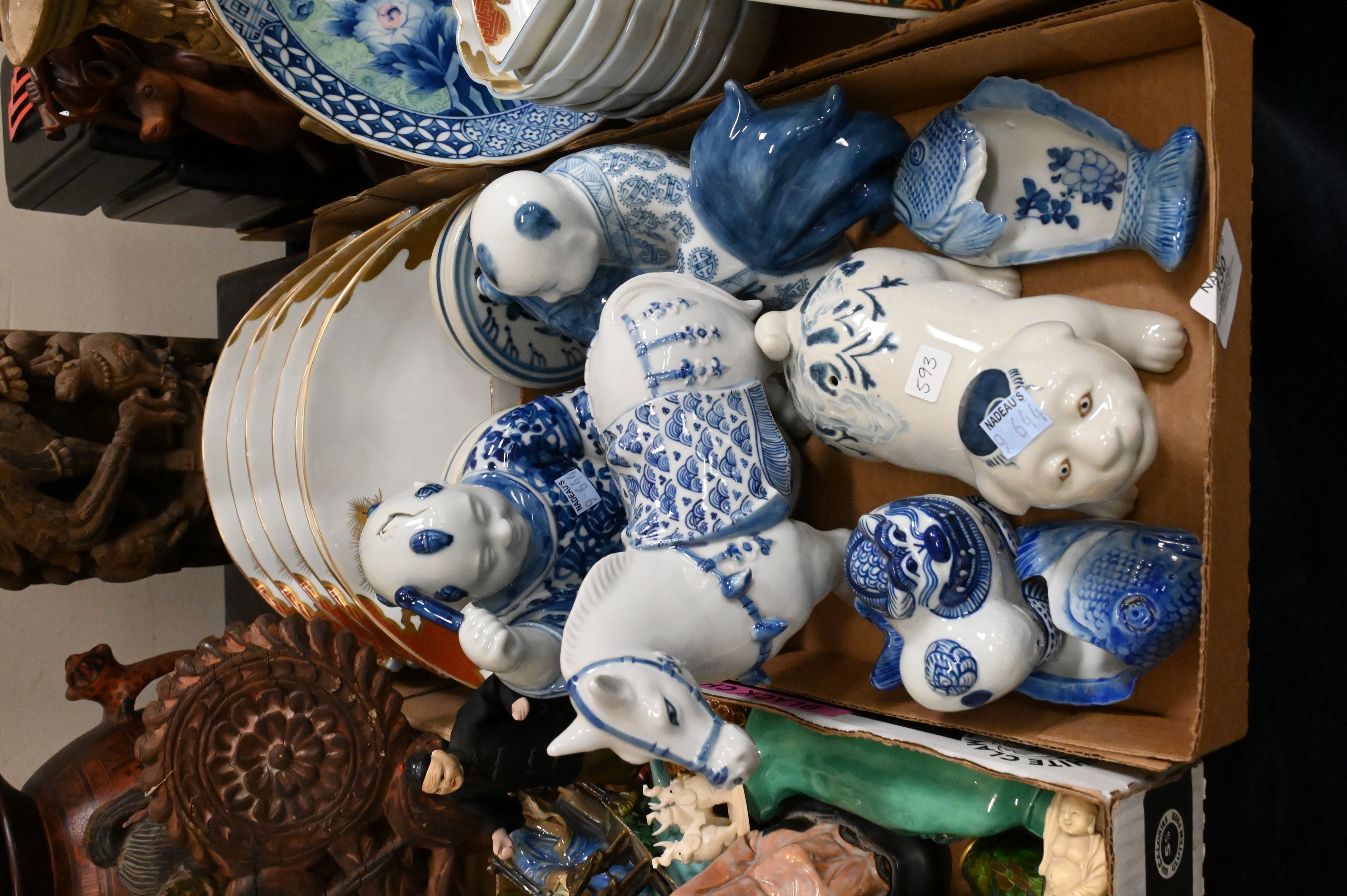 to include turquoise foo dogs and pigeons, Guanyin blue and white Buddhas, fish dishes, reverse painted snuff bottles, celadon figure, Thai carved temple fragments, small hardstone handled mirror with Geisha, Japanese gilt plates, etcetera