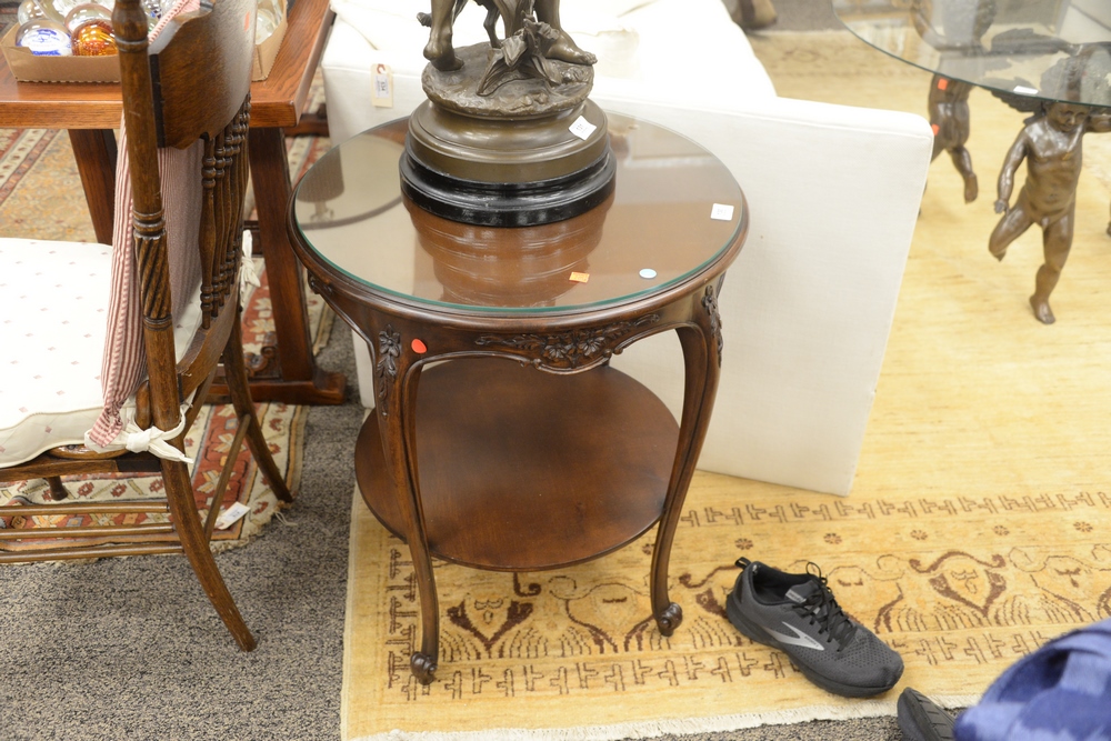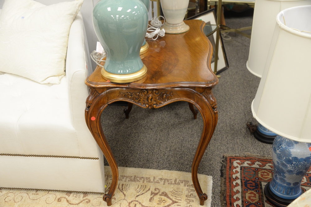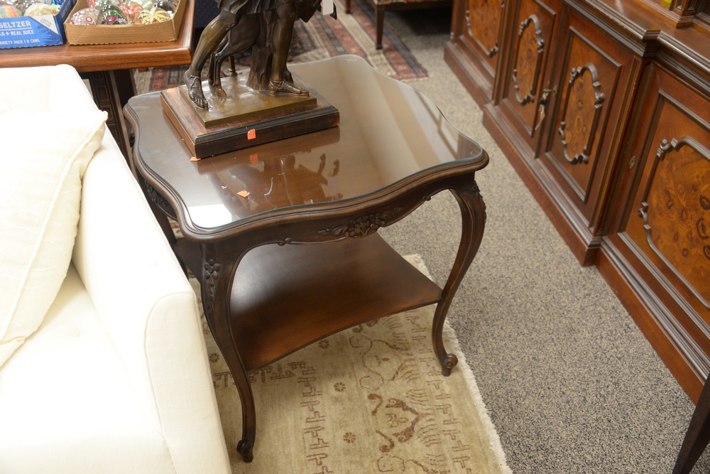 Three Louis XV Style Side Tables, one having a round top with one drawer, the other having a shaped top with one drawer, both ending in cabriole legs and having custom glass tops, along with an occasional table having shaped top, height 28 1/2 inches and 27 inches, diameter 23 inches, top 27 1/2″ x 27 1/2″.