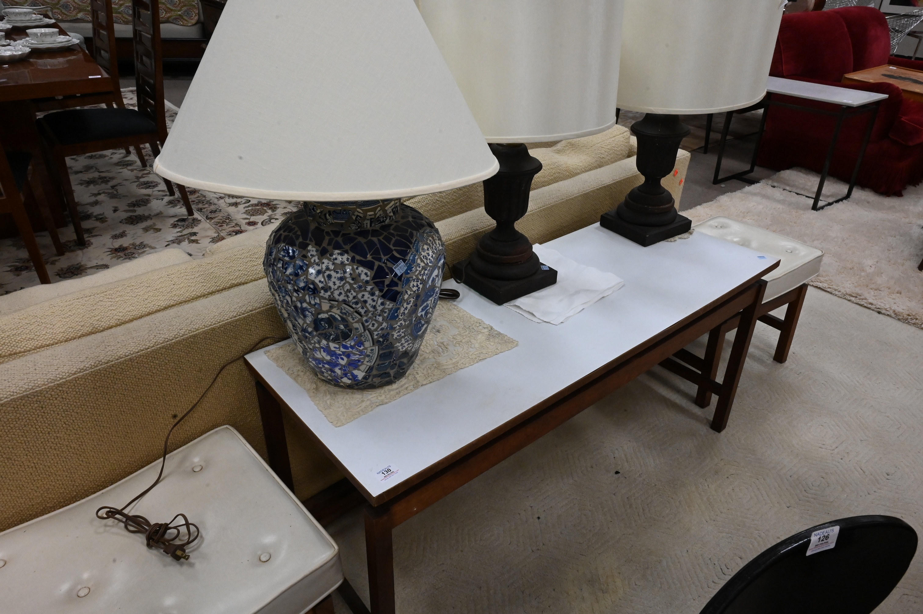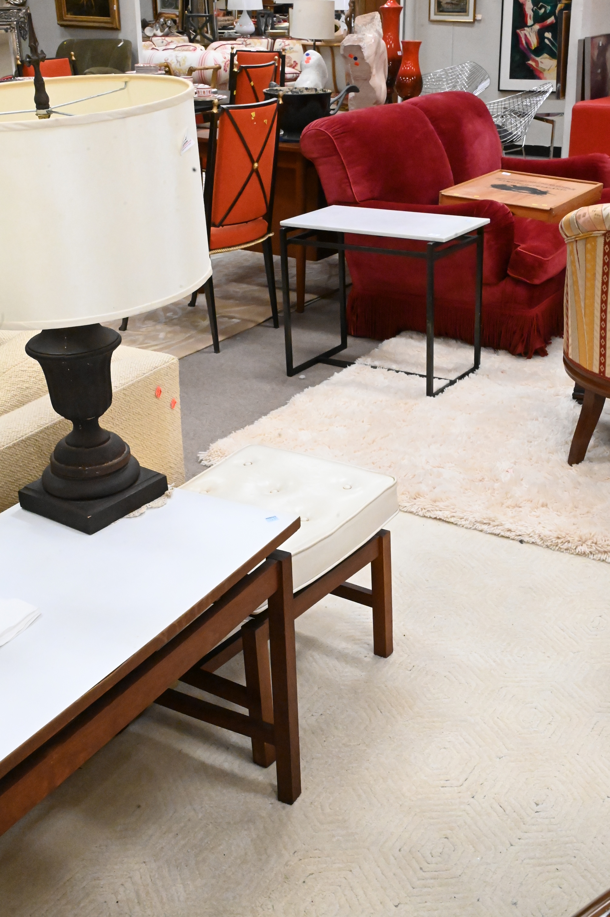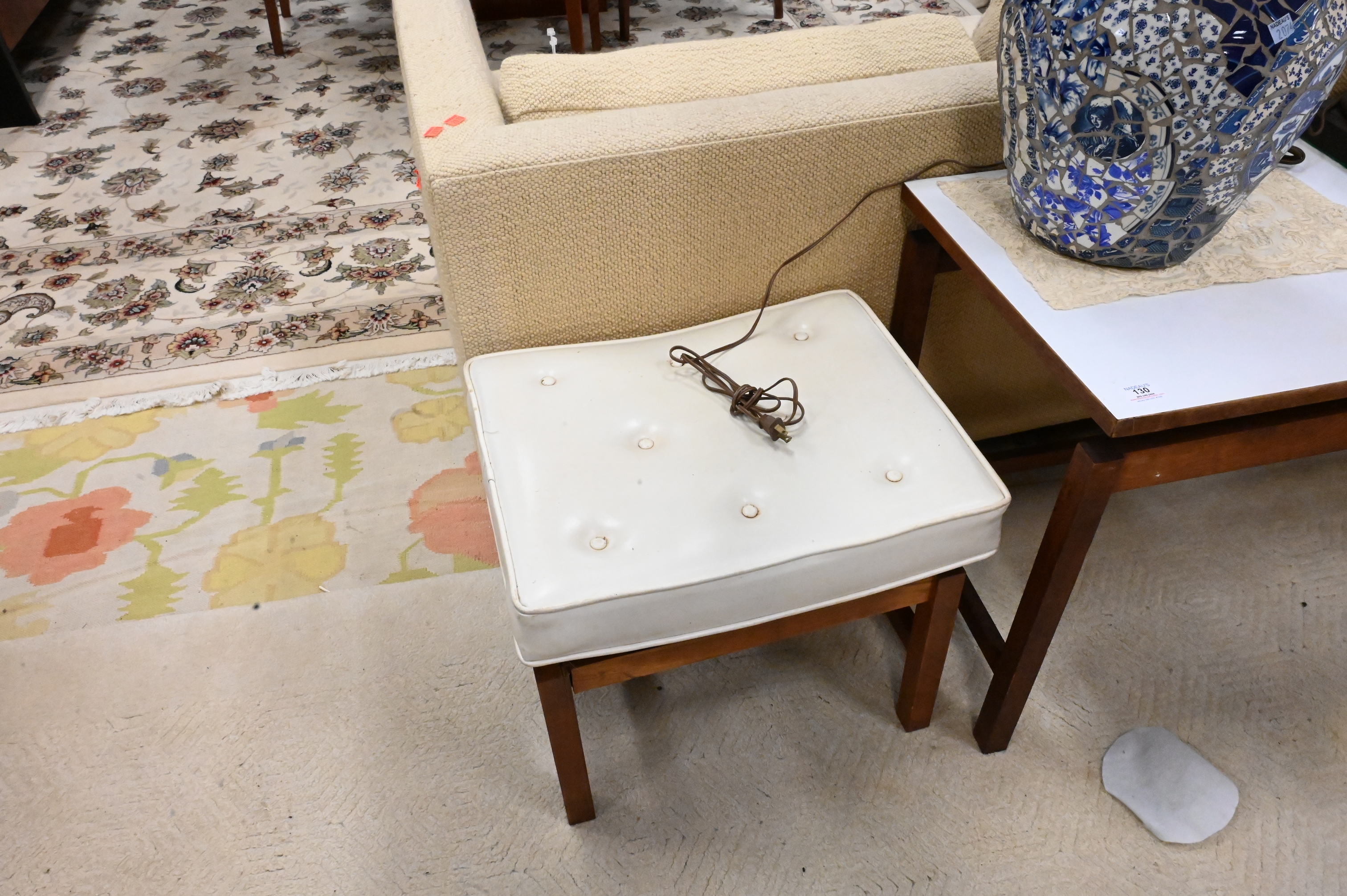 Three Piece Jens Risom Lot, to include a coffee table, height 22 inches, top 18″ x 48″, along with a pair of tufted top stools, height 16 3/4 inches.