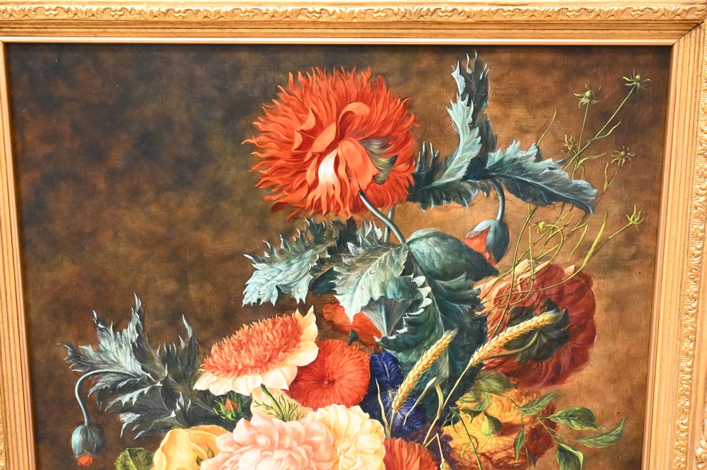Lot 130: TM, Still Life with Flowers in a Vase and Bird’s Nest, initialed with a conjoined monogram “TM” recto, lower left, sight size 24 1/2″ x 19″. Provenance: Kurt Schon Fine Art (label verso), May 3, 1995.