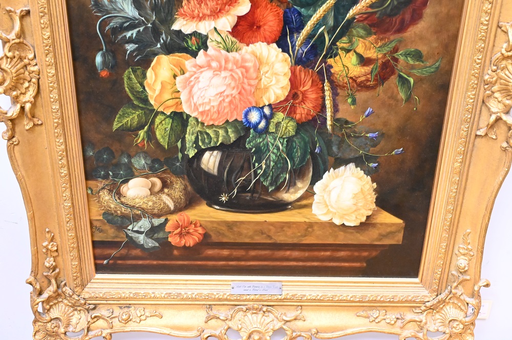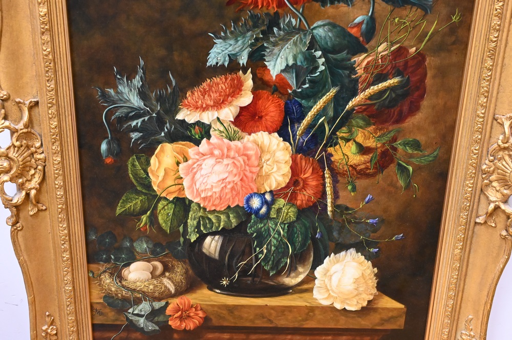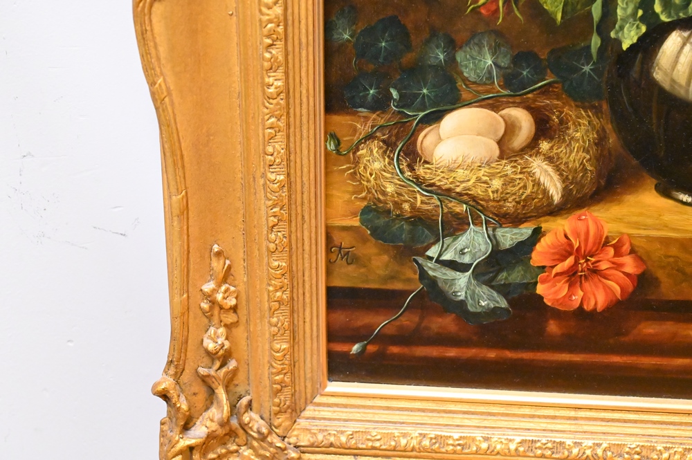 TM, Still Life with Flowers in a Vase and Bird’s Nest, initialed with a conjoined monogram “TM” recto, lower left, sight size 24 1/2″ x 19″. Provenance: Kurt Schon Fine Art (label verso), May 3, 1995.