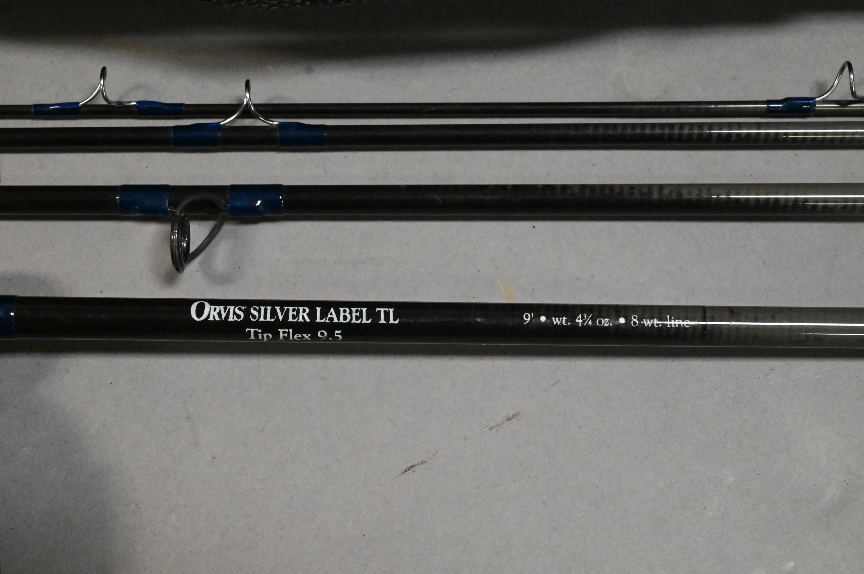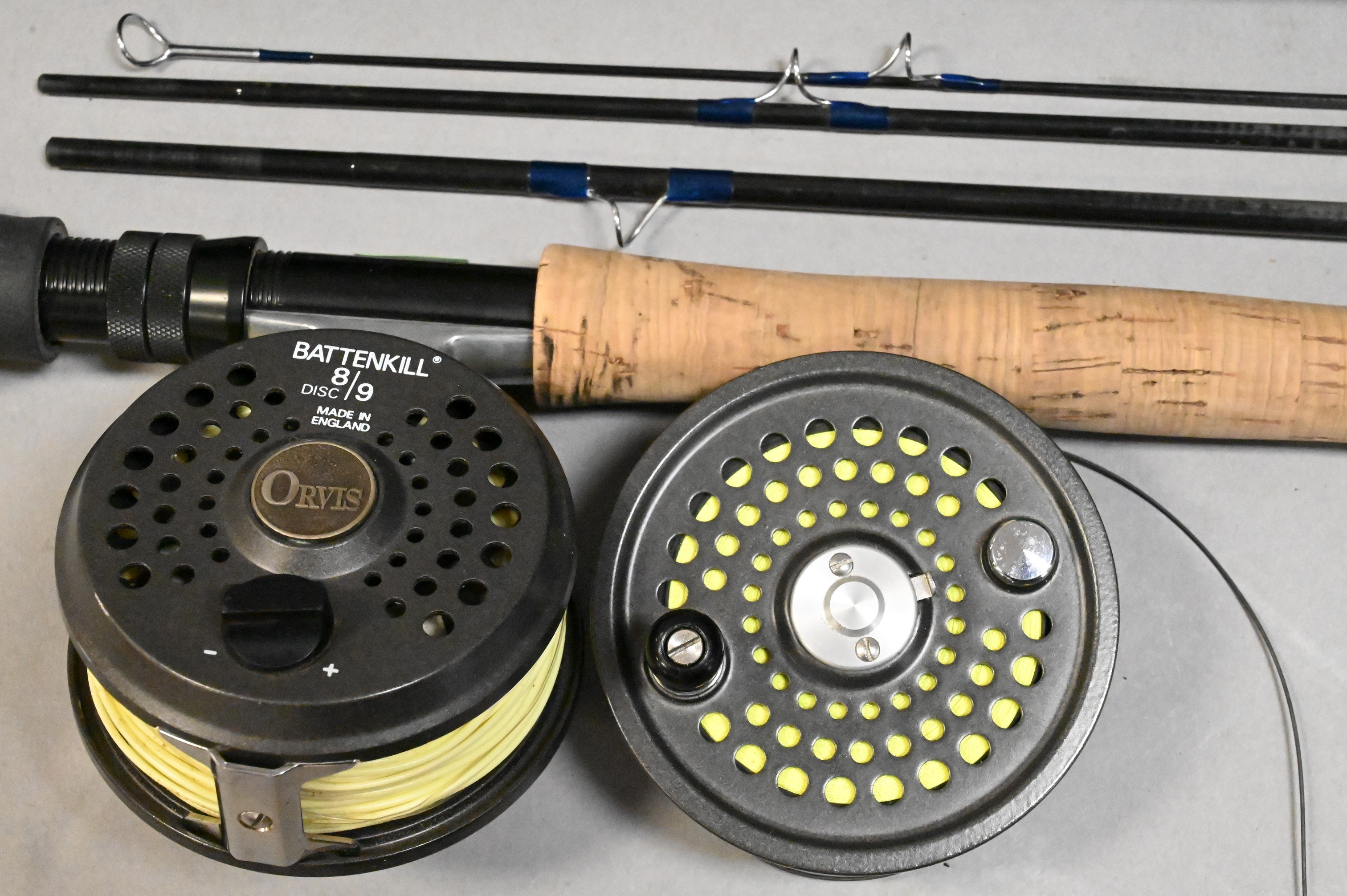 to include Orvis graphire four part pack rod having silver label TL Tip Flex 9.5 9′ 4 3/4 oz. 8wt., along with Battenkill 8/9 disc fly reel with extra spool. in Orvis case