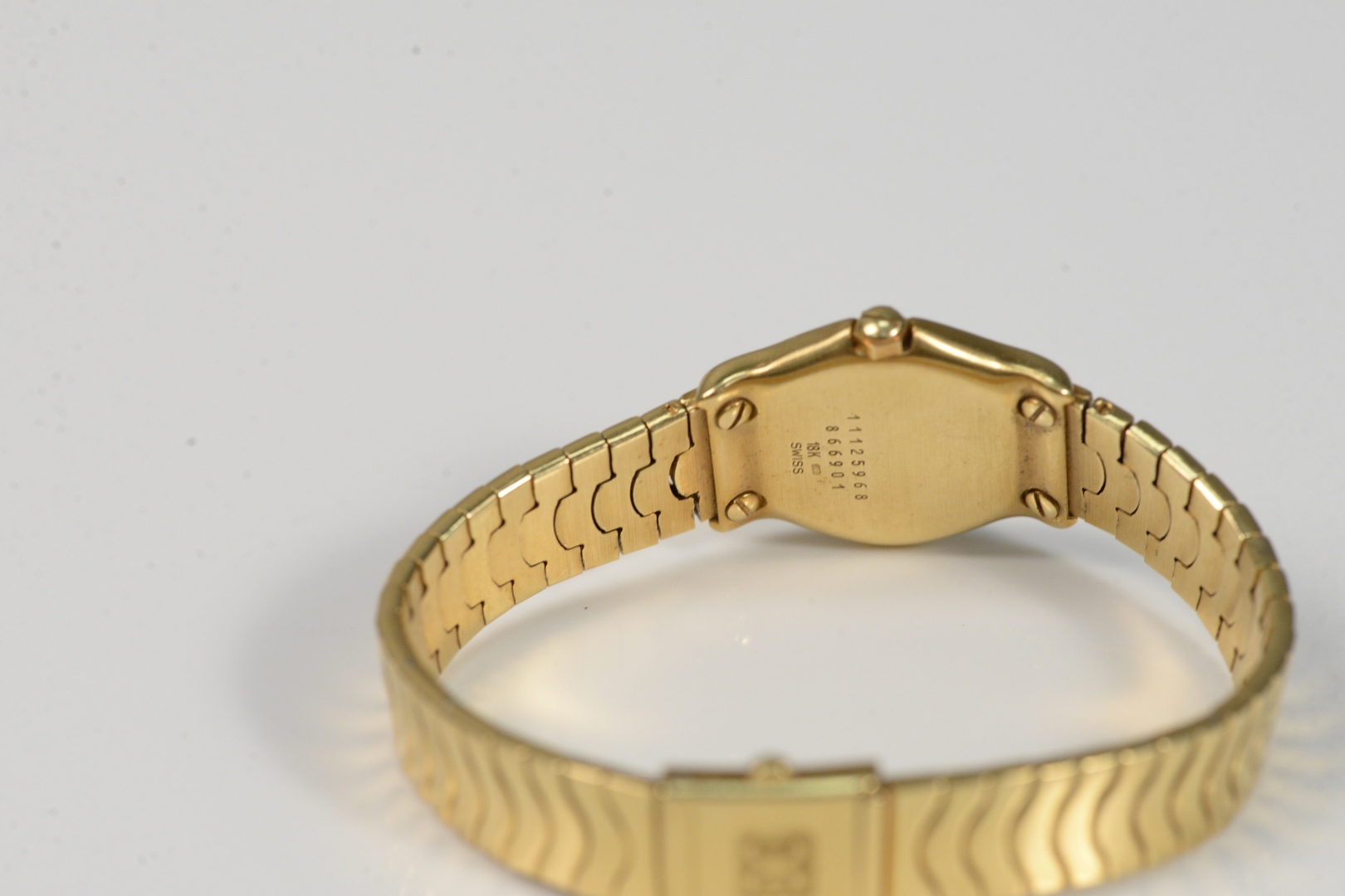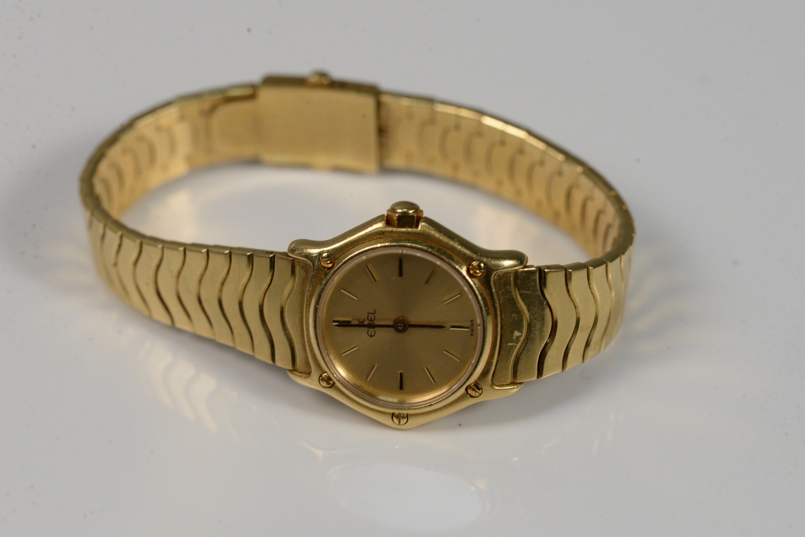 Lot 131: 18 Karat Gold Ebel Ladies Wristwatch with 18 karat gold band length 6 1/2 inches, 23.3 millimeters total weight 58.2 grams