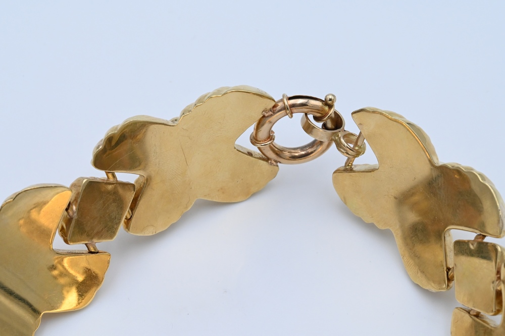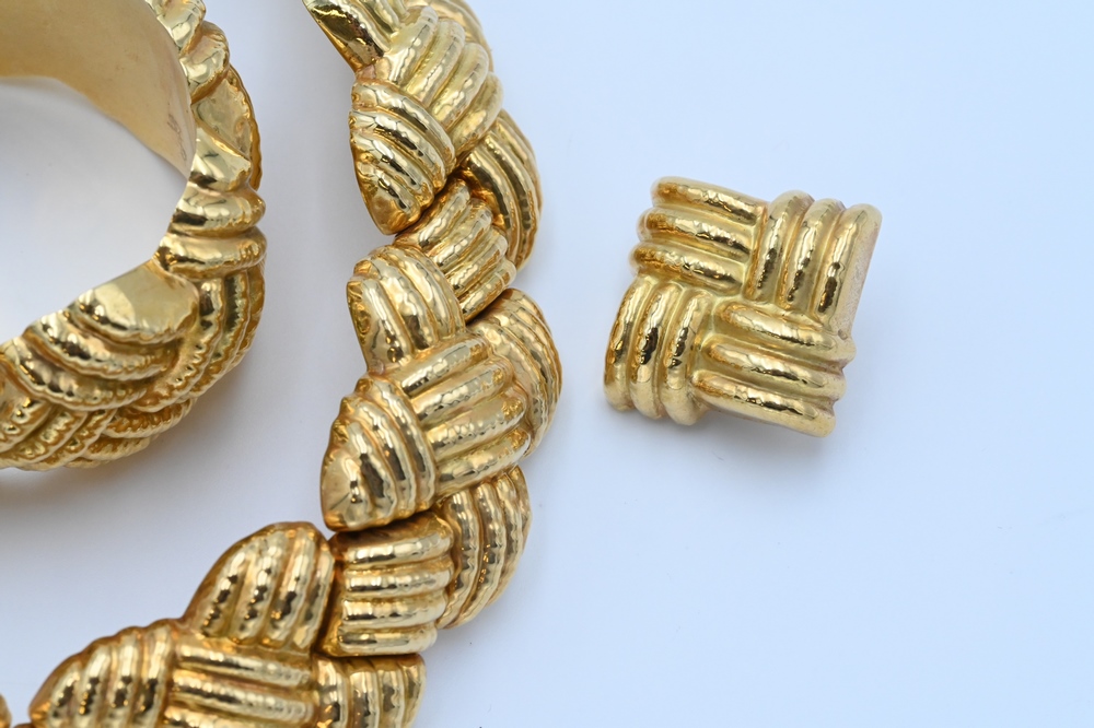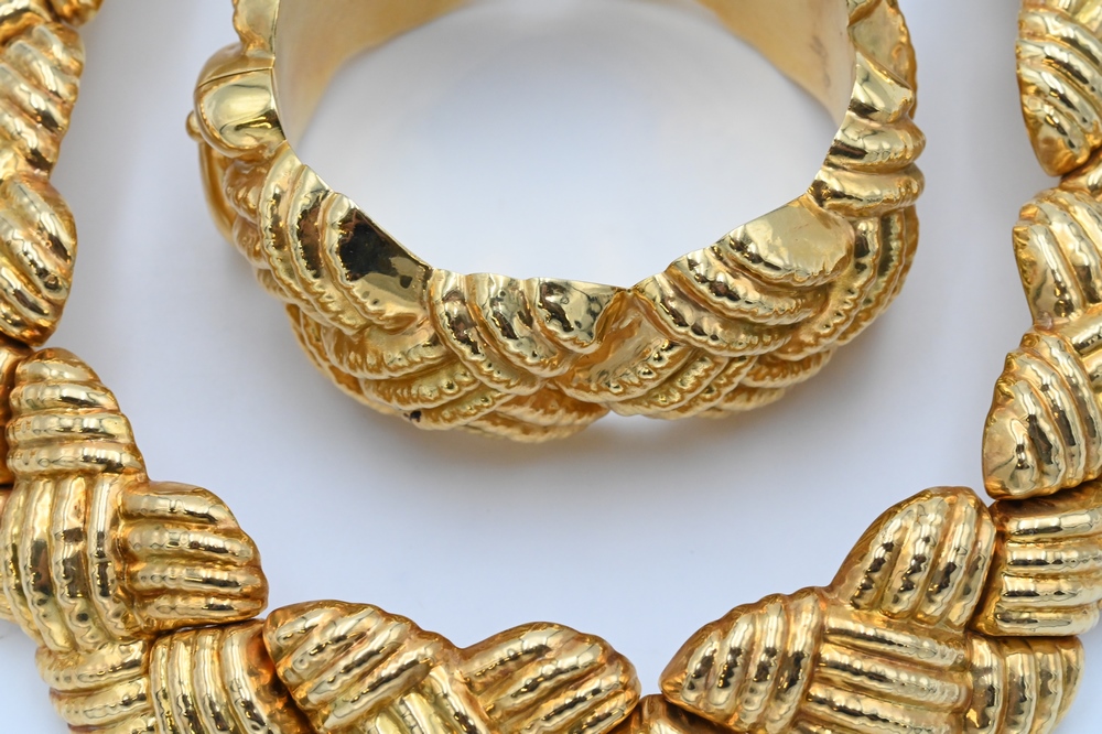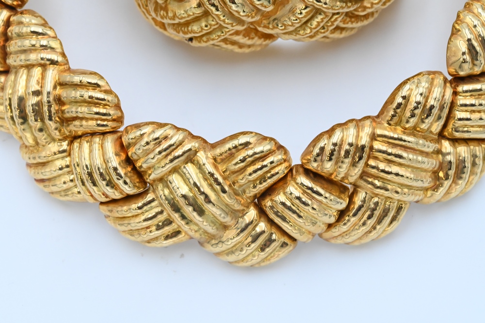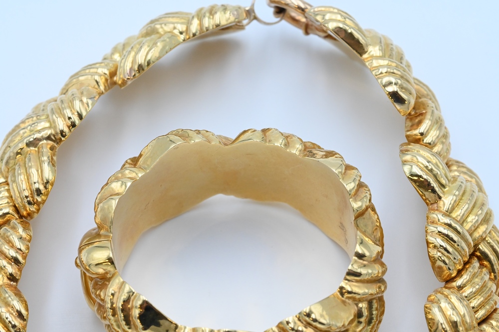 18 Karat Gold Four Piece Necklace, Bangle Bracelet and Earrings, necklace with woven effect with 14 karat circular clasp, along with 18 karat gold matching bracelet, necklace only circular clasp, 227 grams total, bracelet 50.4 x 59.4 millimeter opening.