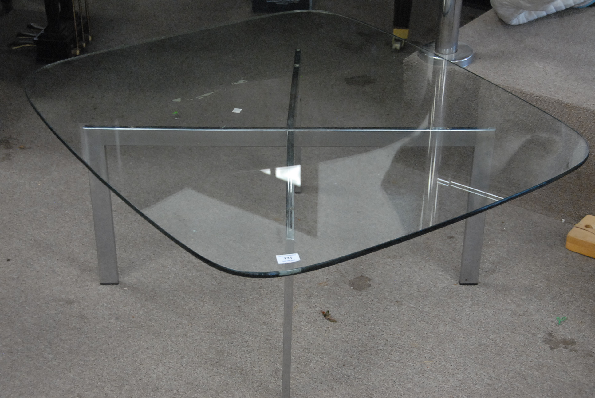 Lot 131: A Mies van der Rohe, Barcelona style coffee table having a glass top set on an X base, 37 x 42