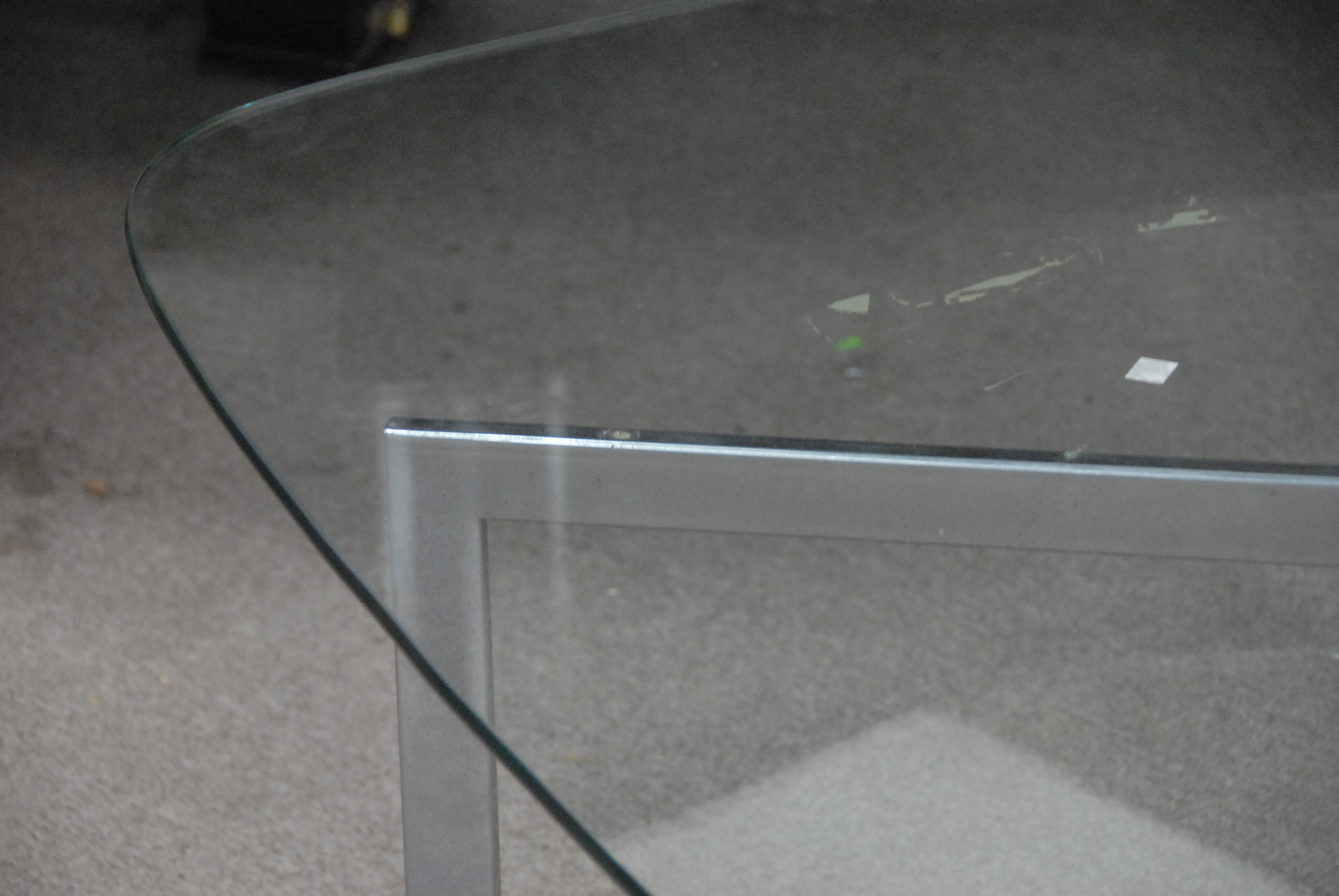 A Mies van der Rohe, Barcelona style coffee table having a glass top set on an X base, 37 x 42.