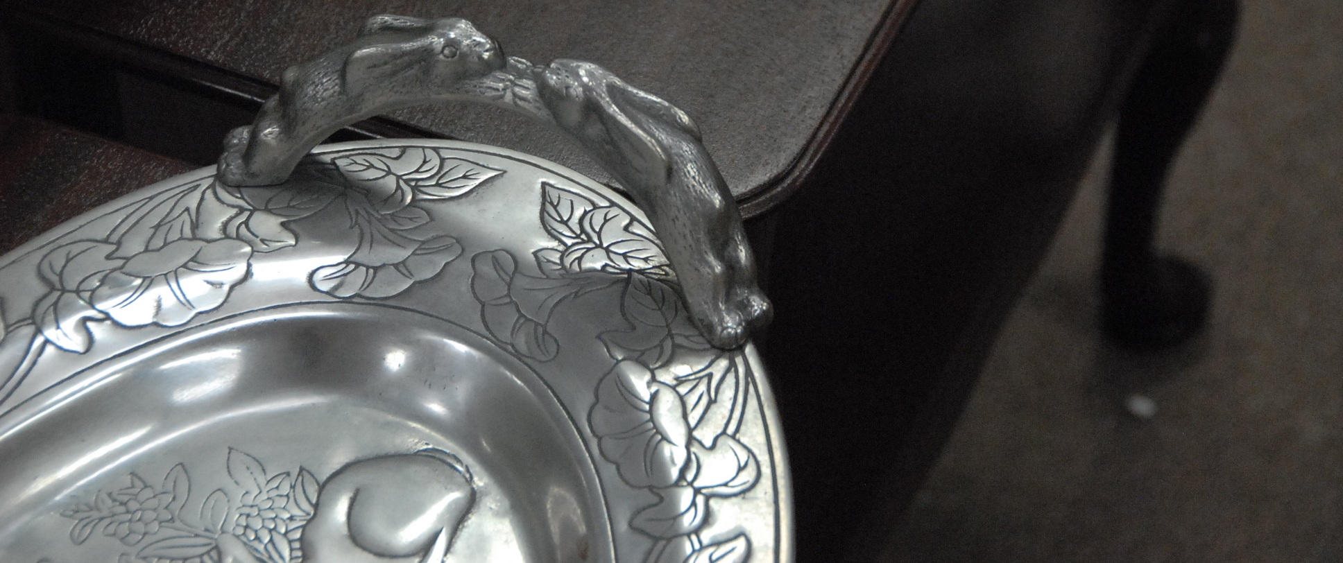 Aluminum tray decorated with rabbits and rabbit handles marked A. Cort Designs 1980.