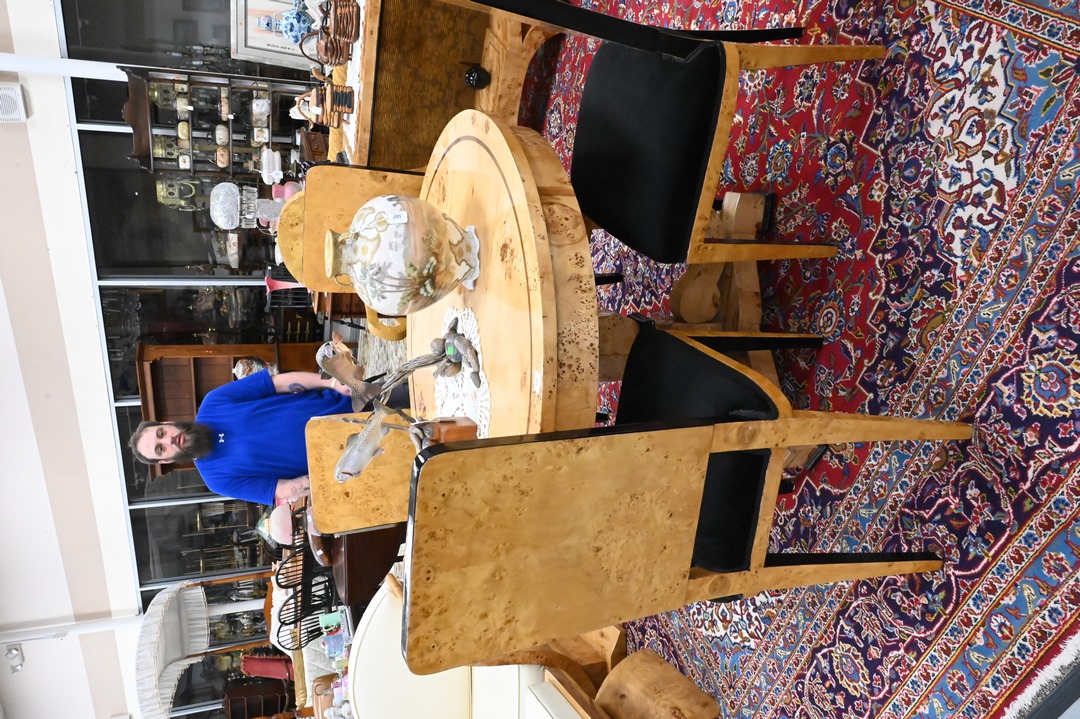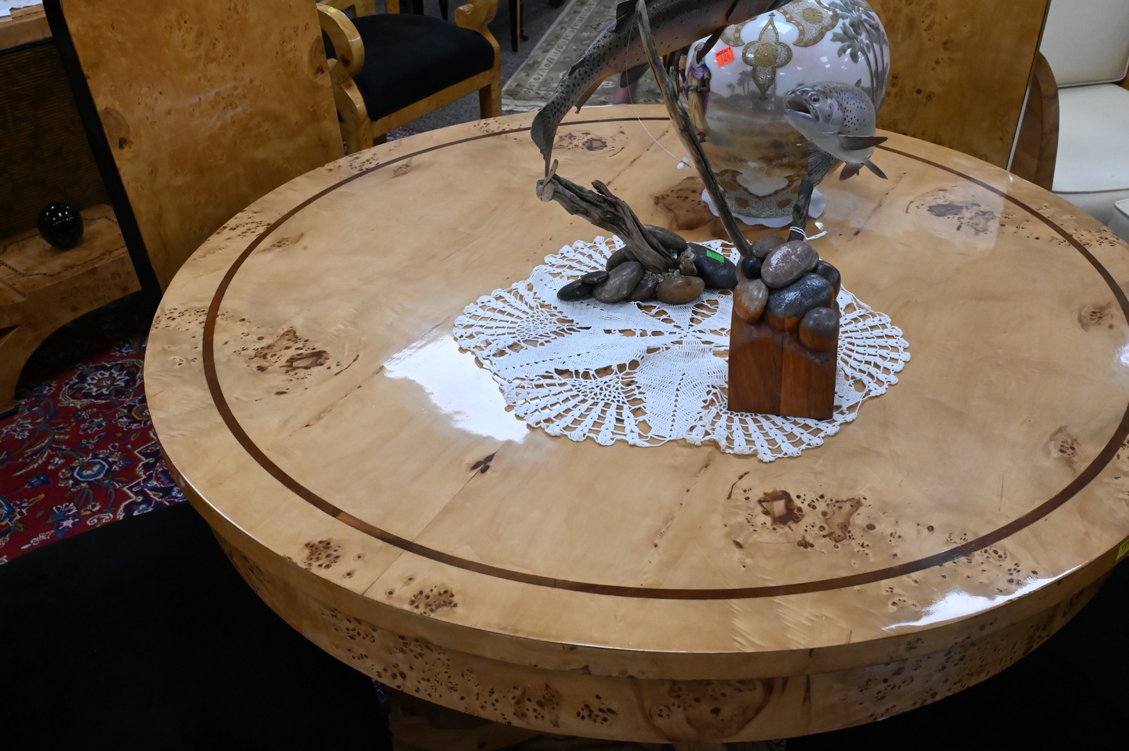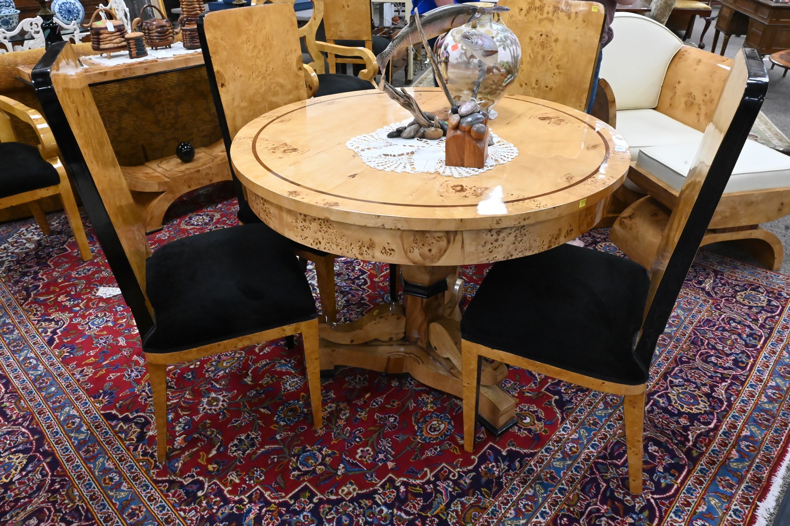 Birdseye Maple Pedestal Round Table, along with four chairs, height 32 3/4 inches, diameter 43 inches.