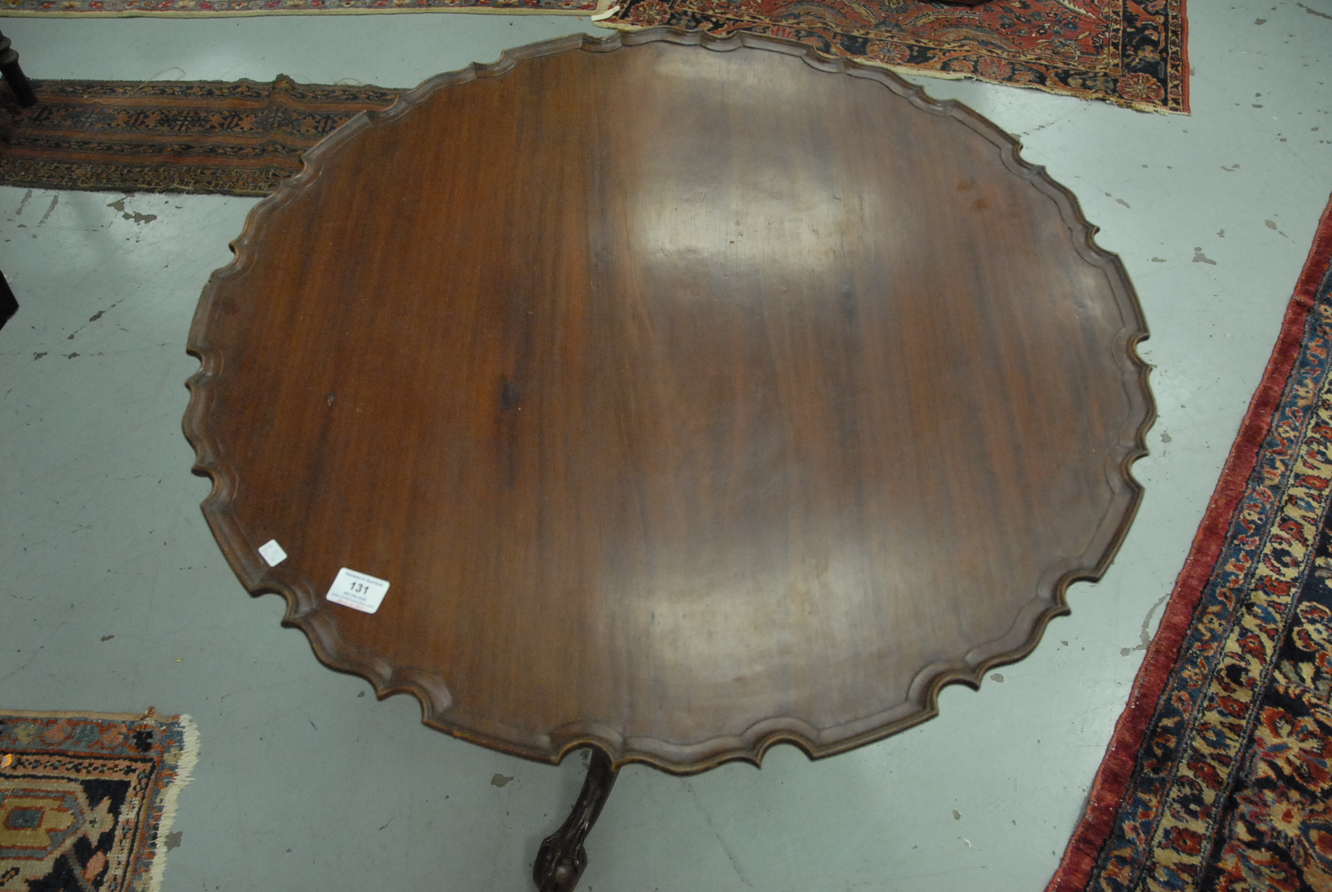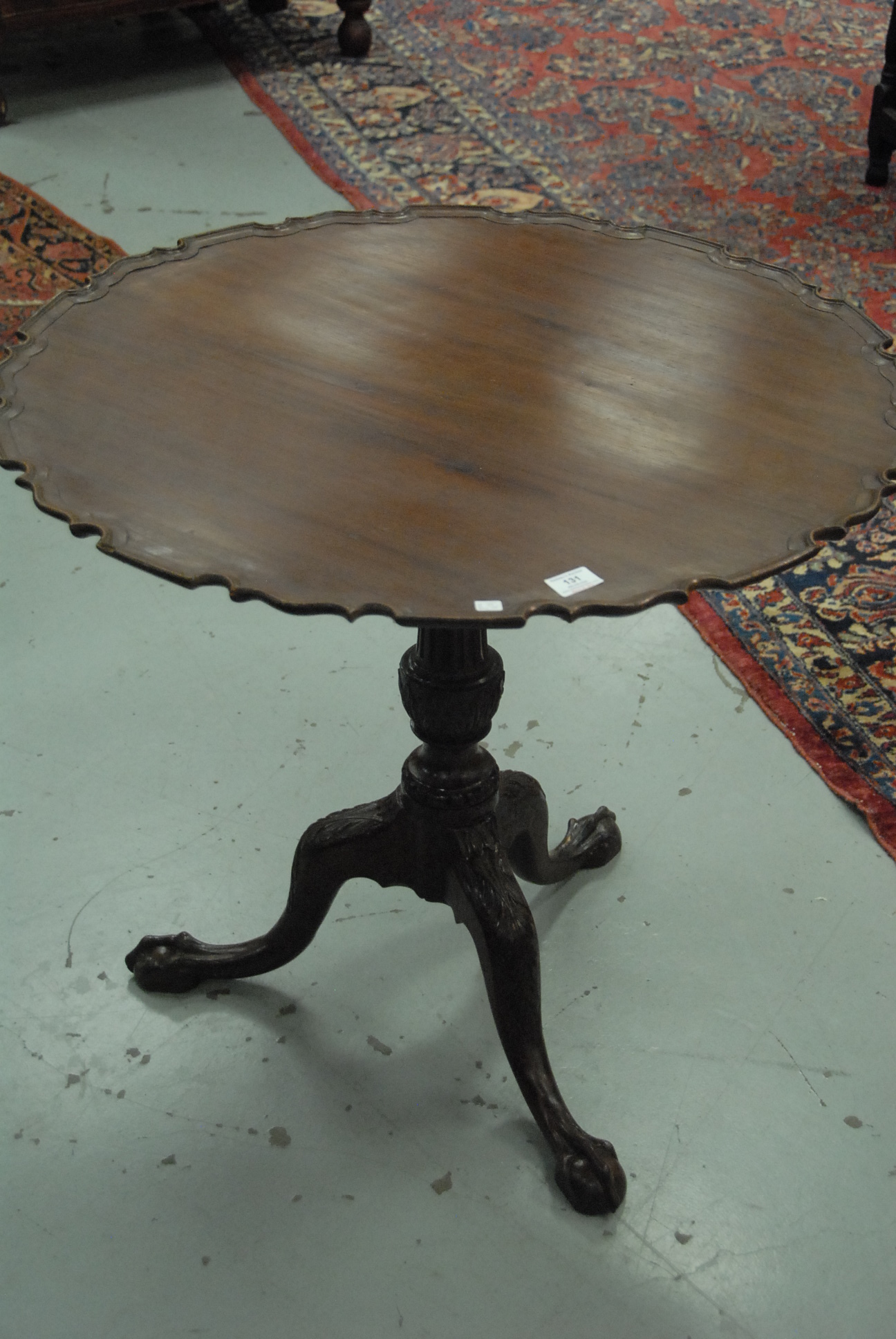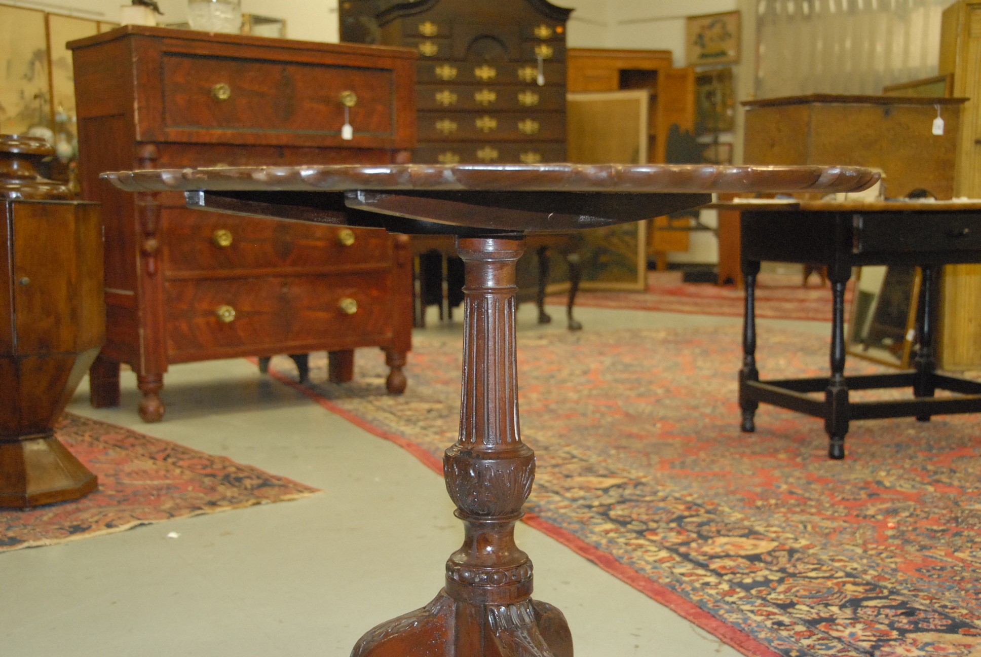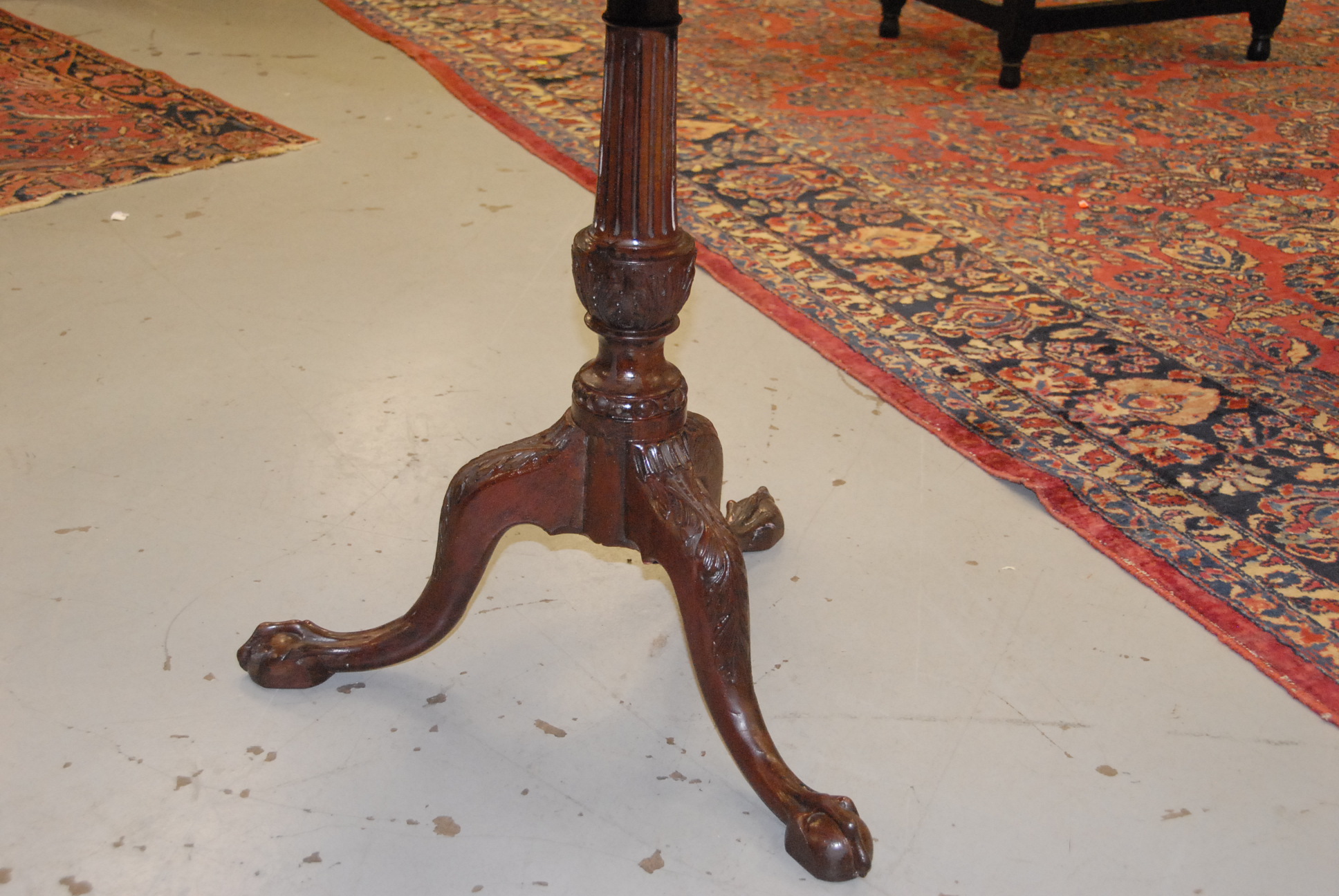 Lot 131: Chippendale mahogany piecrust table on shaft with fluting and carved urn, carved knees on down swept legs ending in claw and ball feet, circa 1760-1780. ht. 29in. top: 32 x 31 5/8.