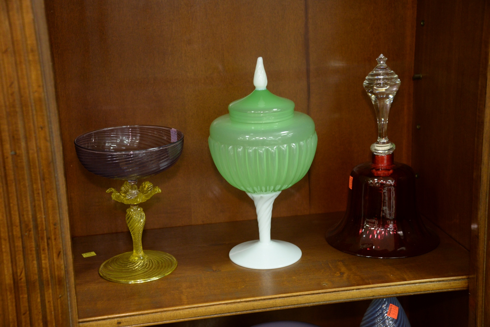 Lot 131: Eight Piece Art Glass Lot, to include a yellow and purple Venetian compote a green opaline style covered compote a red glass bell…