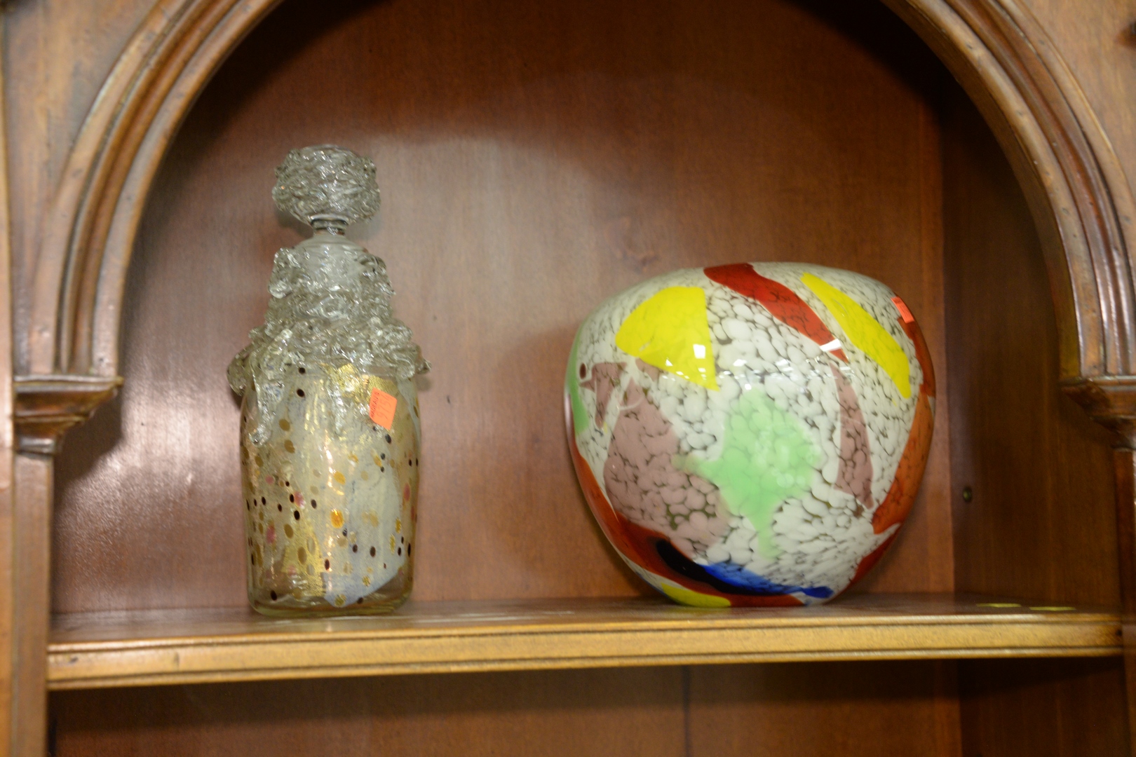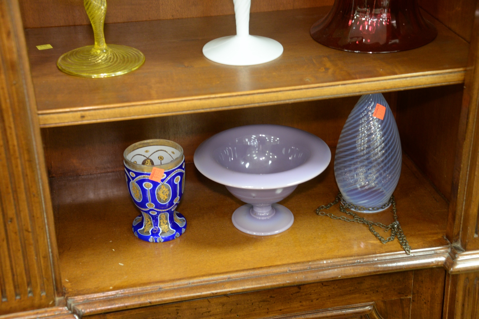 Eight Piece Art Glass Lot, to include a yellow and purple Venetian compote a green opaline style covered compote a red glass bell a glass hanging planter along with a Murano blown glass vase, etc tallest 13 inches.