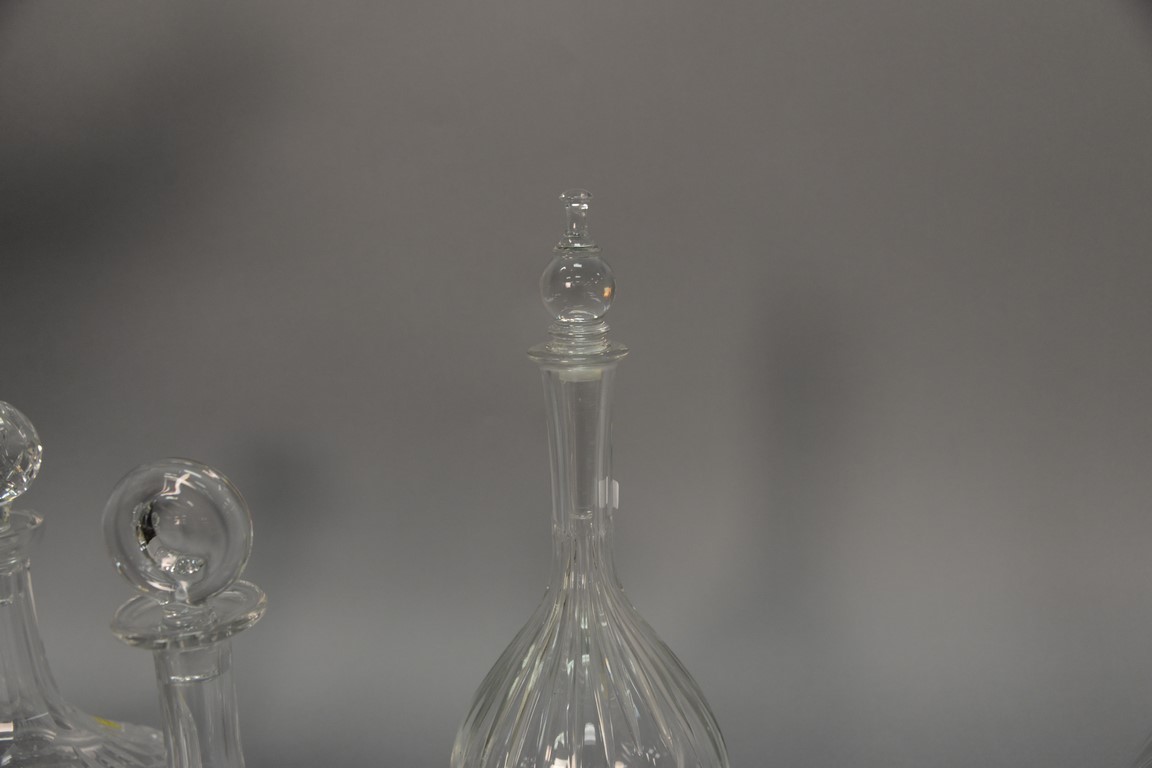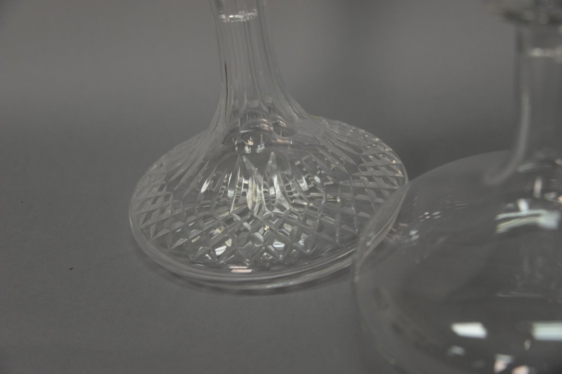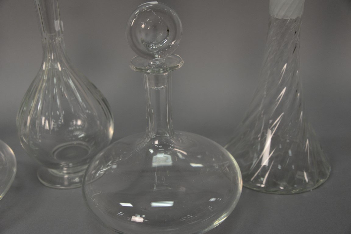 Five decanters including three Baccarat, one Waterford, and one Orrefors. ht. 10in. to 13 1/2in.