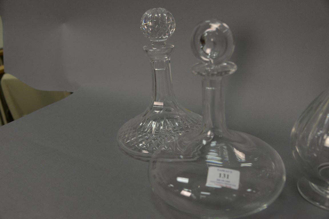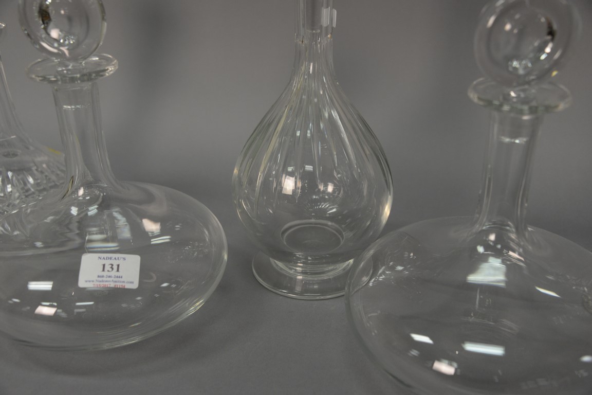 Lot 131: Five decanters including three Baccarat, one Waterford, and one Orrefors. ht. 10in. to 13 1/2in.