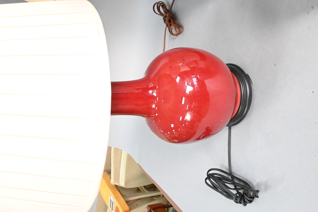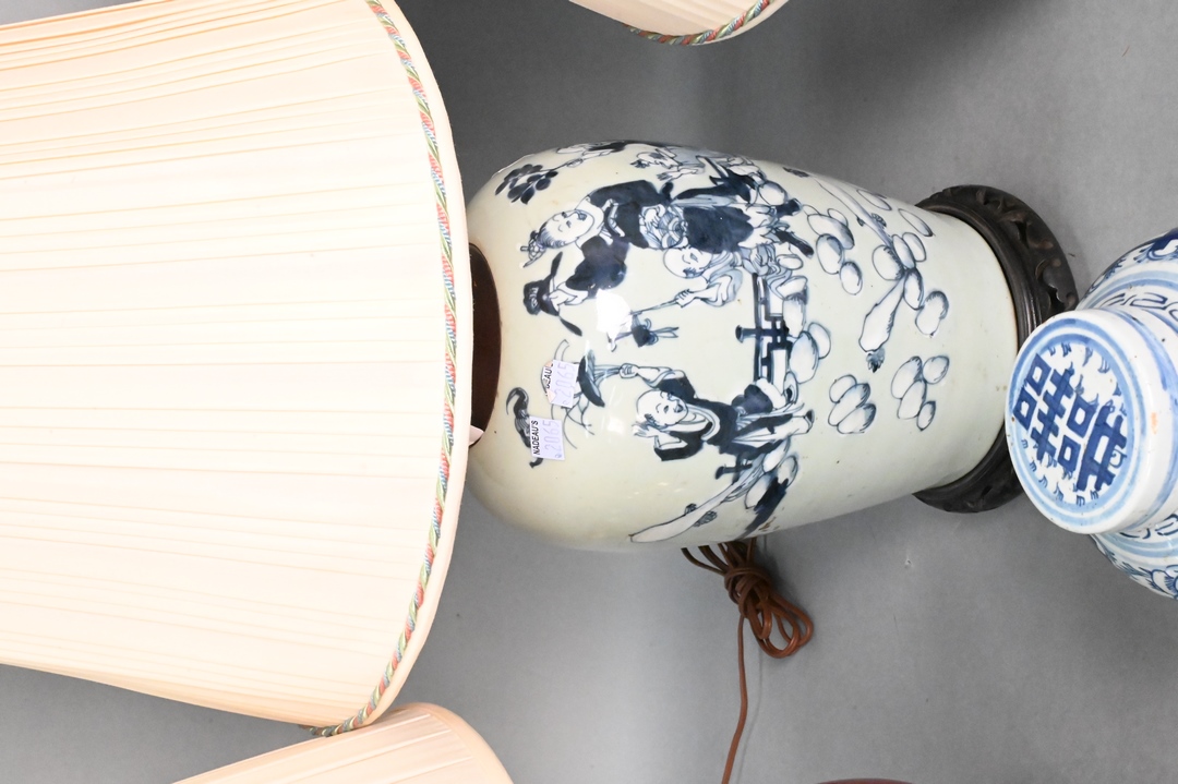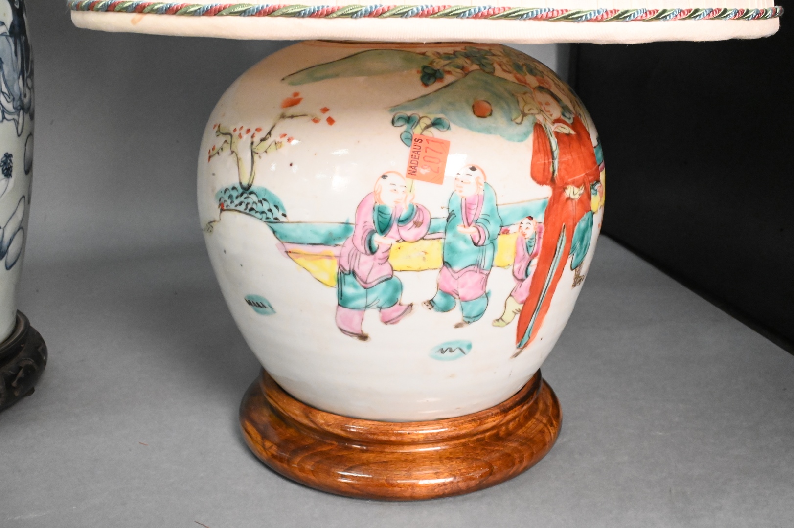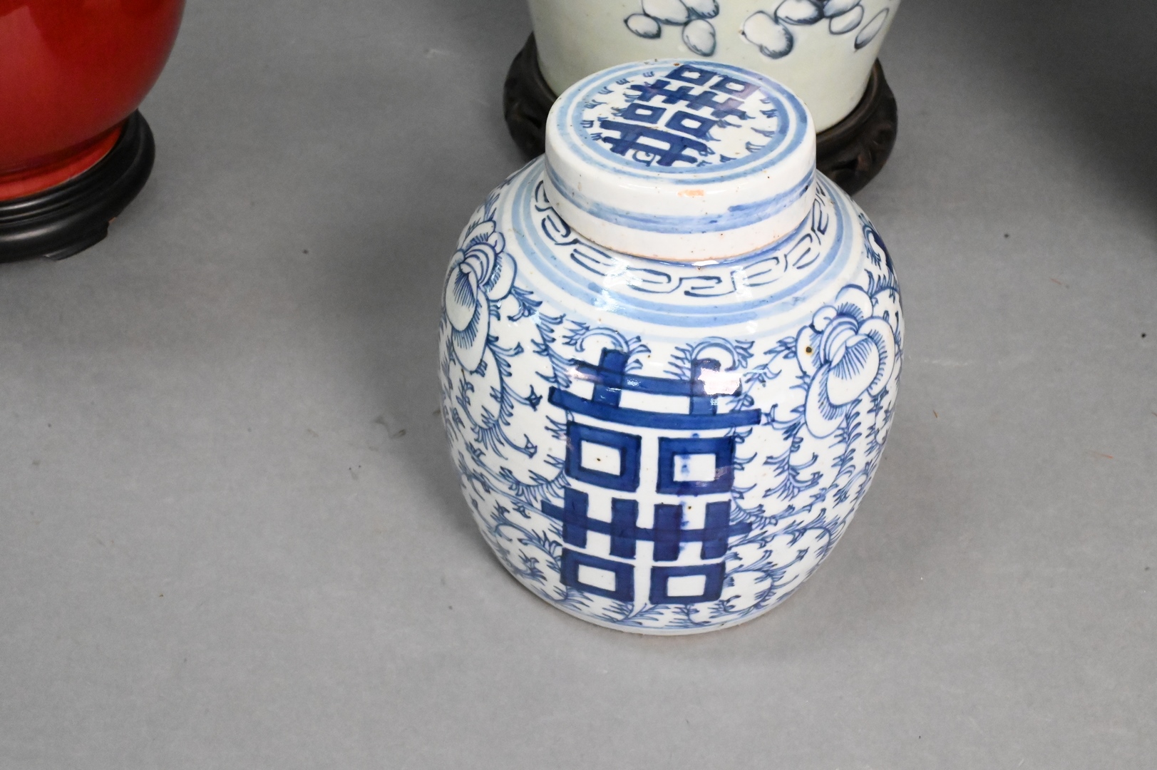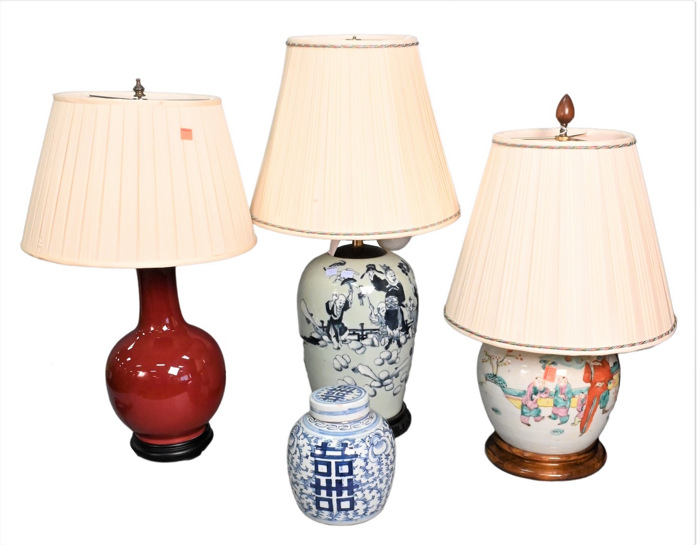 Four Chinese Porcelain Pieces, to include Sang de Boeuf vase made into a lamp, celadon blue glaze vase made into a lamp, along with two ginger jars; one made into a lamp, tallest vase 13 inches.