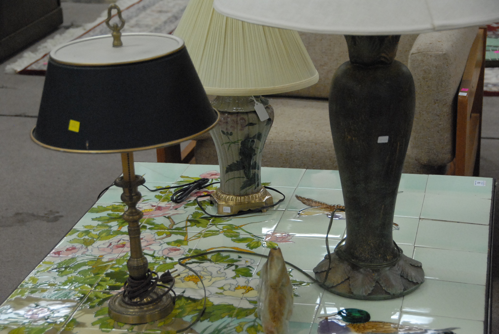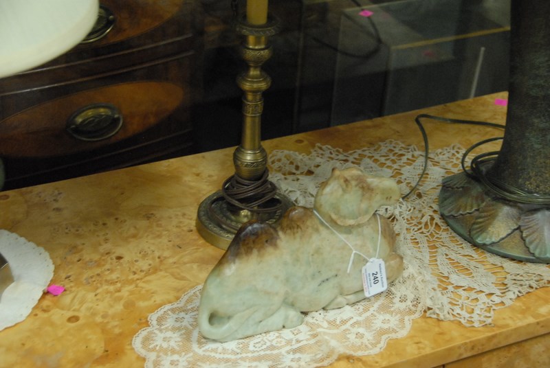 Lot 131: Four piece lot to include three various table lamps one brass candlestick lamp and hardstone camel.