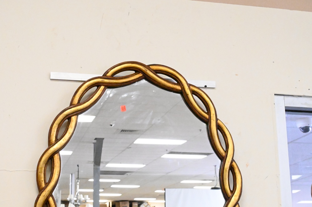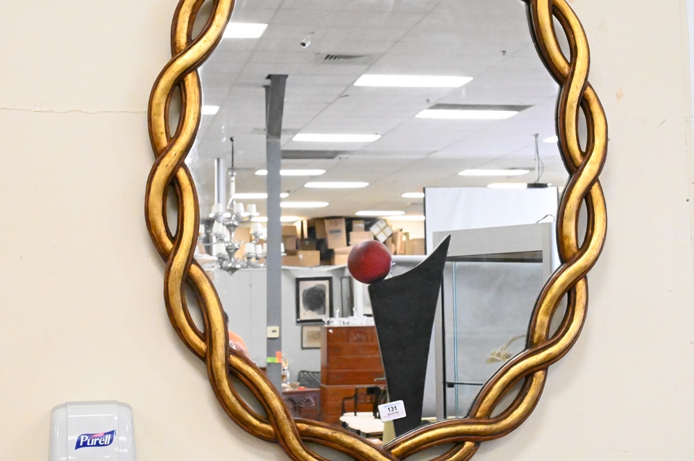 Lot 131: LaBarge Contemporary Gilt Mirror, having intertwined frame, height 28 inches, width 29 inches. Provenance: Collections of Norma Reilly, New Jersey.