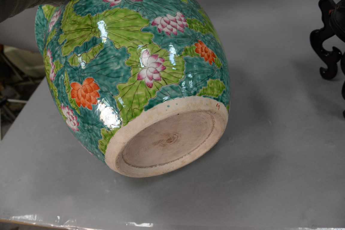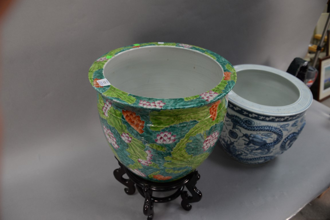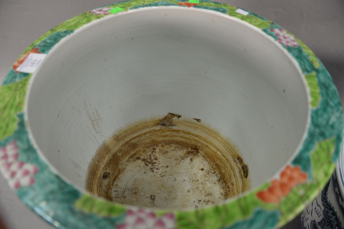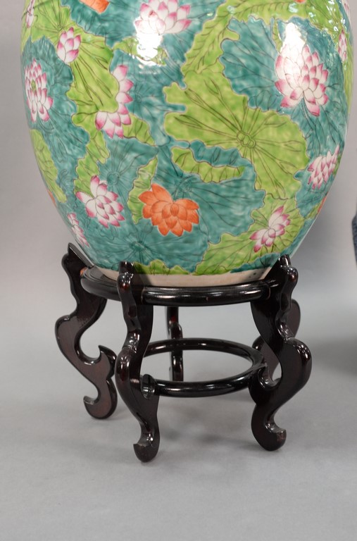 Lot 131: Large Famille Rose porcelain planter fish bowl with painted leaves and flowers on stand. ht. 14 1/2in., dia. 16in.