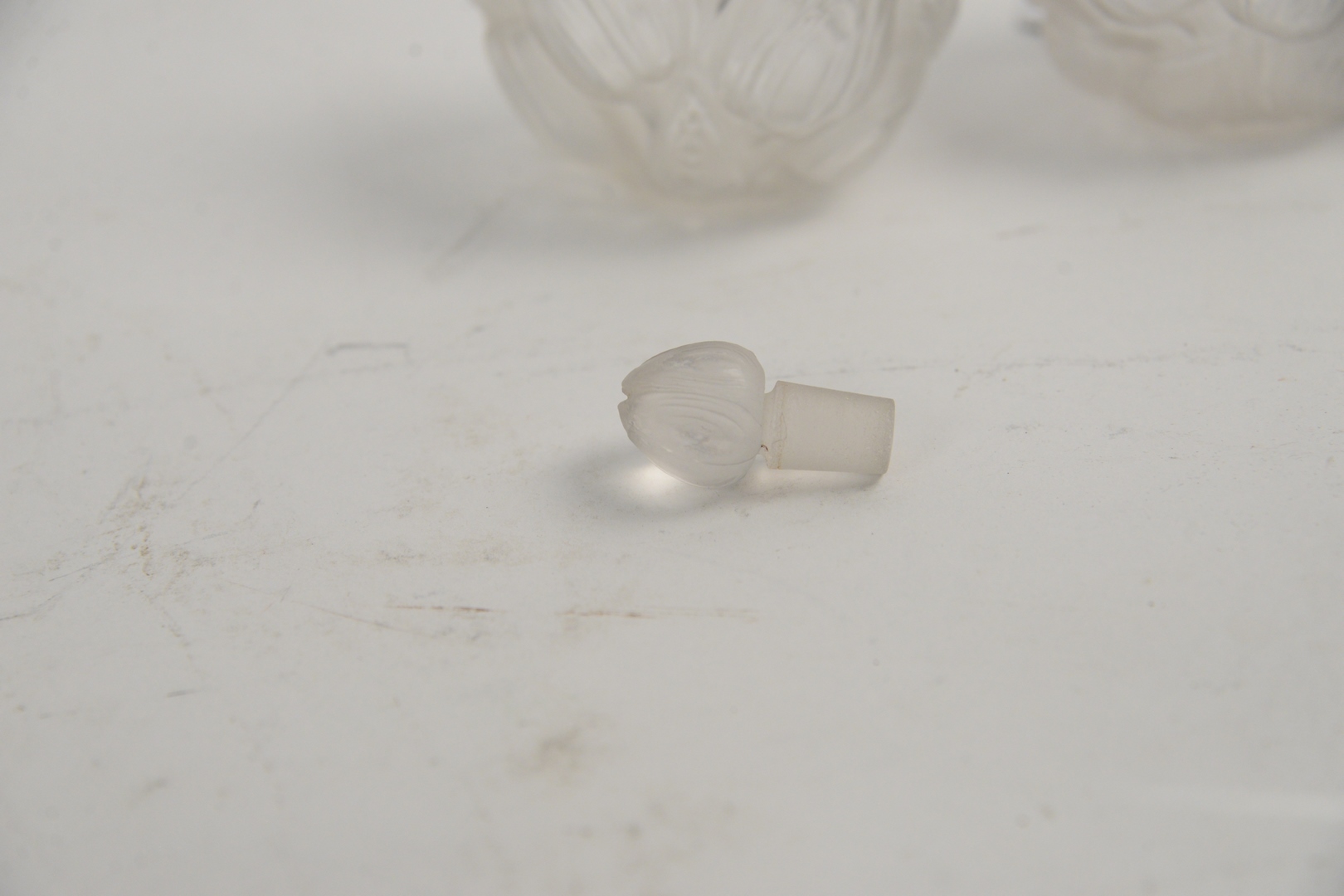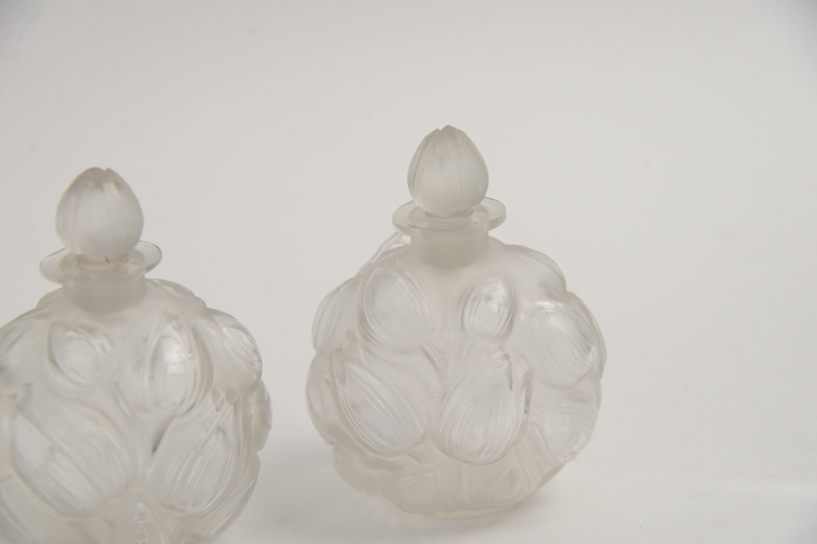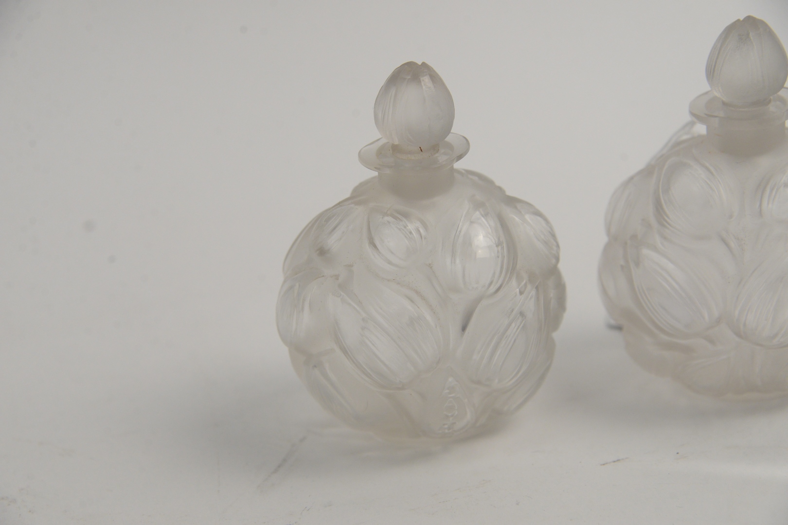 Pair of Rene Lalique Jaytho Art Glass Perfumes designed by Jay Thorpe, 1927, marked Lalique, France on bottom and Jaytho on side, height 4 inches. Provenance: The Estate of Ed Brenner, Short Hills, New Jersey.