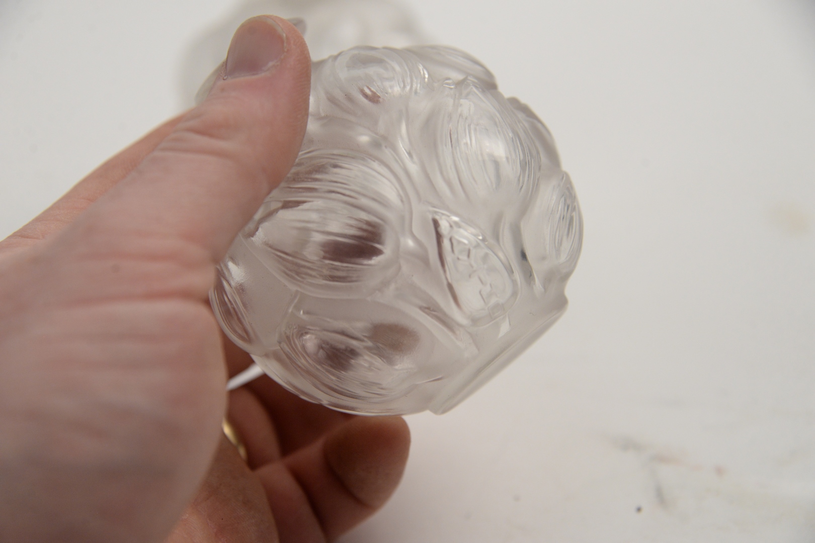Lot 131: Pair of Rene Lalique Jaytho Art Glass Perfumes designed by Jay Thorpe, 1927, marked Lalique, France on bottom and Jaytho on side, height 4 inches. Provenance: The Estate of Ed Brenner, Short Hills, New Jersey.