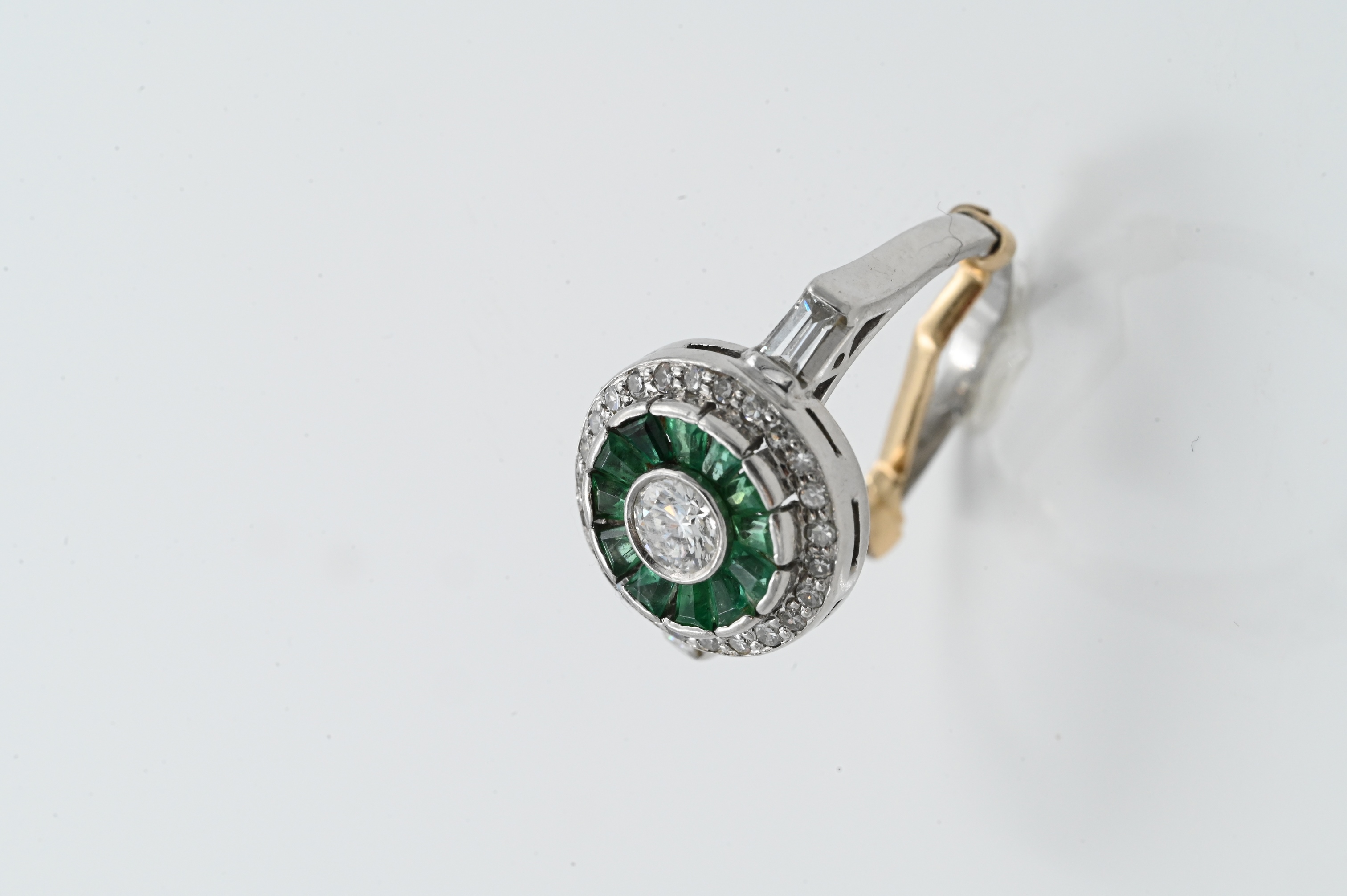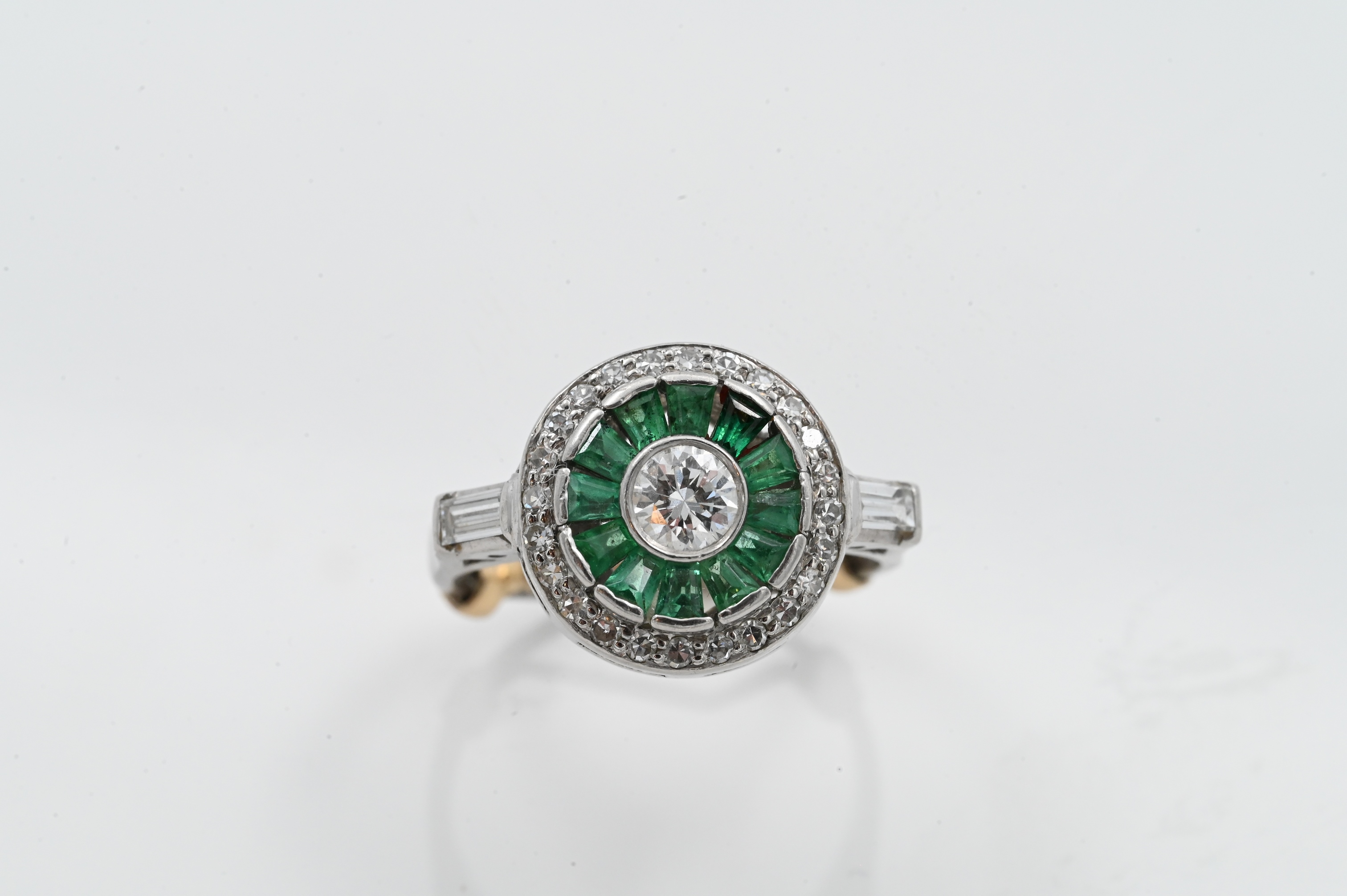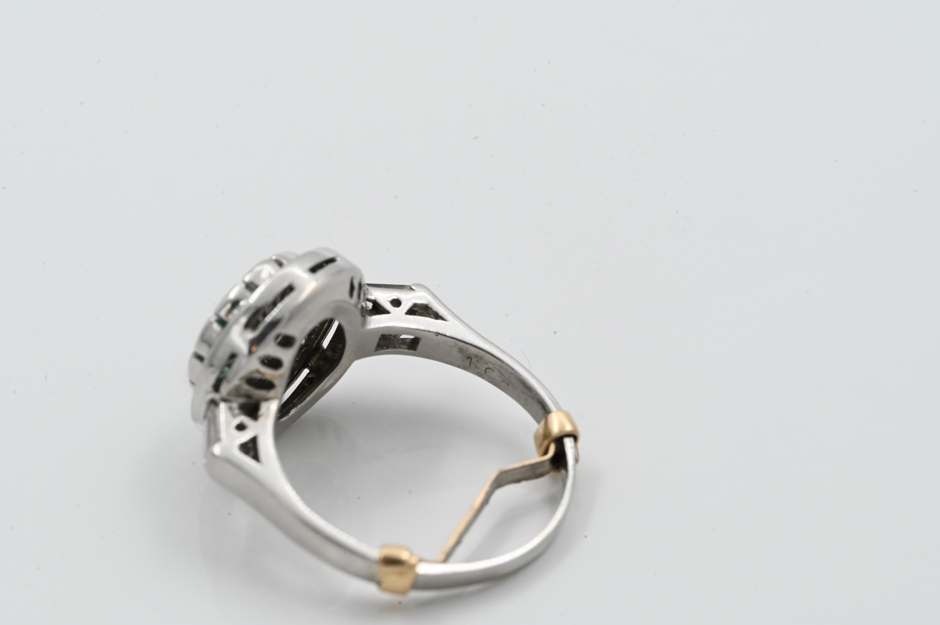 set with center diamond approximately .25 carat surrounded by a halo of tapered baguette emeralds surround by a halo of round cut diamonds, total weight 6.1 grams, size 8 1/2