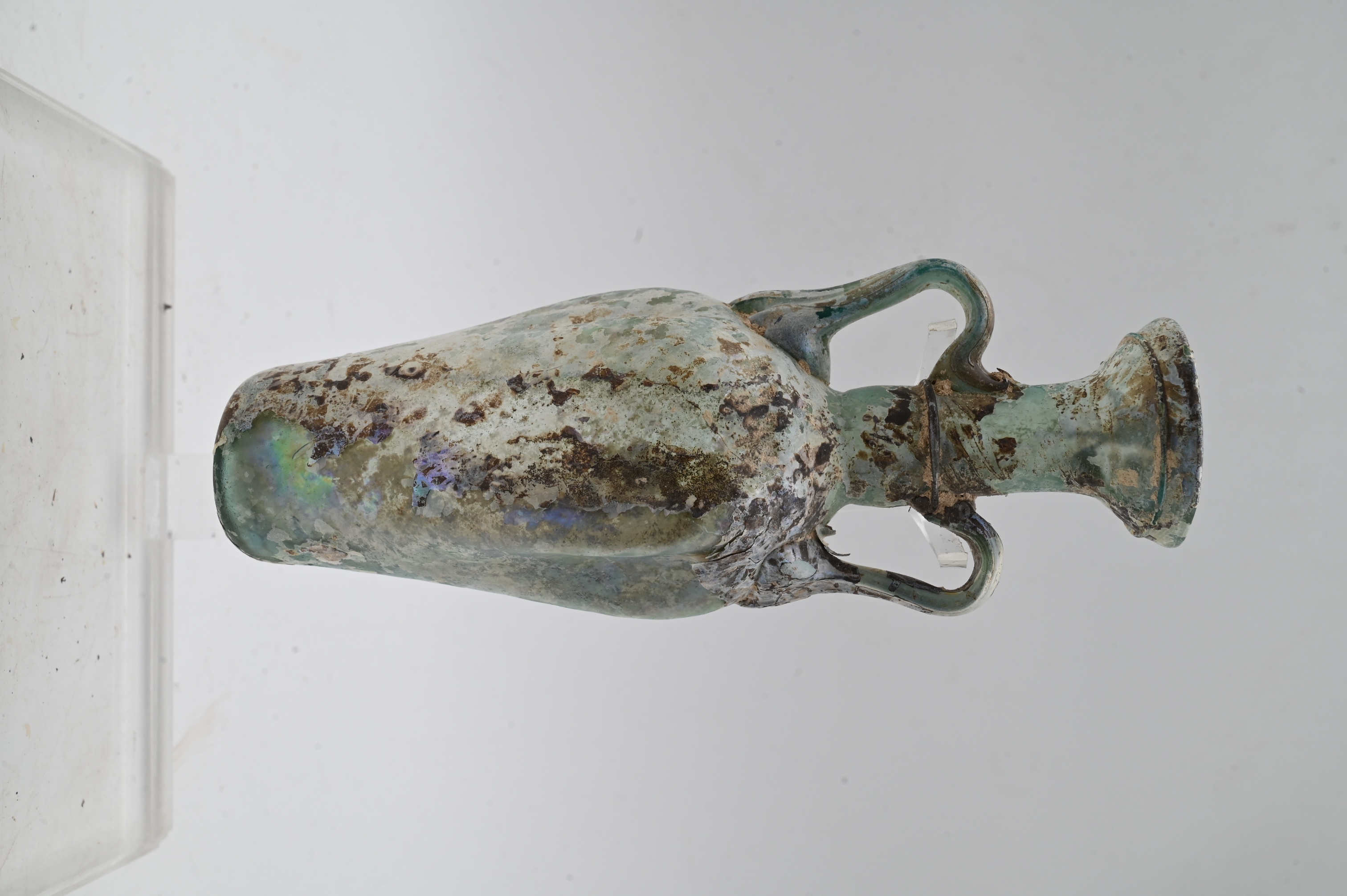 of tall form with pinched sides, concave rim, and applied banding, with two applied handles, free-blown in pale green glass, the surface with encrustation consistent with burial, an extremely rare form with comparable example held in an Israeli museum