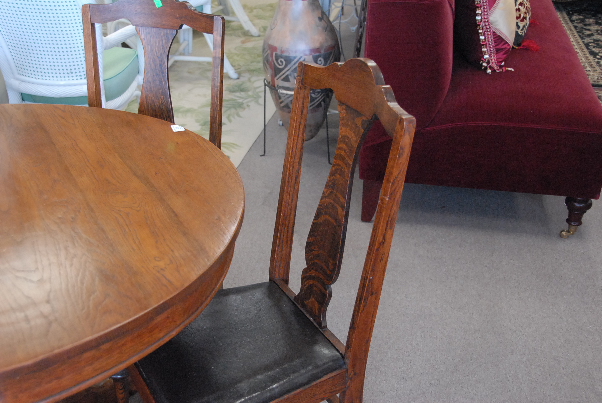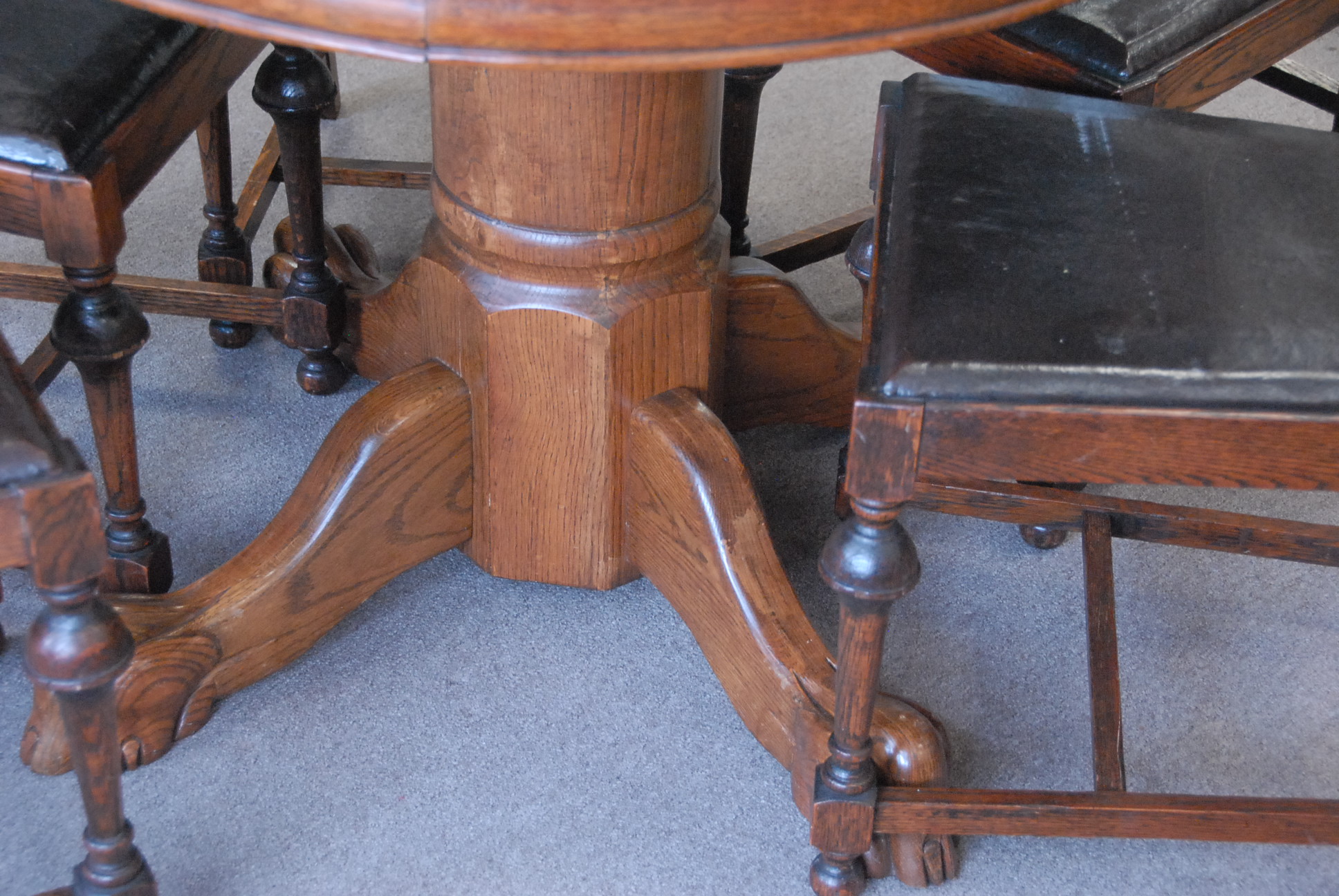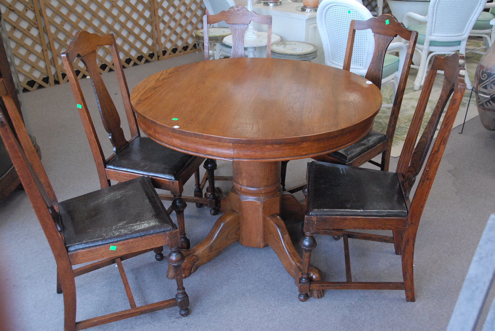 Round oak table and five chairs, ht. 31 1/2in. dia. 41 1/2in.