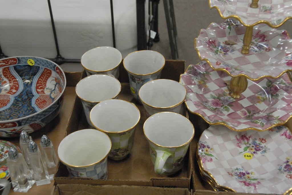 Six box lots to include Satin glass vases, Majolica plate, large cups, plates, three tier stand by McKenzie Childs, Sevres box, Imari bowl, necklace, rose medallion small plates etc.