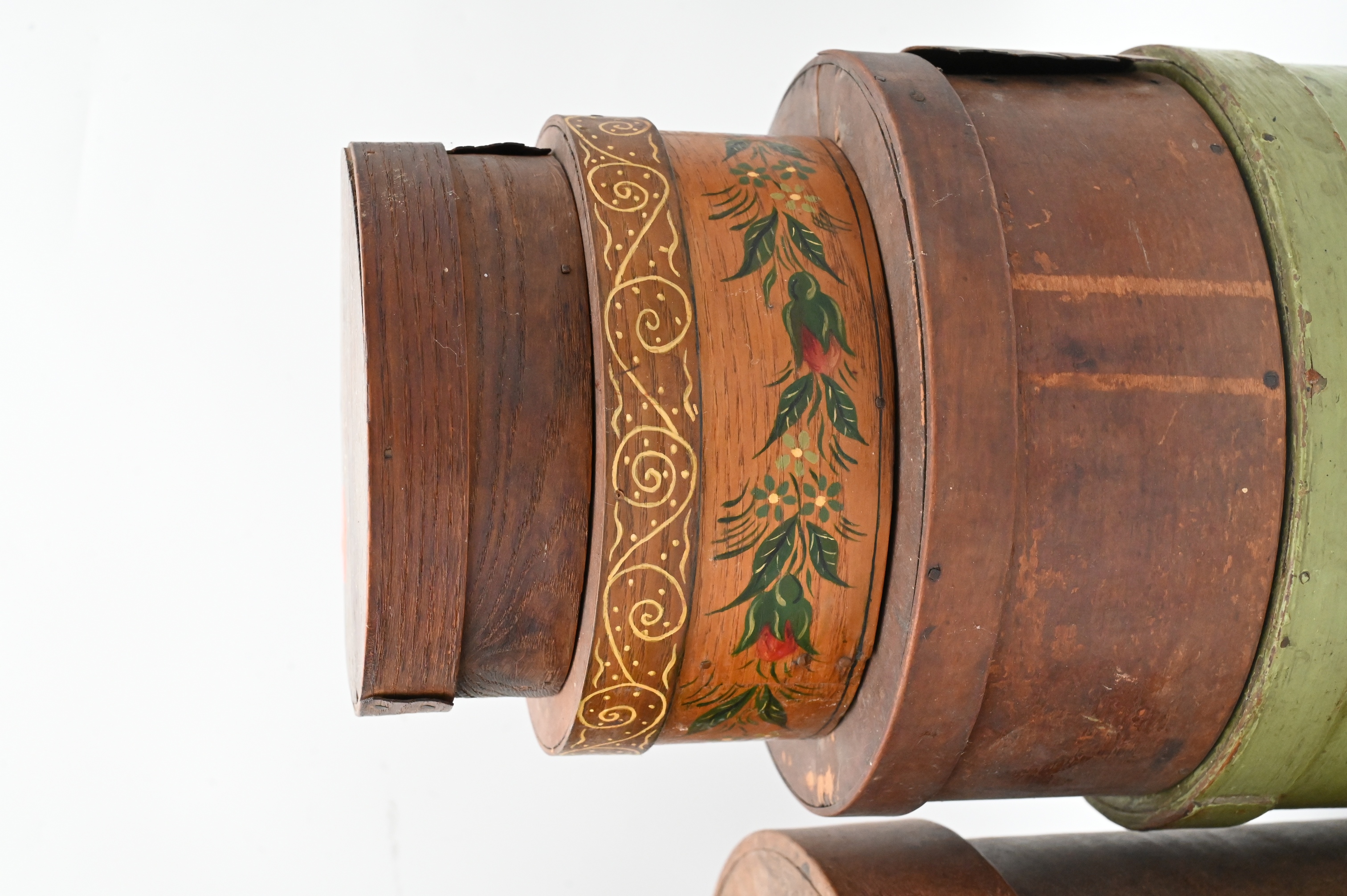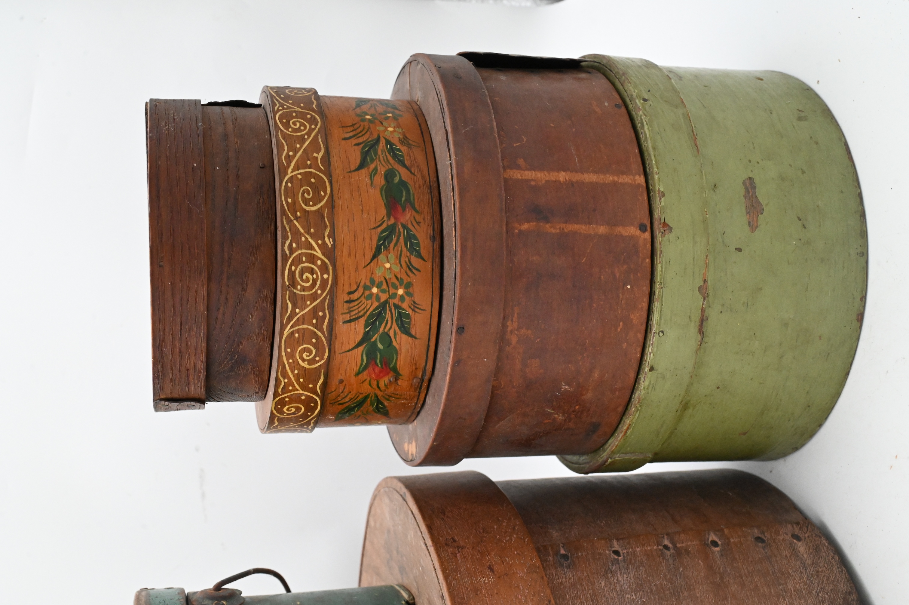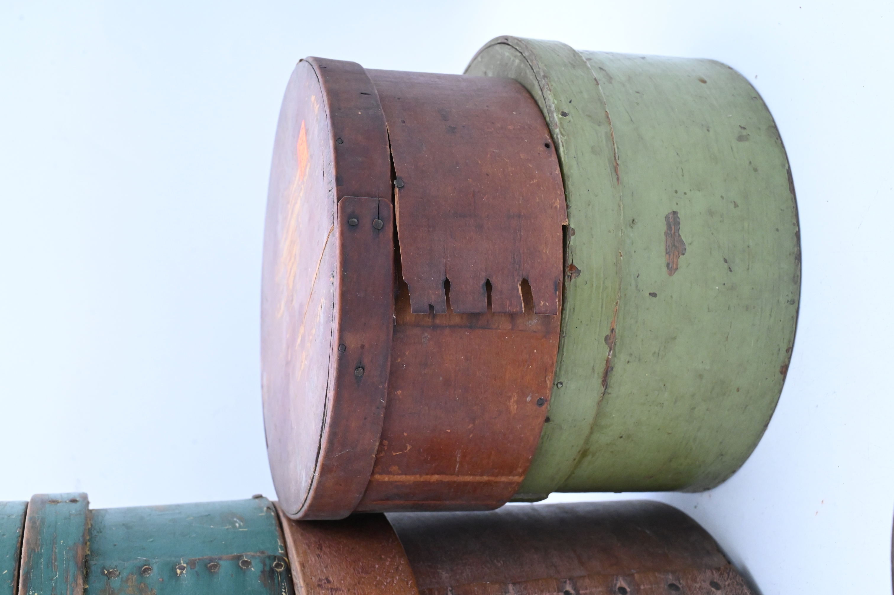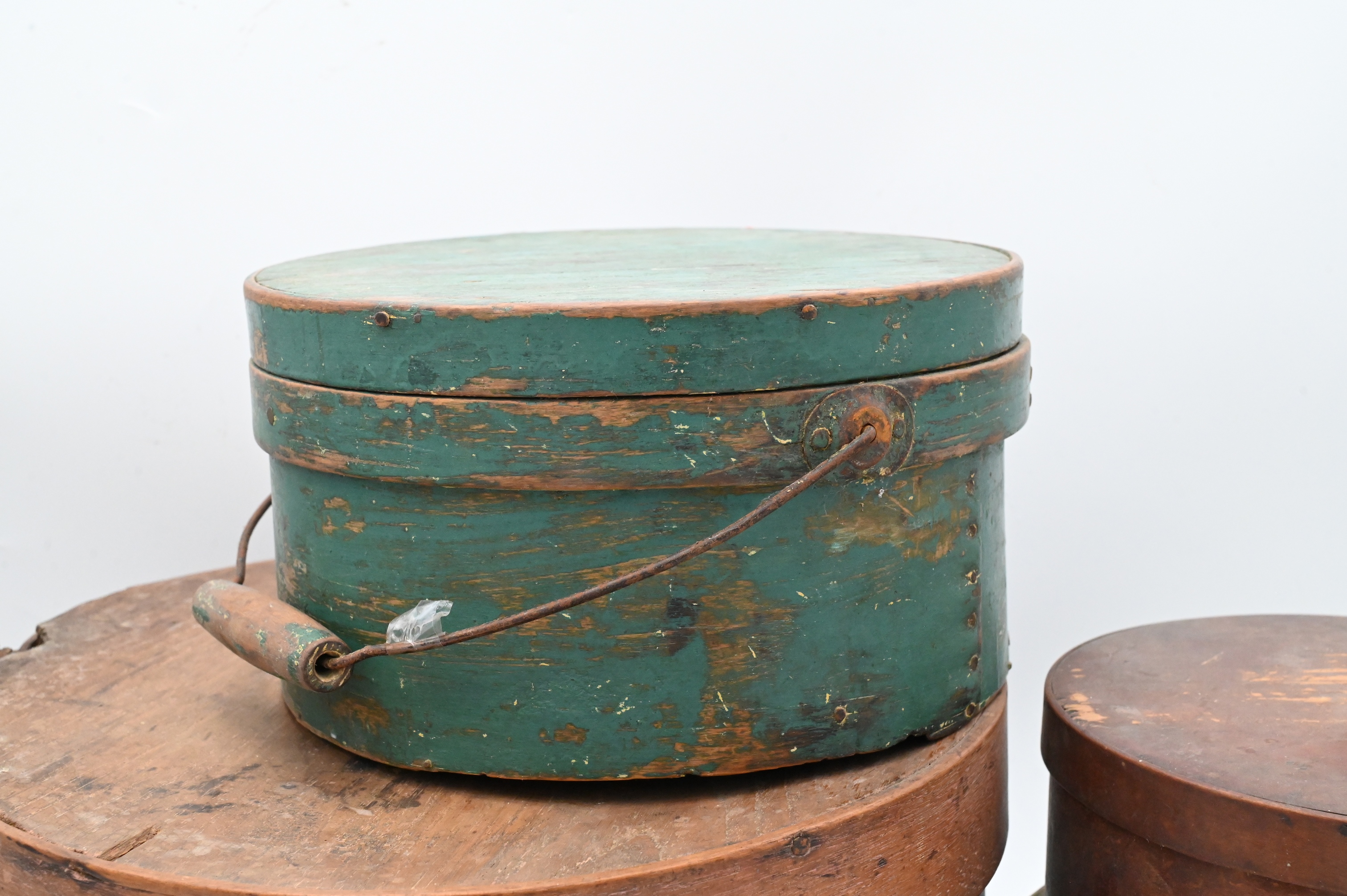 one green, one blue box with handle, one with floral design etc…, 19th century