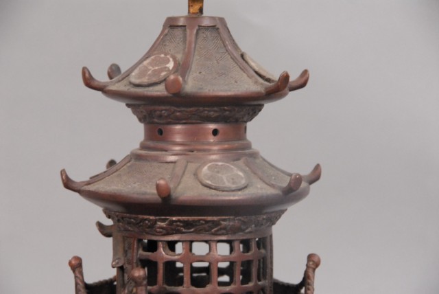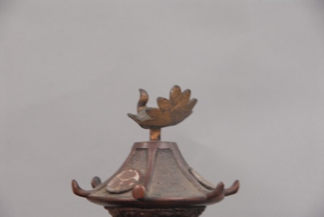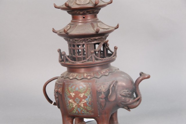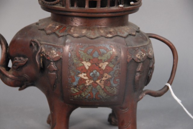 Small bronze champlev elephantee incense burner having champleve sides and seat surround forming up to a double roof gazebo incense burner.