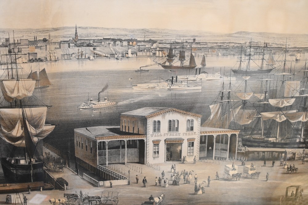 Smith Bros. & Company, view overlooking Wall Street Ferry and Brooklyn as seen from Trinity Church, circa 1850, lithograph, frame size 37 x 52 inches, paper size 31 x 46 inches.