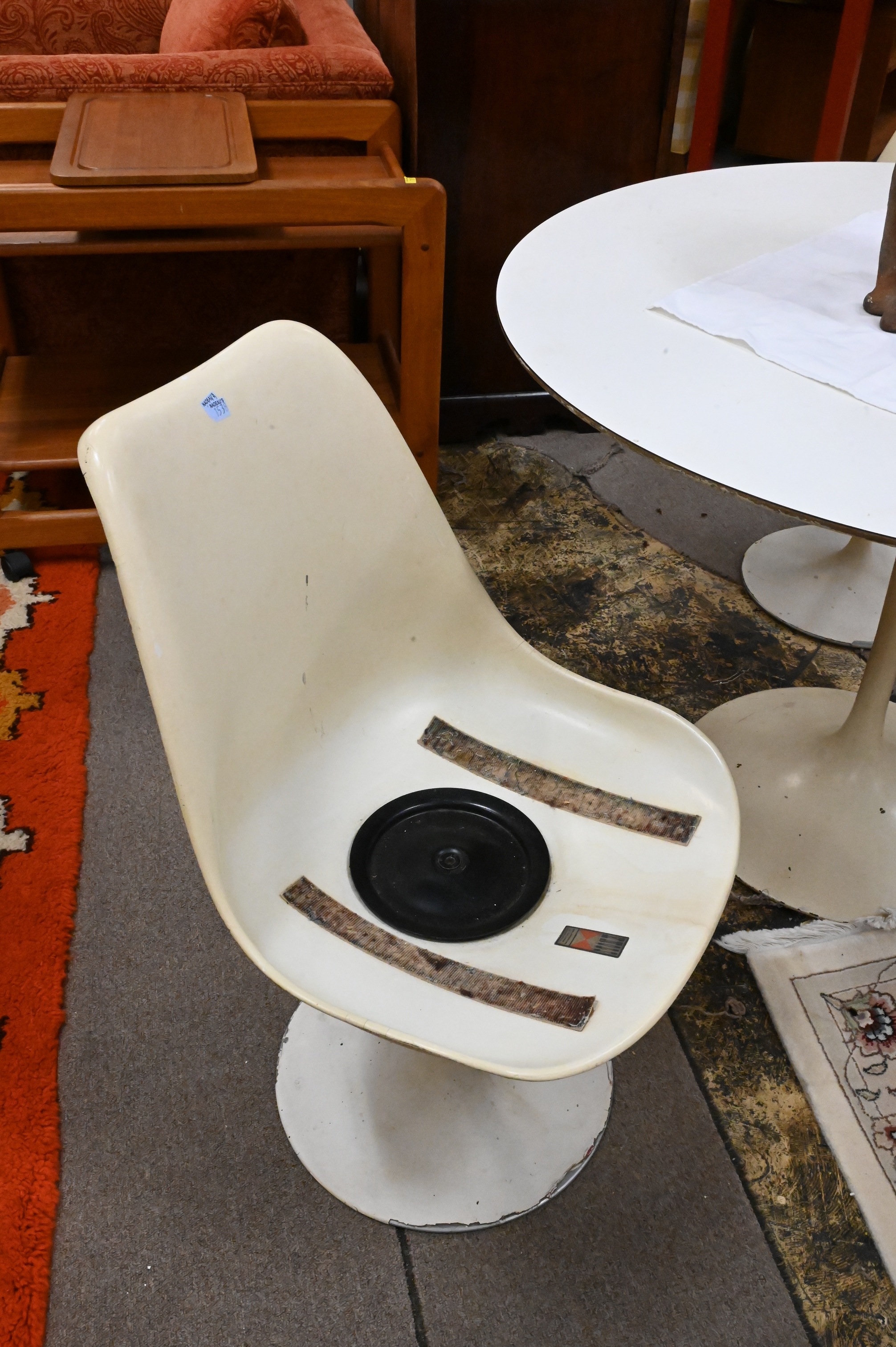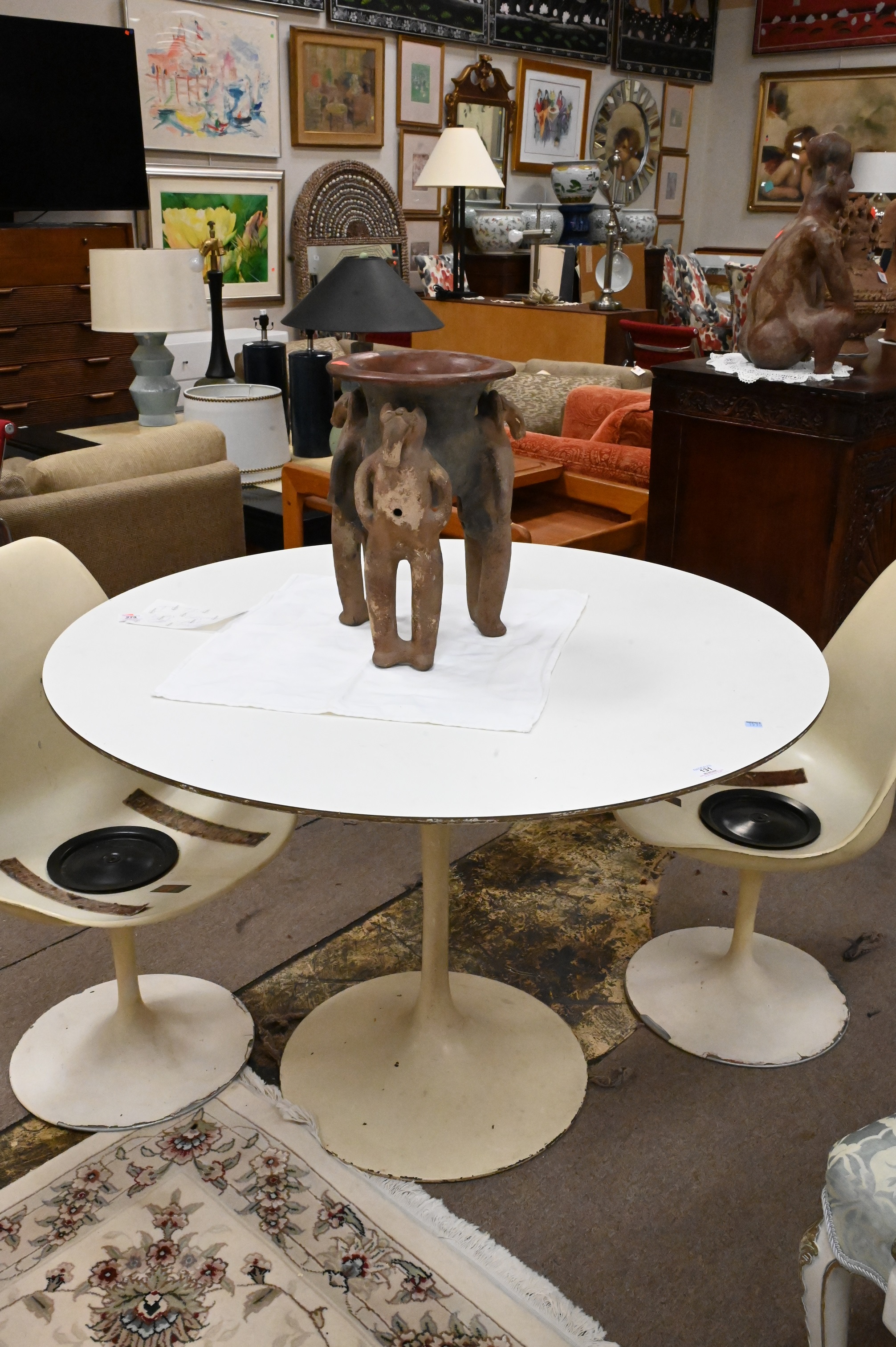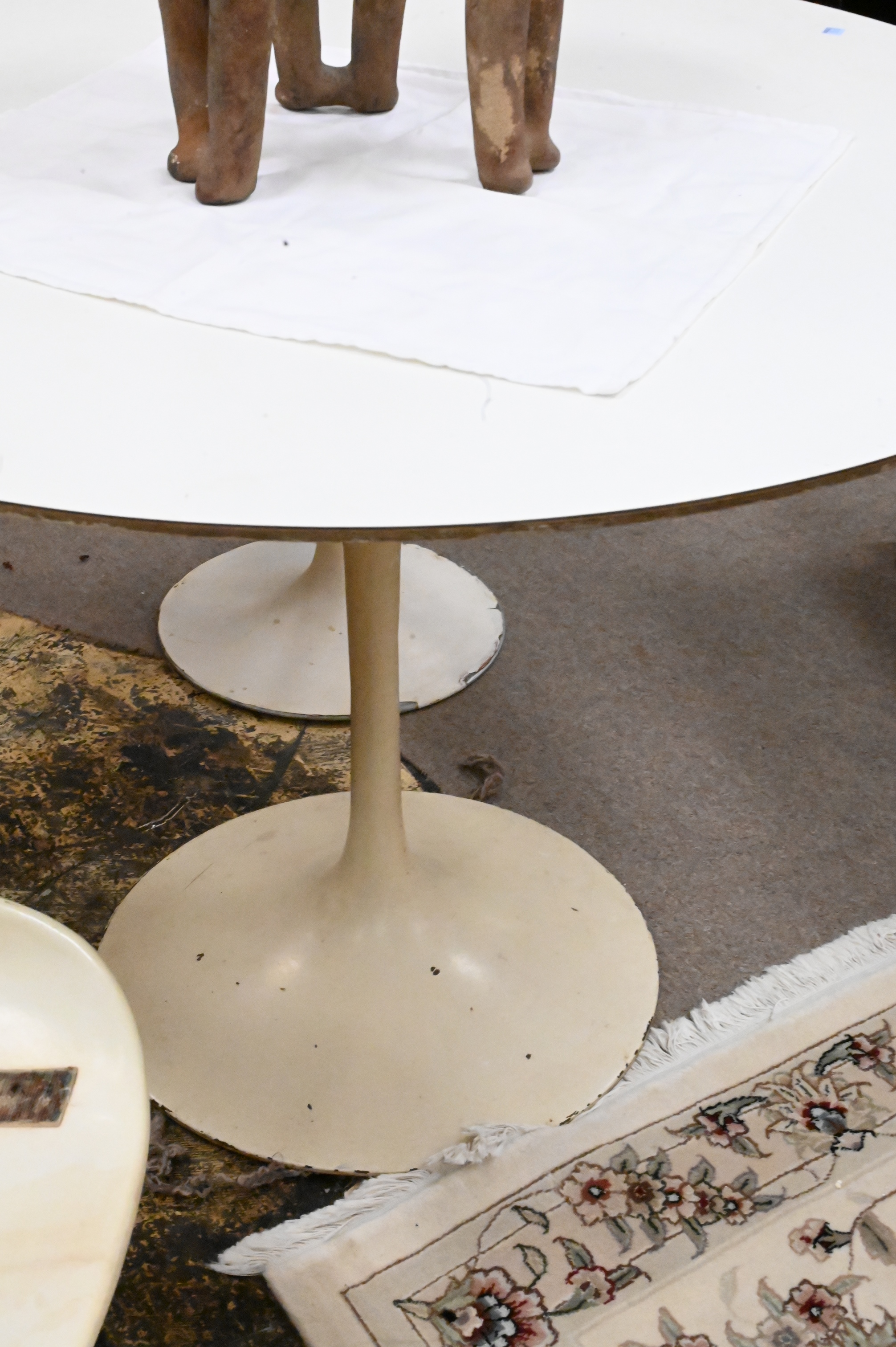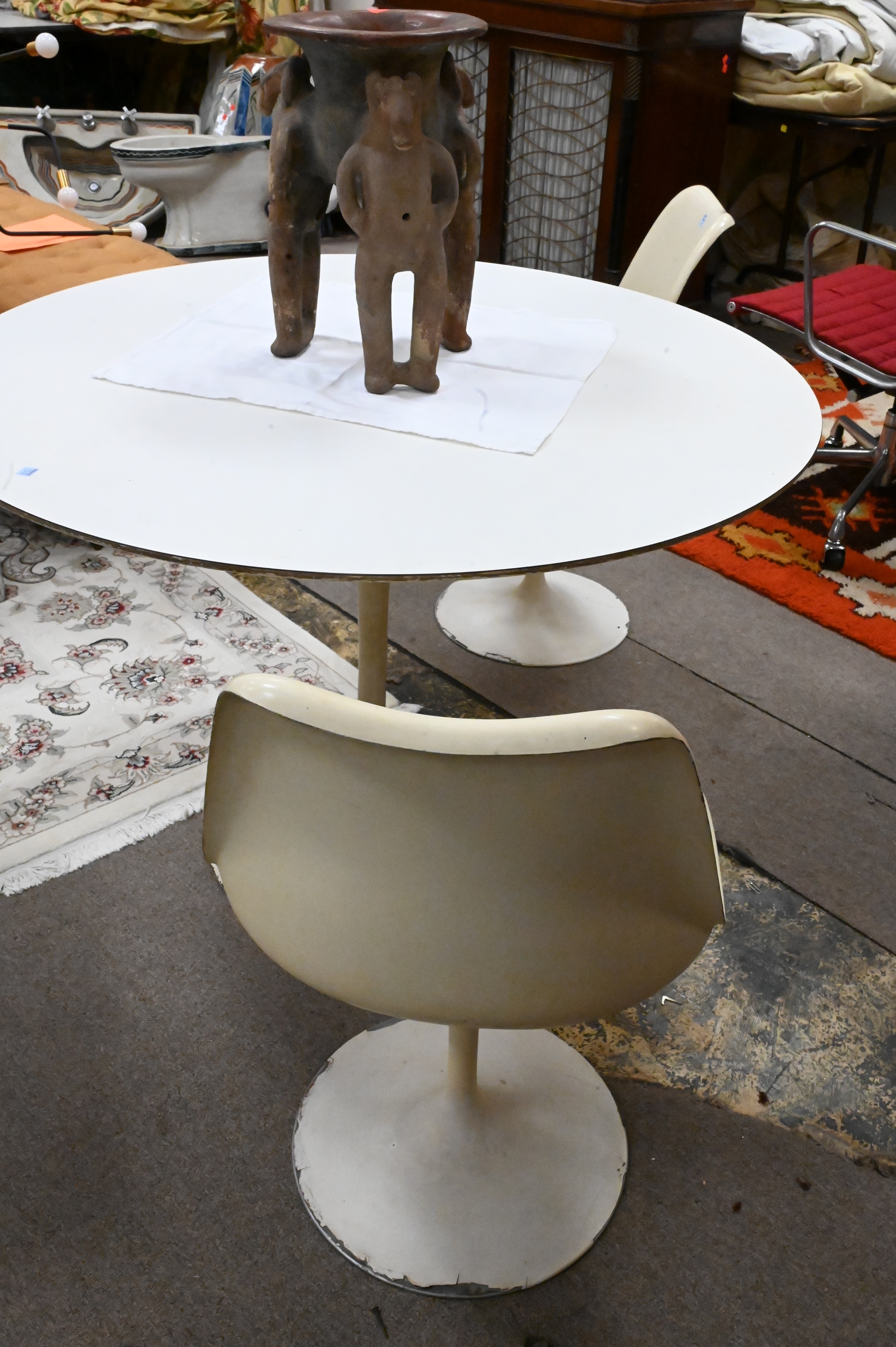 Three Piece Knoll Saarinen Dinner Set, to include tulip table and two chairs, no cushions, height 29 1/4 inches, diameter 42 inches.