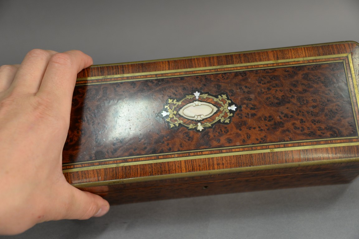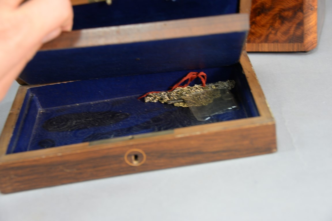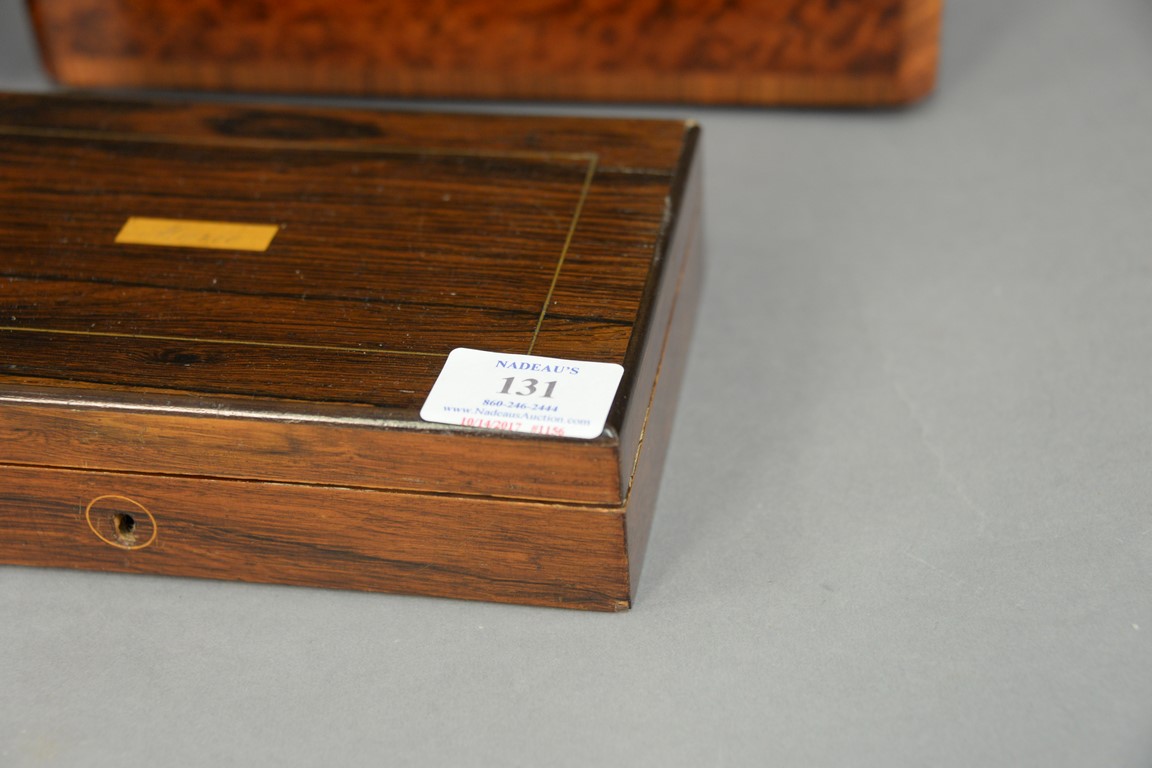 Lot 131: Three Rosewood and burlwood boxes to include brass inlaid glove box lg. 11 1/4in., Rosewood box with cloth interior lg. 9in., an…