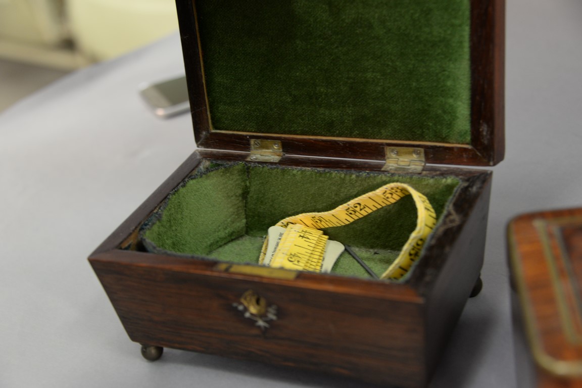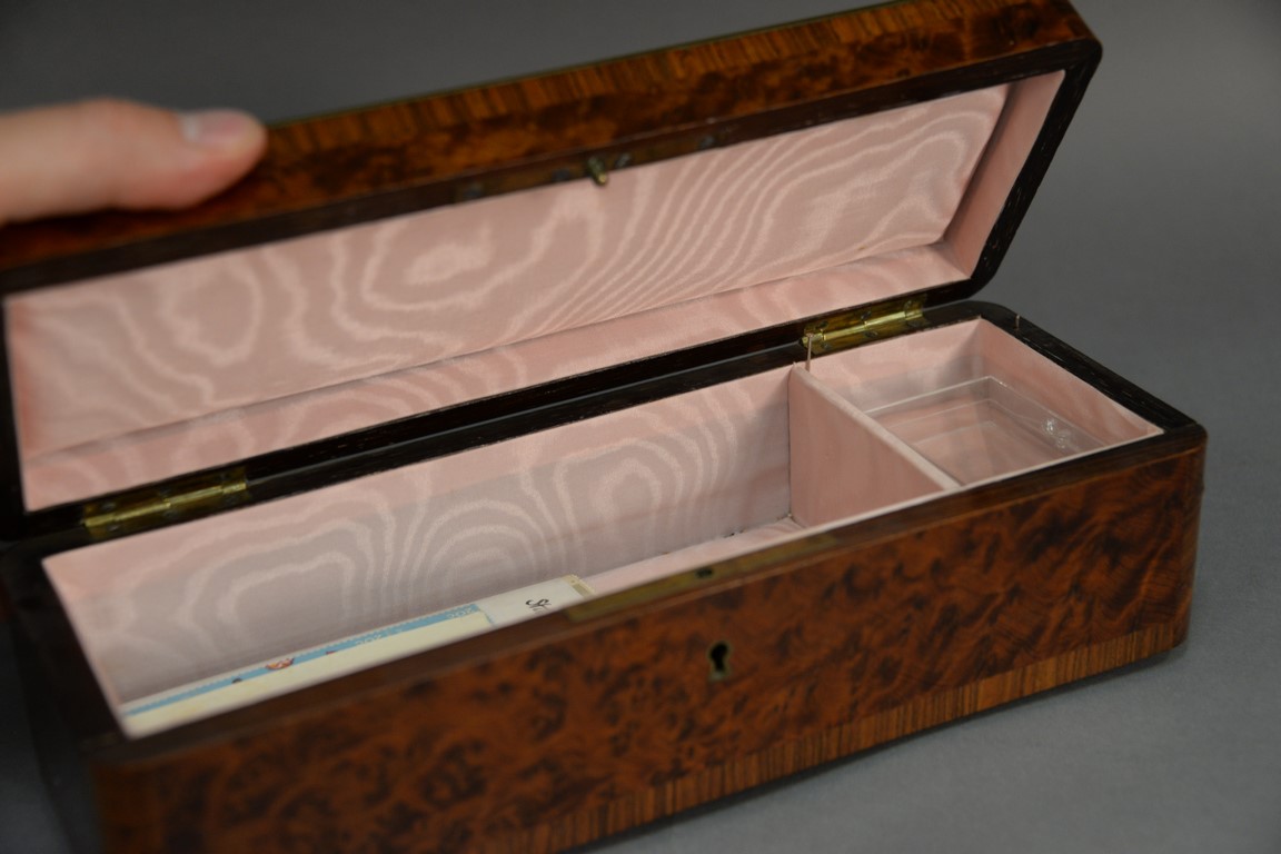 Three Rosewood and burlwood boxes to include brass inlaid glove box lg. 11 1/4in., Rosewood box with cloth interior lg. 9in., and a rosewood tea box, lined lg. 7 1/2in..