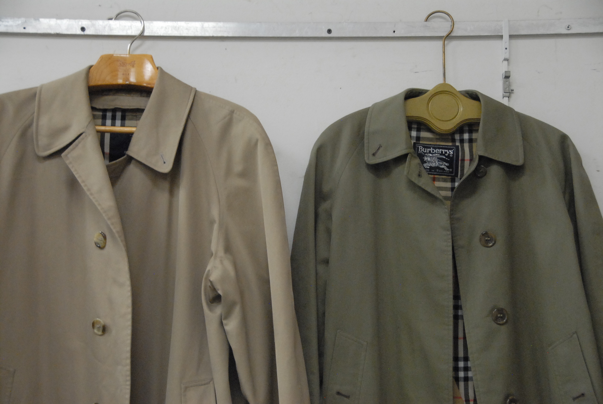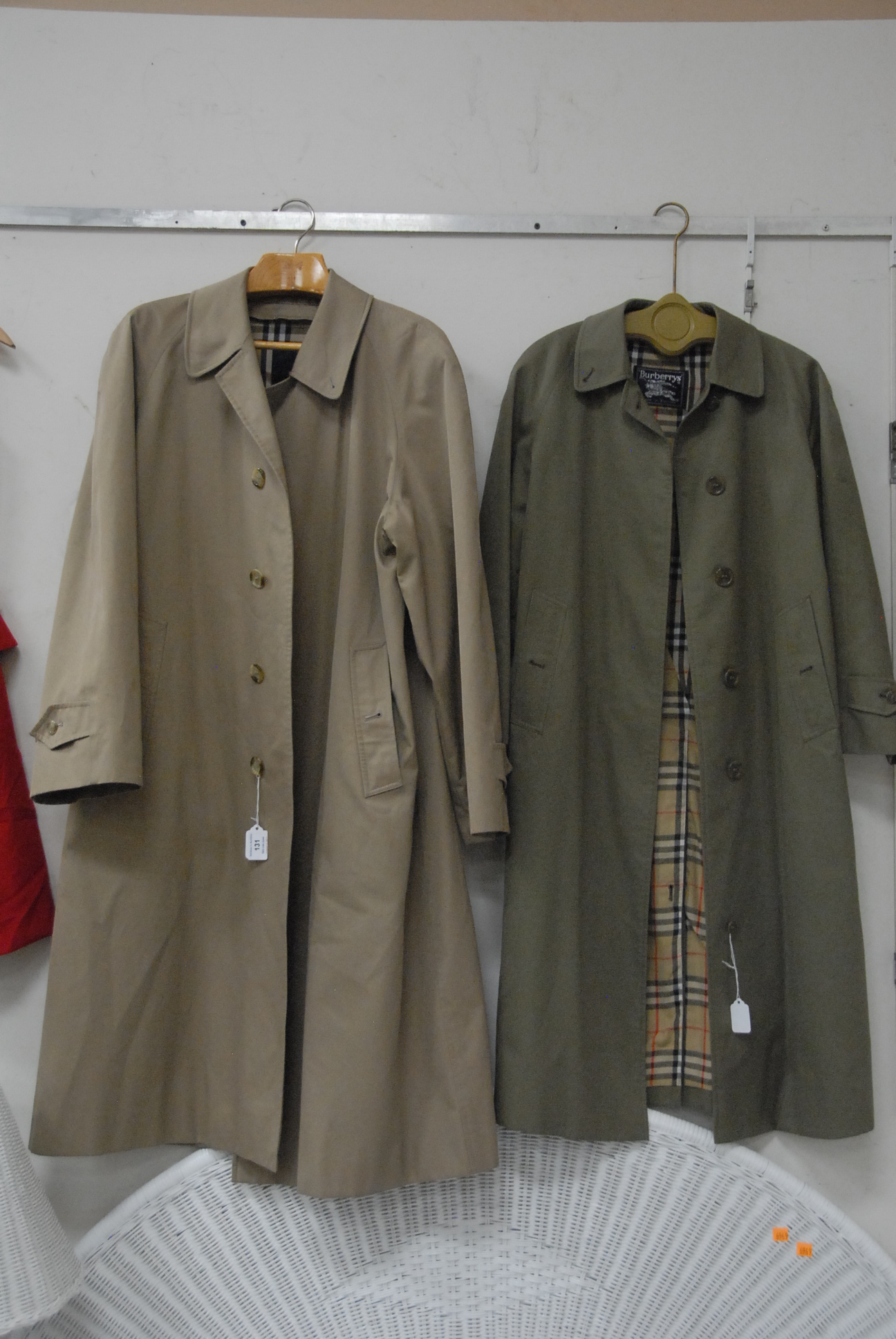 Two Burberry trench coats, olive green and tan, excellent condition.