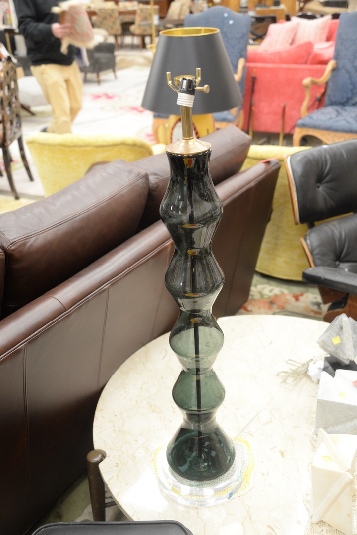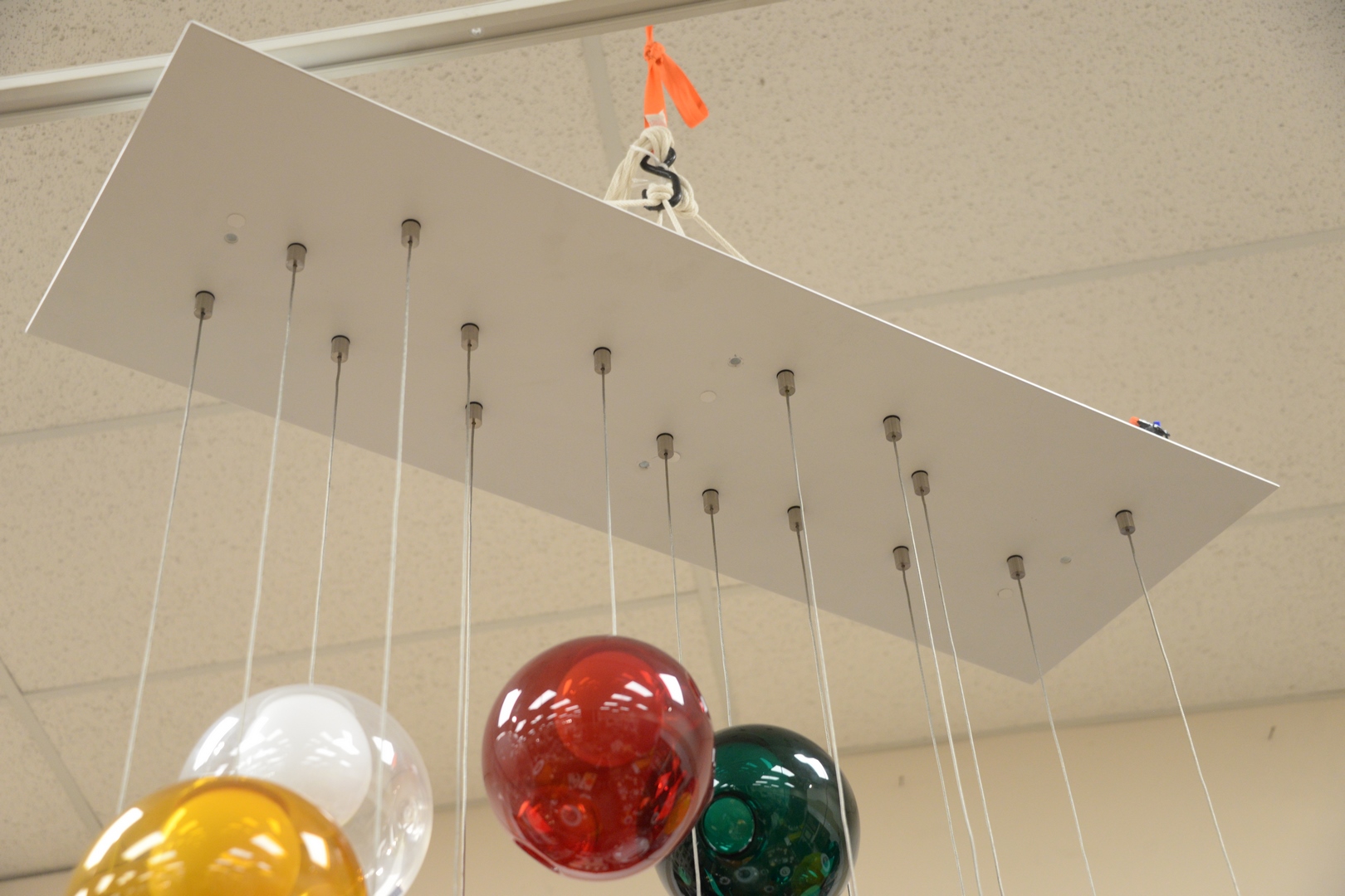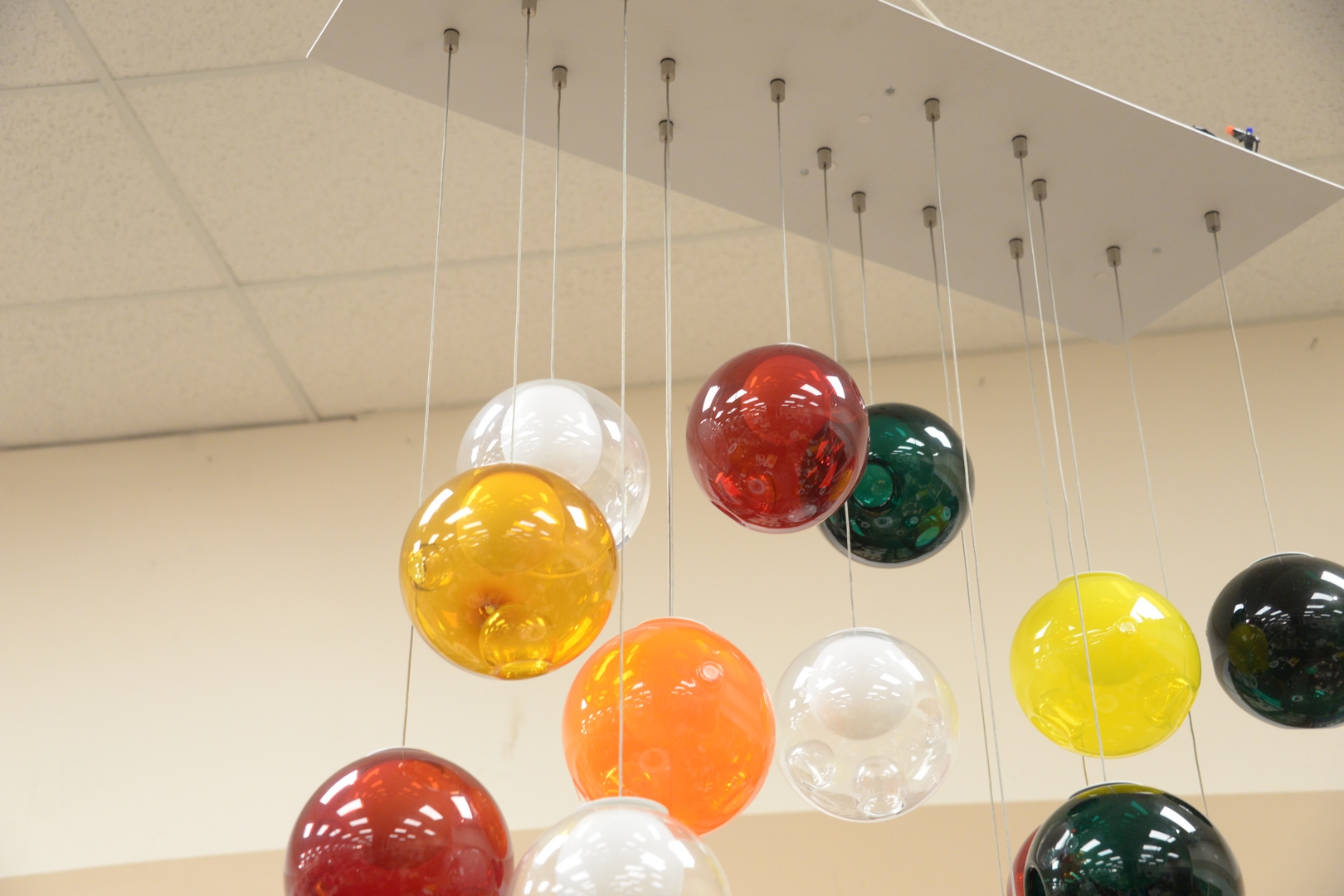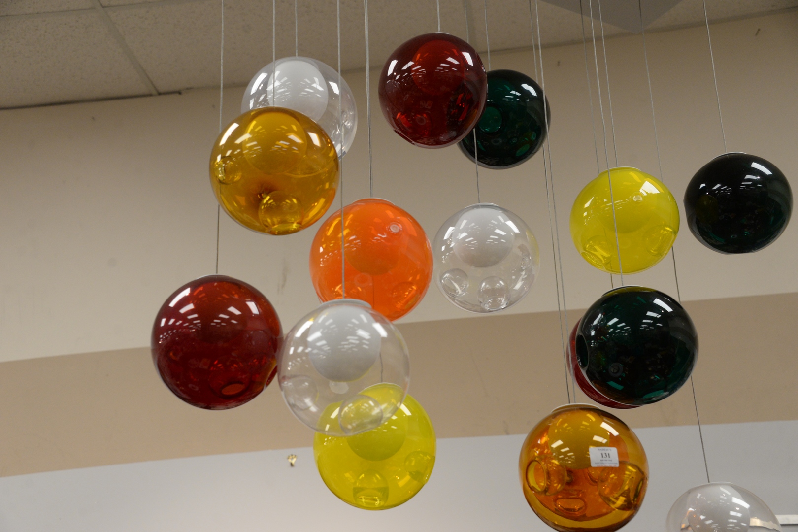 Lot 131: Two Piece Group, to include a contemporary hanging light having 16 art glass globular shades in assorted colors; along with an art glass table lamp, height 37 inches, height 42 inches, width 45 inches.