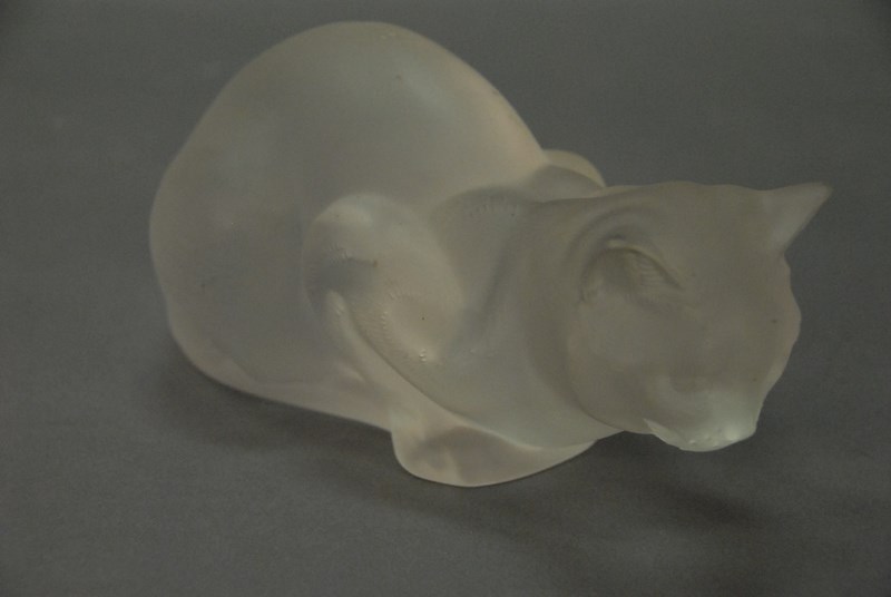 Lot 132: A Lalique molded and frosted glass figure, Chat Couche, depicting a crouching cat, etched in script Lalique France. lg. 9 1/2in.