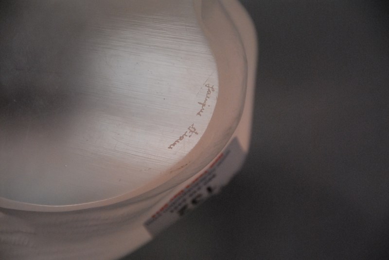 A Lalique molded and frosted glass figure, Chat Couche, depicting a crouching cat, etched in script Lalique France. lg. 9 1/2in.