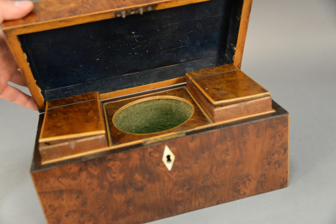 Burlwood and inlaid tea caddy box. ht. 6in., lg. 12in.