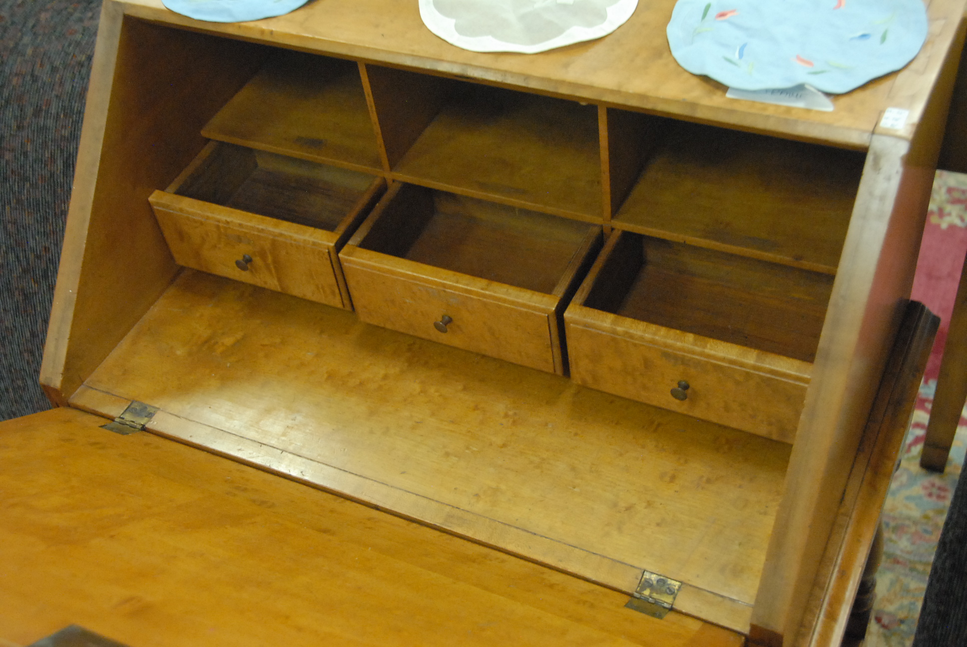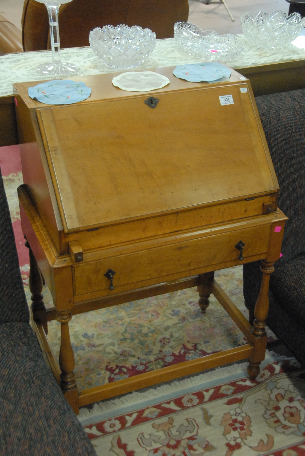 Custom figured maple desk on frame, ht. 37in. wd. 26 in. dp. 16 in.