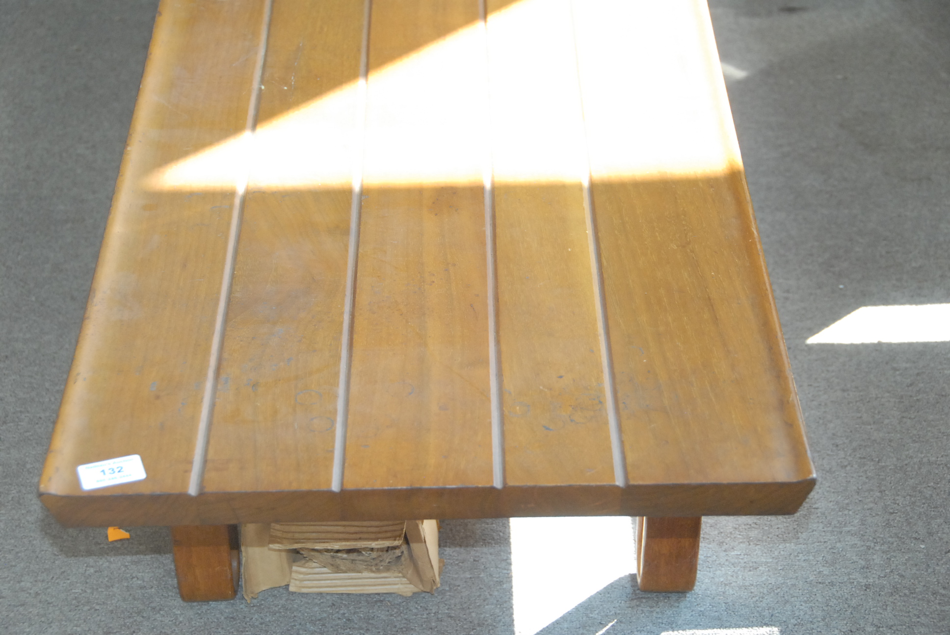 Edward Wormley for Dunbar ‘Long John’ 6 foot coffee table having a solid walnut, grooved plank top set on four bent and laminated hair pin legs, ht. 11 1/2, lg. 72, wd. 19.