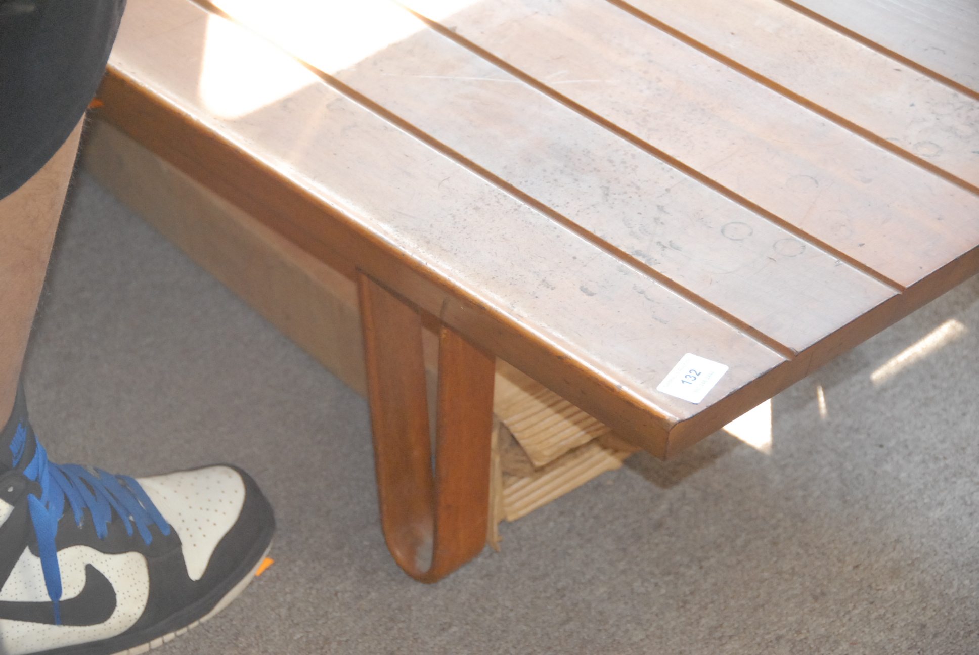 Lot 132: Edward Wormley for Dunbar ‘Long John’ 6 foot coffee table having a solid walnut, grooved plank top set on four bent and laminated ha…