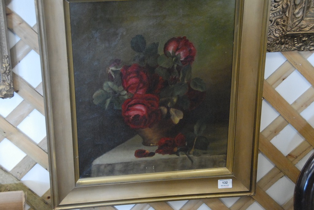 Five piece lot, three still life oil paintings, needlework, and bird print.