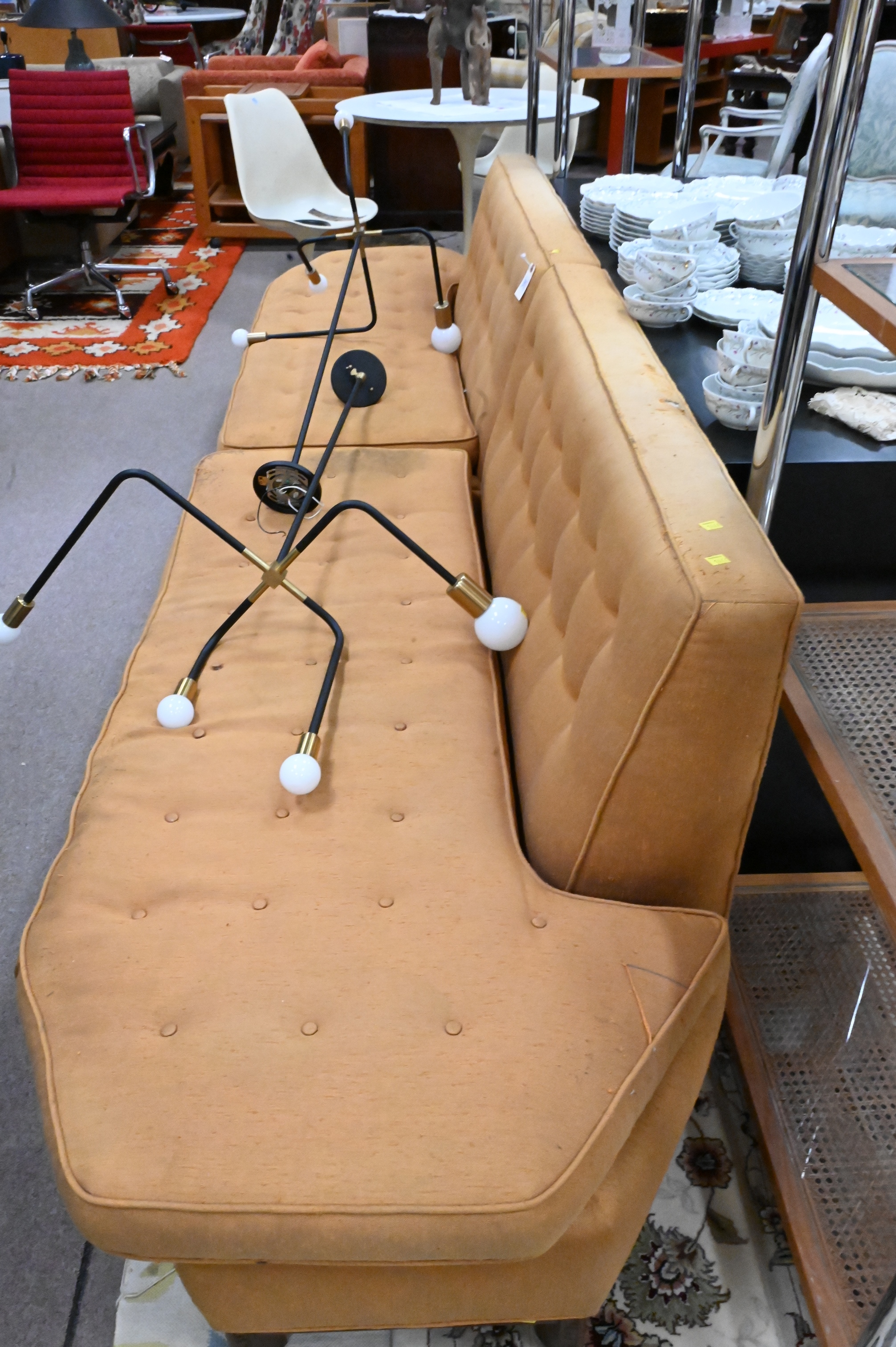 Frank Lloyd Wright Two Part Sectional Sofa by Henredon, fabric needs cleaning, height 30 inches, length 64 inches.